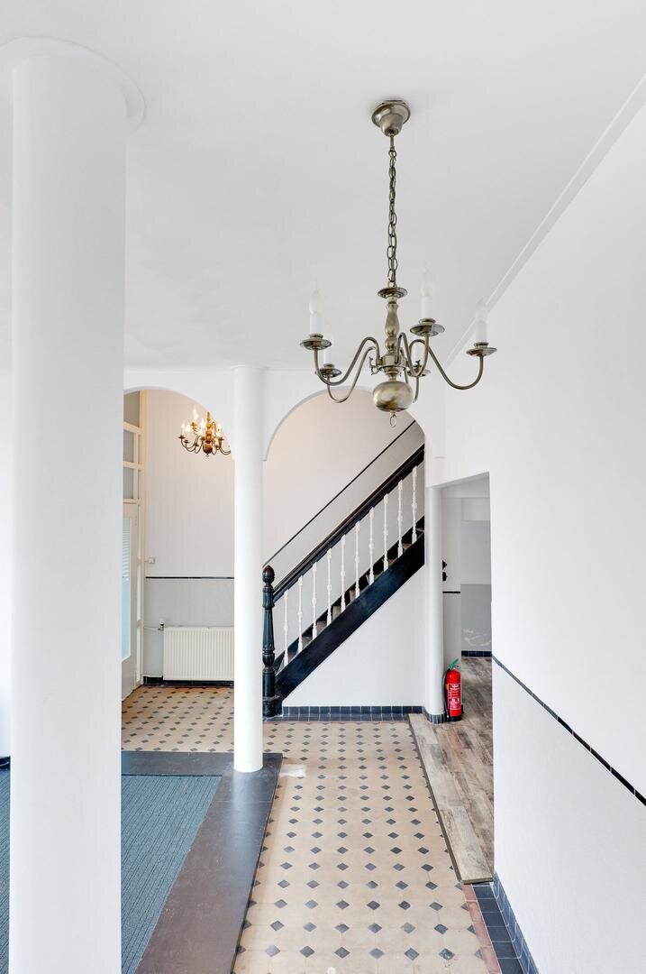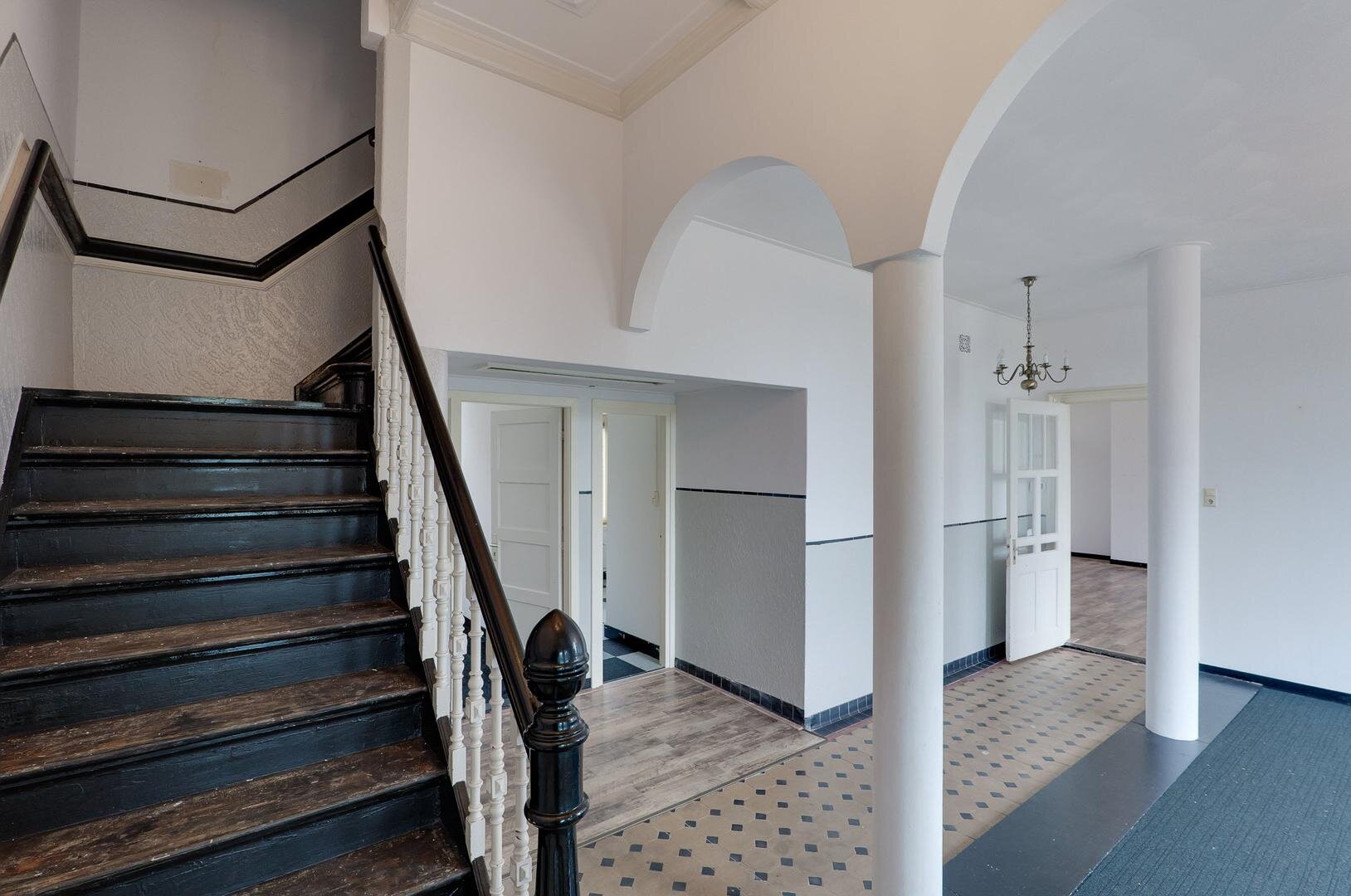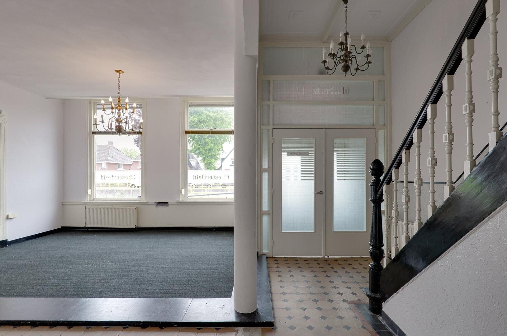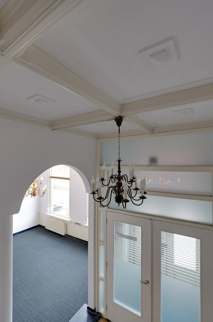 Ruime entree met ontvangst-/wachtruimte, 5 kantoorruimtes, keuken, 2 toiletten, berging en kluisruimte die tegenwoordig dienst doet als server/ printer ruimte. De monumentale trap brengt je naar de 1e verdieping