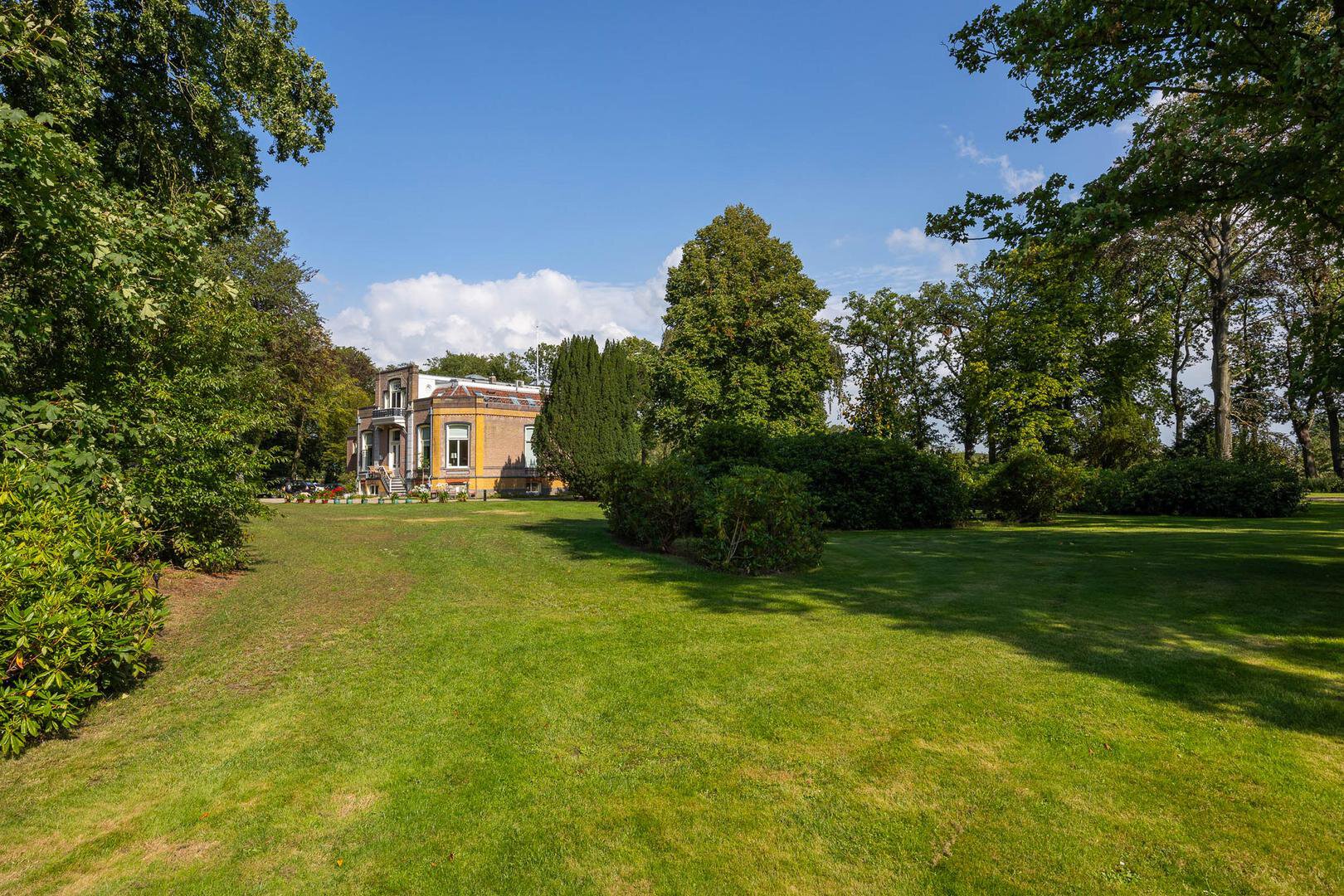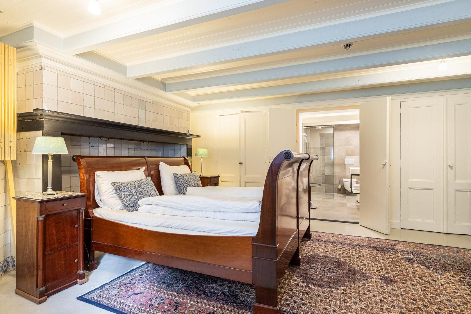 Aan de achterzijde leidt een bordestrap naar het grote terras in de tuin, een heerlijke plek om te ontbijten in de zon. Het perceel is 5,5 hectare groot en grenst aan het Vegelinbos en een grote zwemvijver. Plannen liggen klaar om het koetshuis te transformeren tot nieuwe B&B-suites.