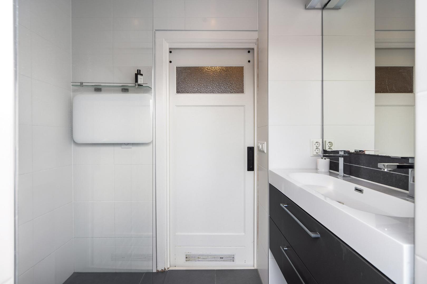 Eerste verdieping: overloop, drie slaapkamers, badkamer met douche en dubbele wastafel, toegang tot droogplat.