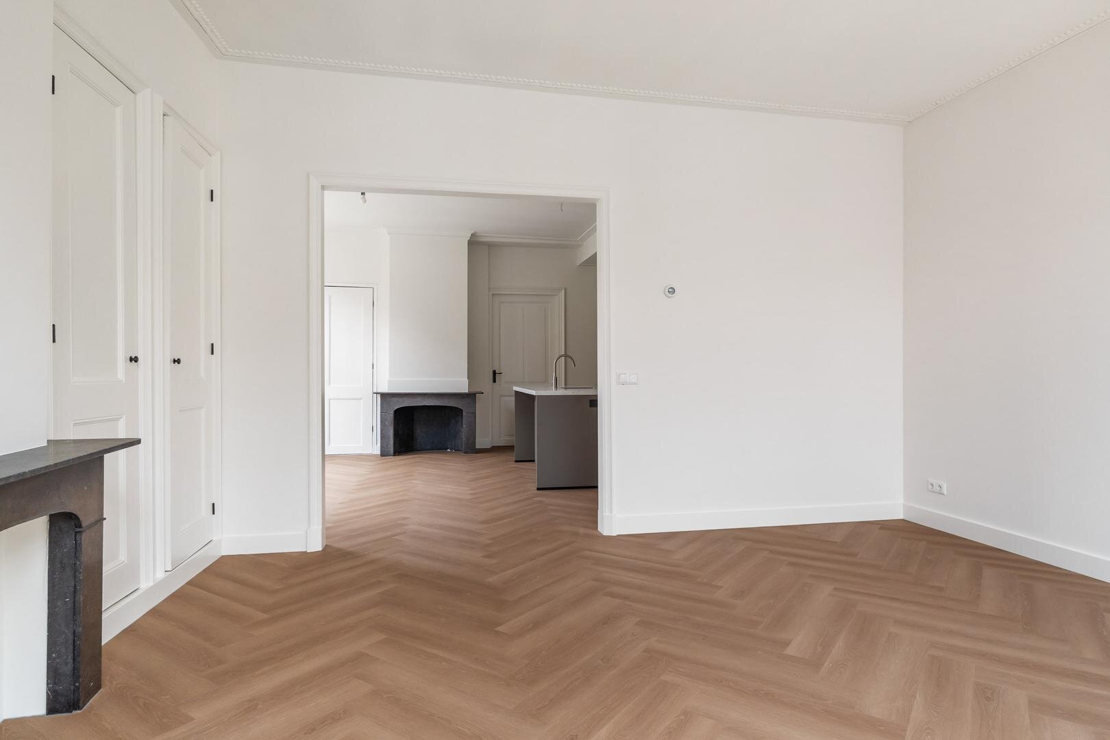 Het appartement op de eerste verdieping is volledig instapklaar en tot in detail afgewerkt. Je loopt over een stijlvolle visgraatvloer die door het hele appartement is doorgelegd. De ruime hal geeft toegang tot alle vertrekken, waaronder de luxe woonkeuken, de lichte woonkamer met uitzicht op de Bagijnestraat, twee slaapkamers en een praktische berging met wasmachine aansluiting. Eén van de slaapkamers biedt directe toegang tot het zonnige balkon van bijna zeven vierkante meter.