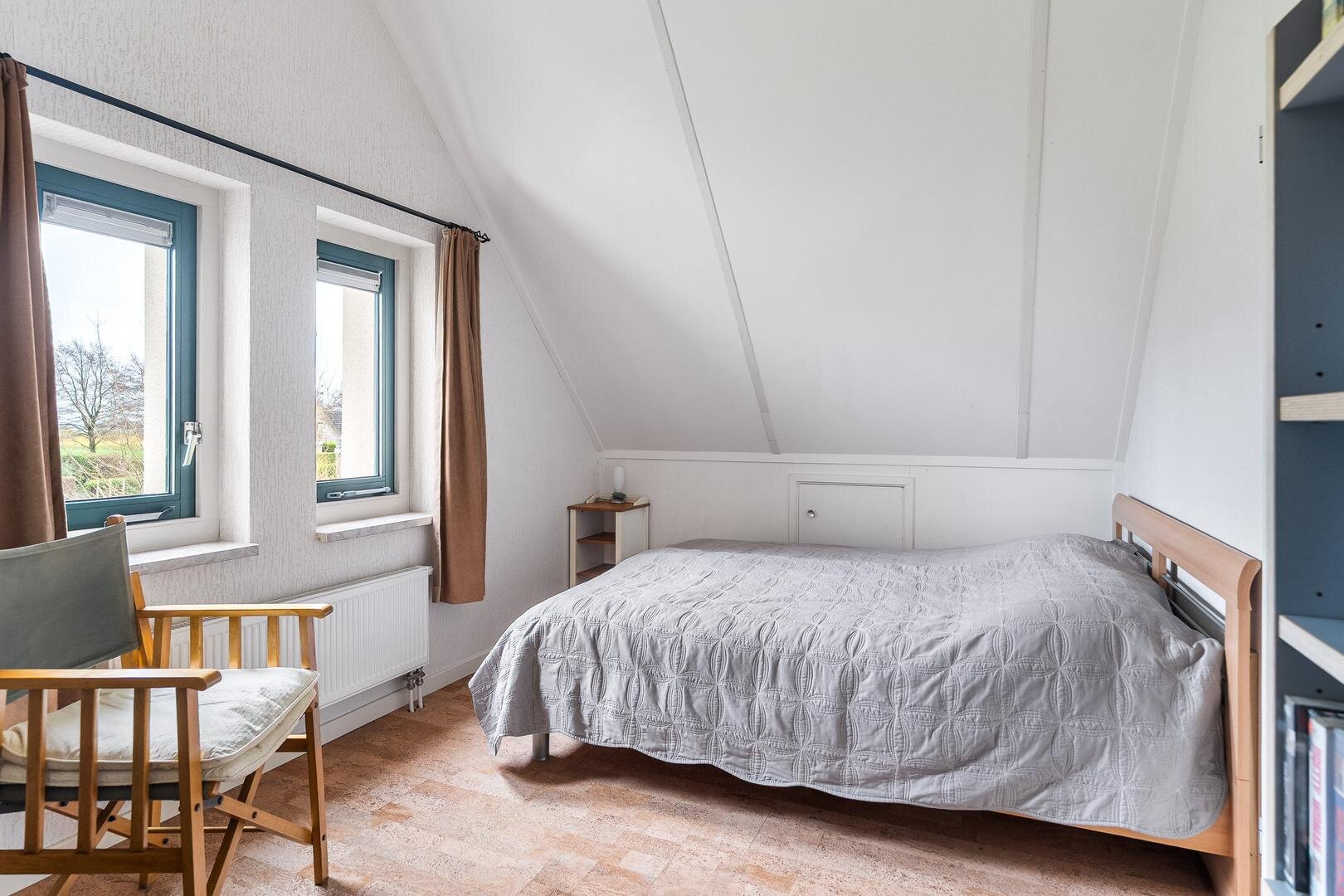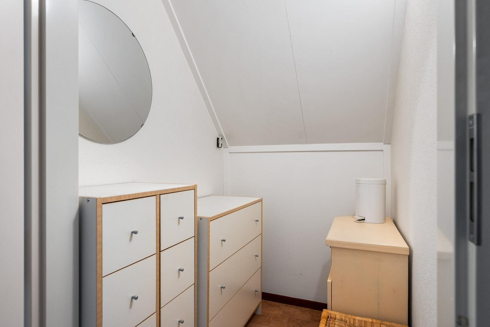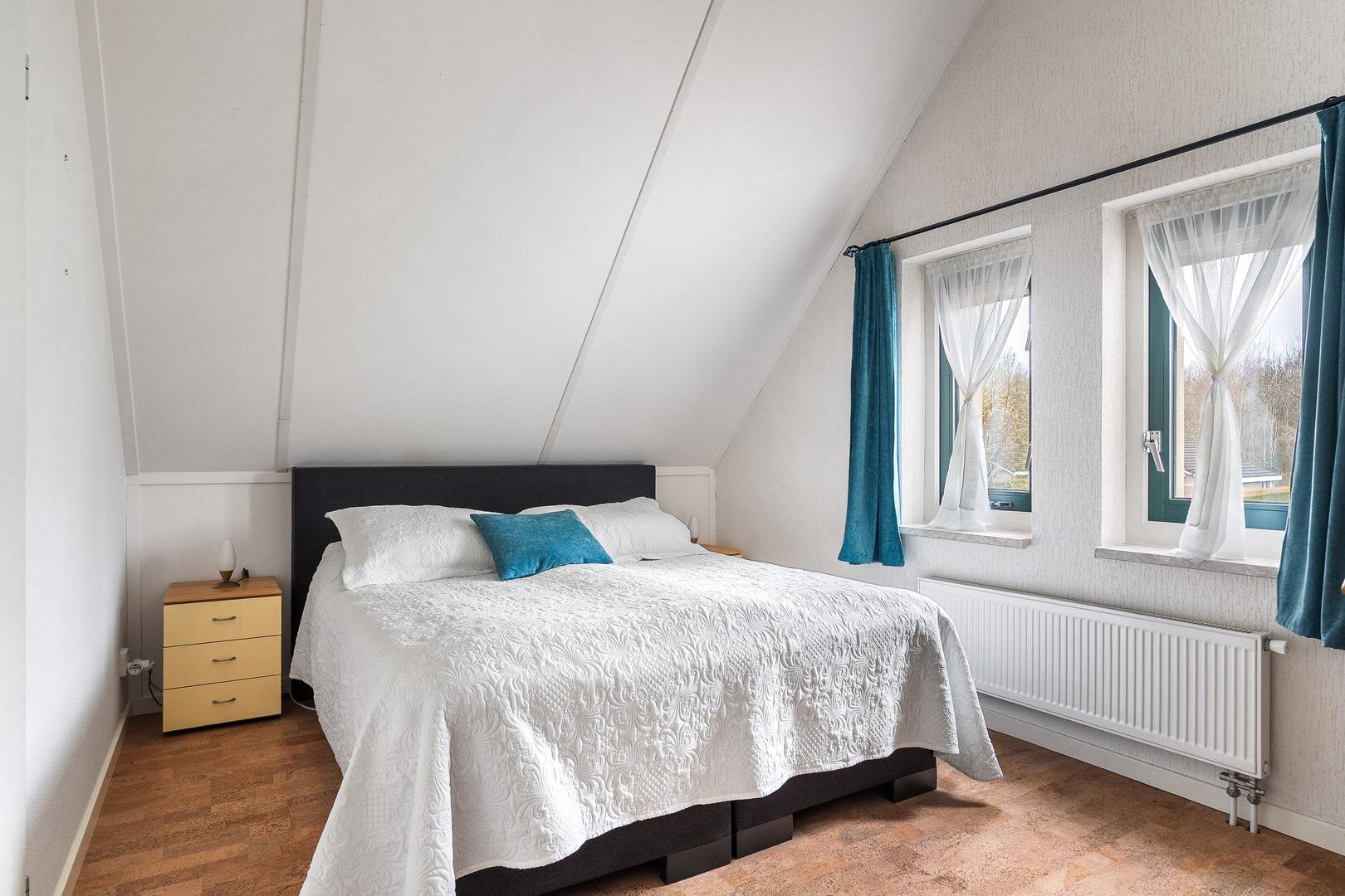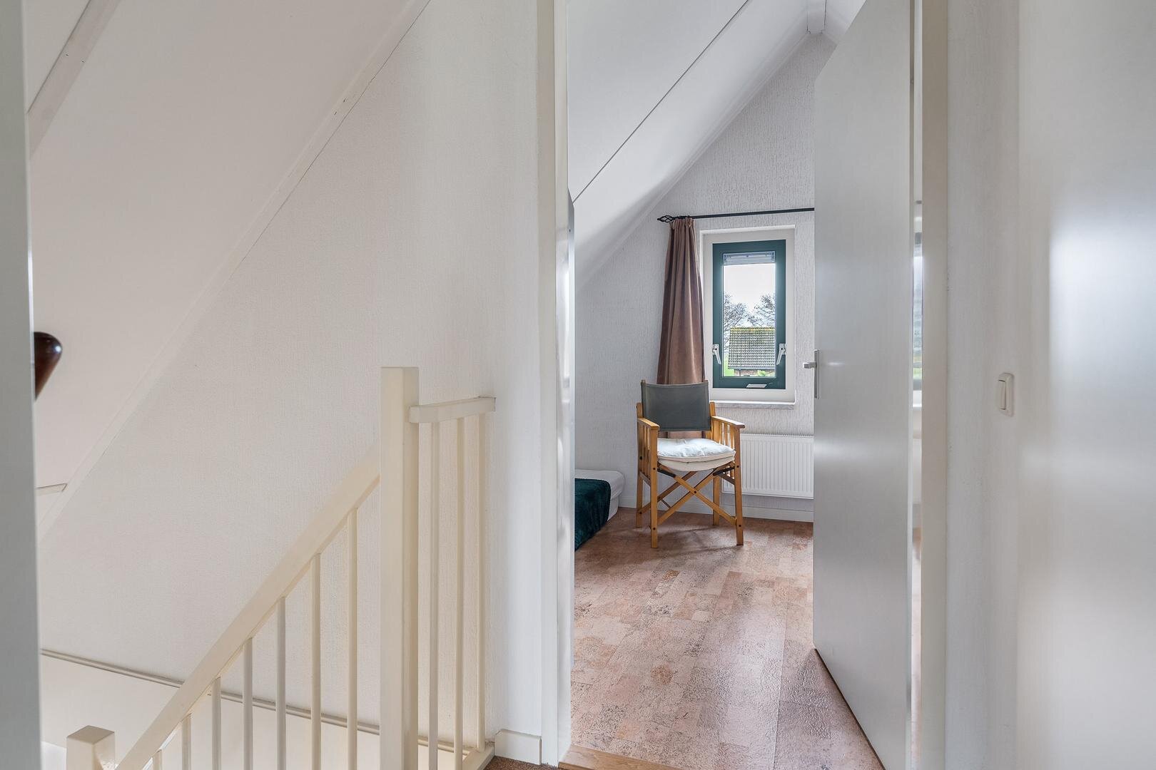 Via de vaste trap bereik je de overloop op de verdieping. Hier bevinden zich twee slaapkamers en een extra kleedkamer. Dankzij de dakramen komt er prettig daglicht binnen en zijn de ruimtes goed te ventileren.