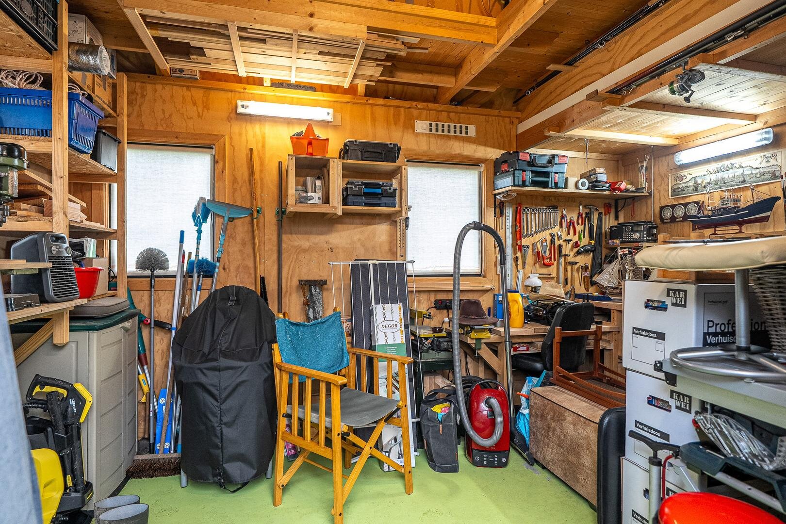 Daarnaast beschikt de woning over een aangebouwde houten berging voorzien van elektra, ideaal voor het opbergen van fietsen, tuinmeubilair of gereedschap. Parkeren kan op eigen terrein.