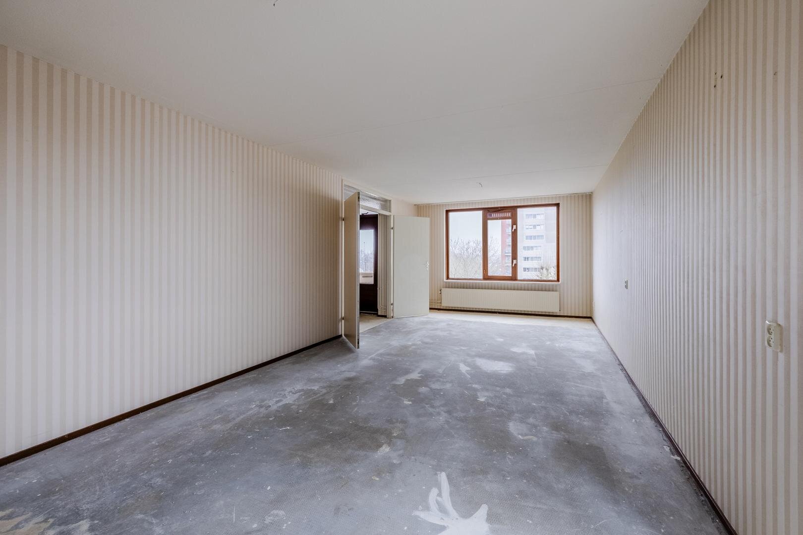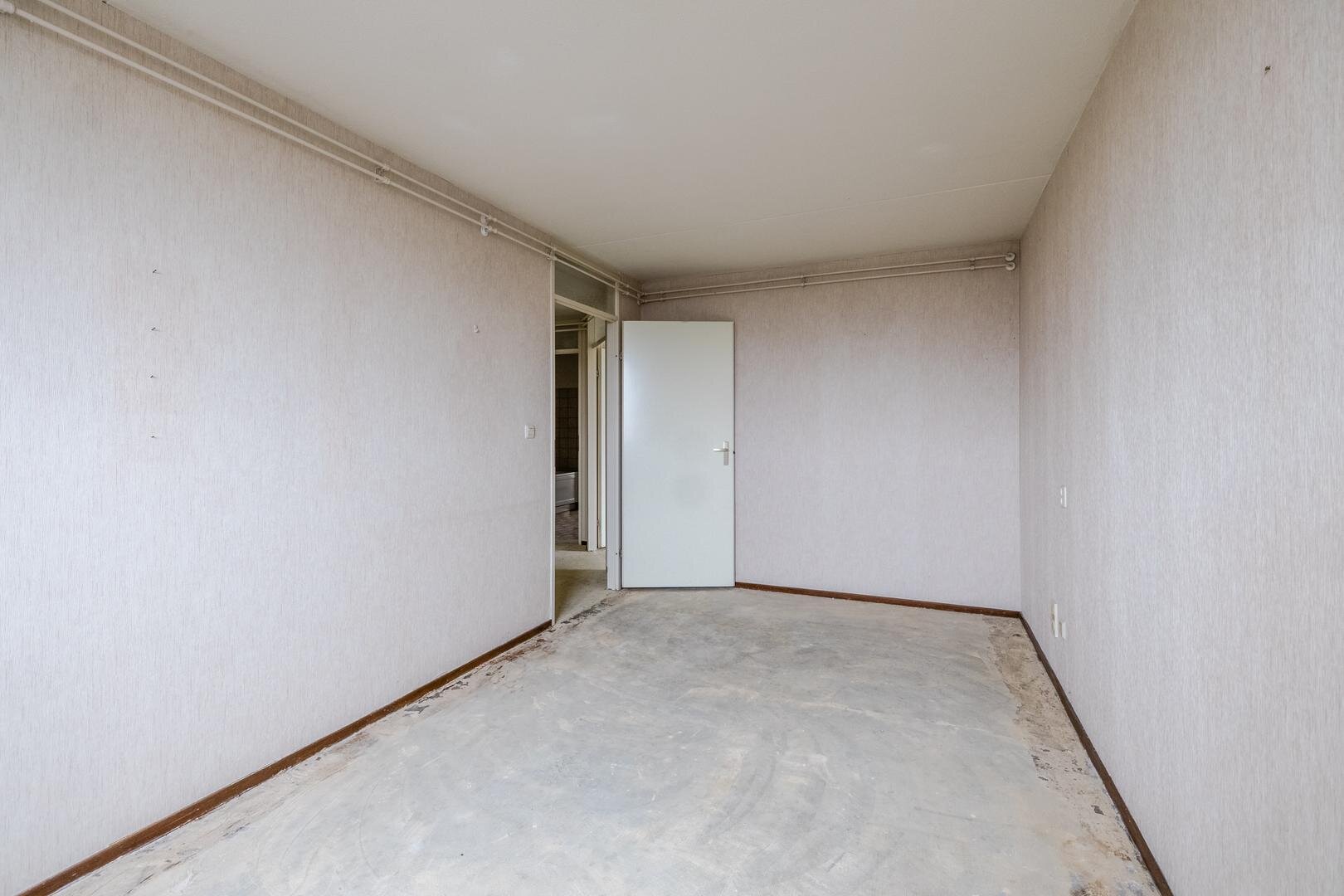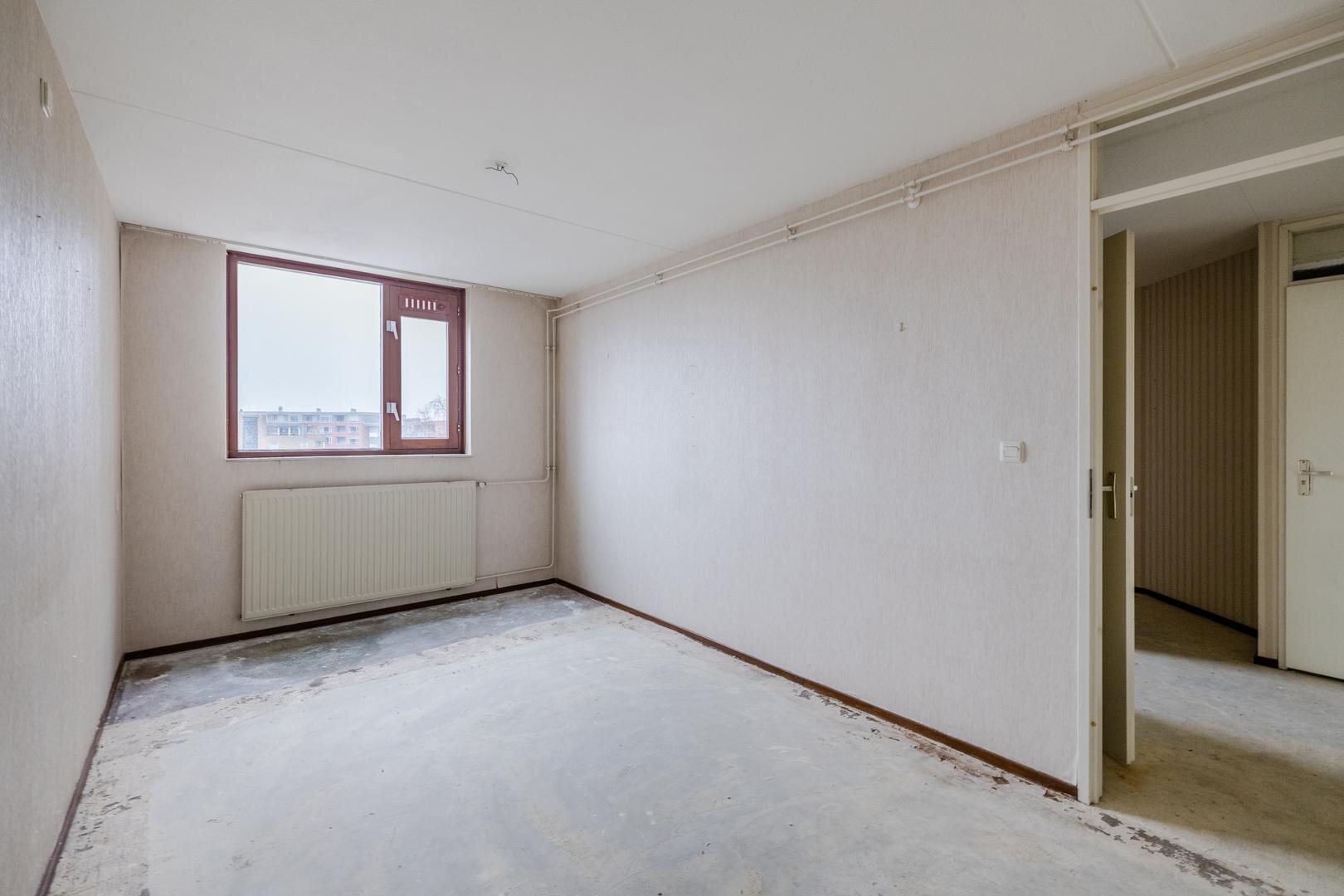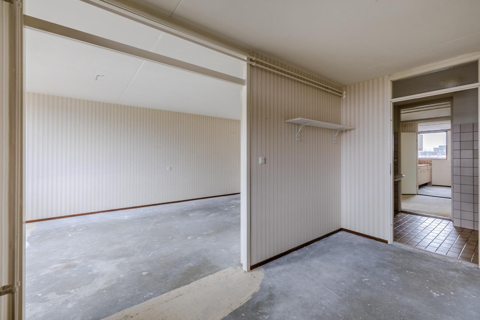 Dit appartement is gelegen op de vierde verdieping. Via de centrale entree kom je binnen in de hal van het appartement. Hier bevinden zich een apart toilet, een handige vaste kast en de toegang tot de gesloten keuken. De keuken is praktisch ingericht met een rechte opstelling met inbouwapparatuur. Het appartement beschikt over twee slaapkamers, waardoor er ruimte is voor zowel een hoofdslaapkamer als een logeer- of werkkamer. De voorste slaapkamer heeft 2 deuren naar de aangrenzende woonkamer zodat deze eventueel ook als bijv. eetkamer gebruikt kan worden. De badkamer is voorzien van een ligbad waar je ook ik kan douchen, een wastafel en een aansluiting voor de wasmachine.