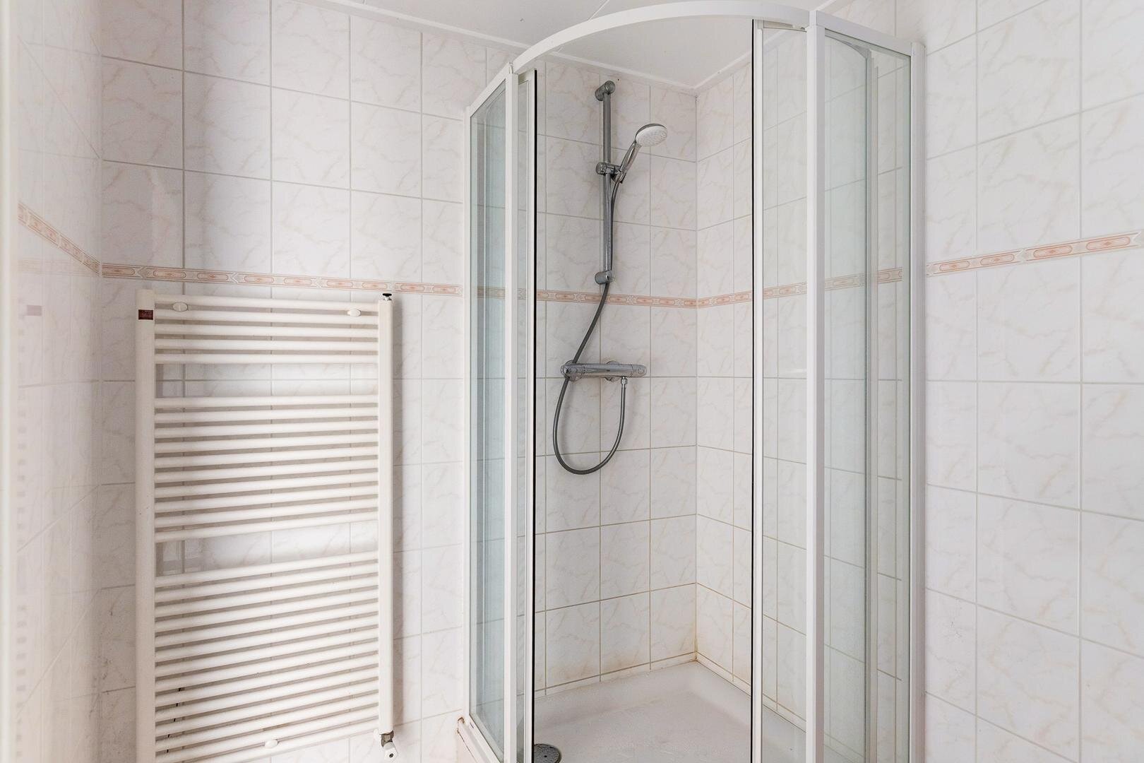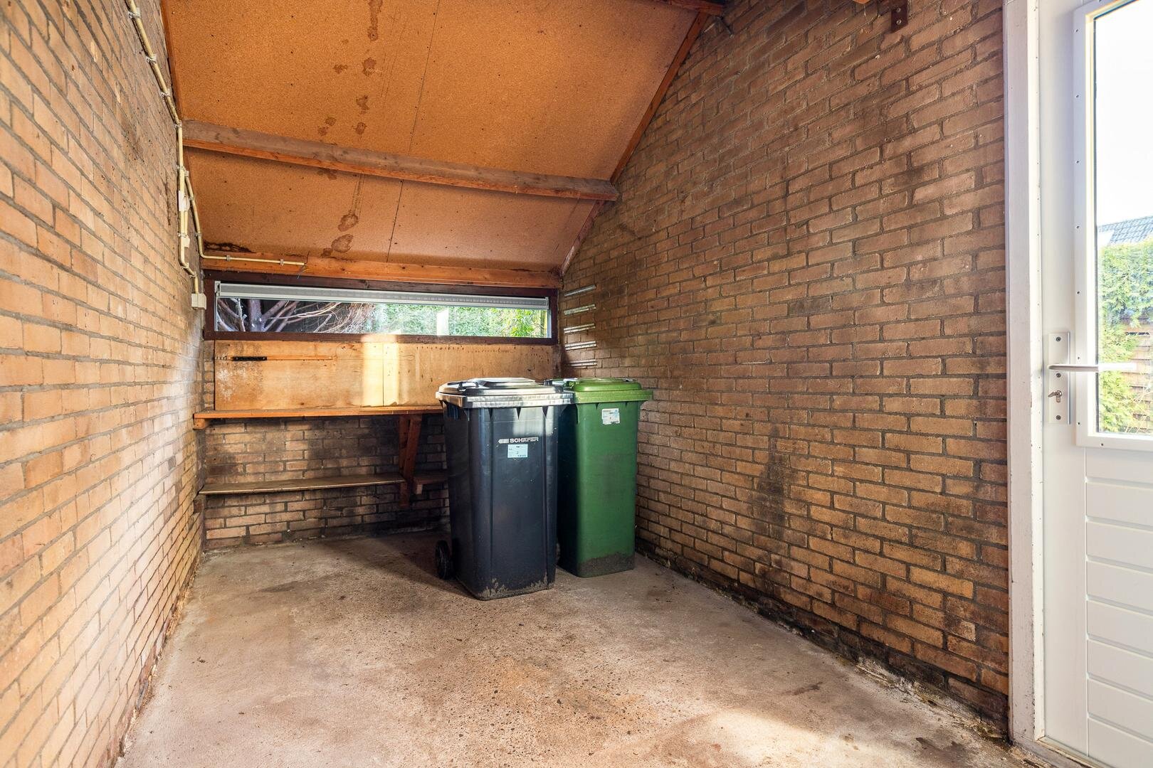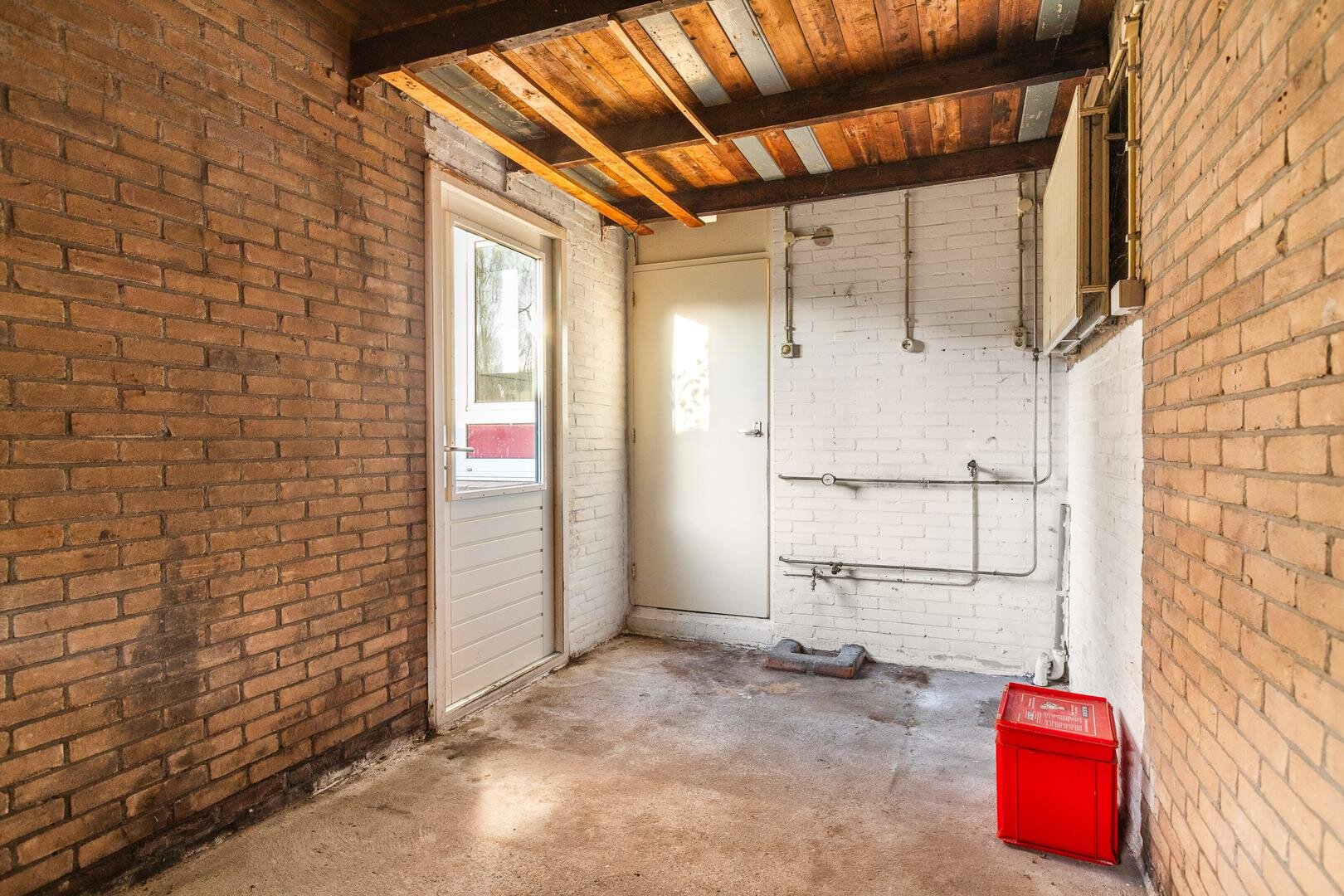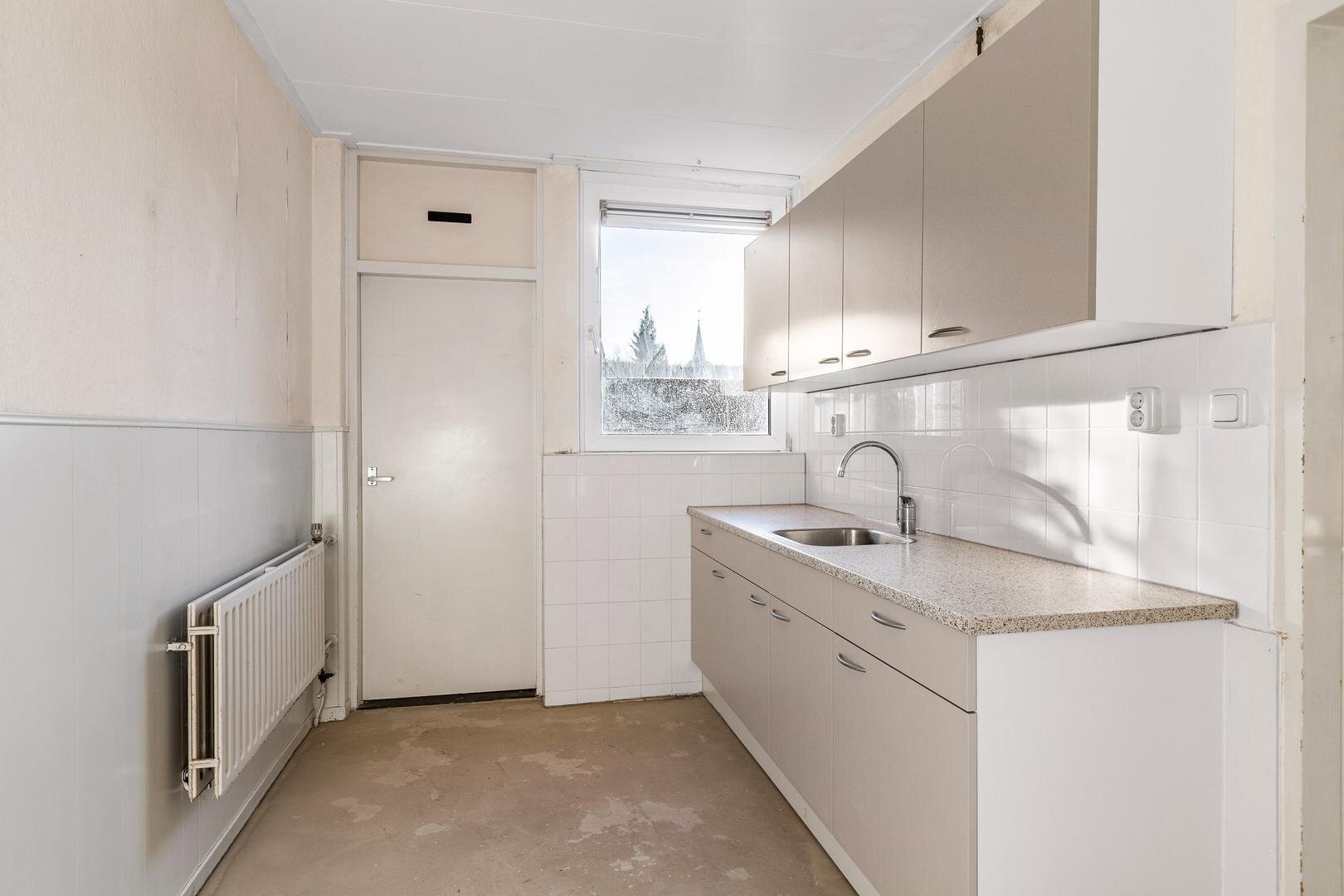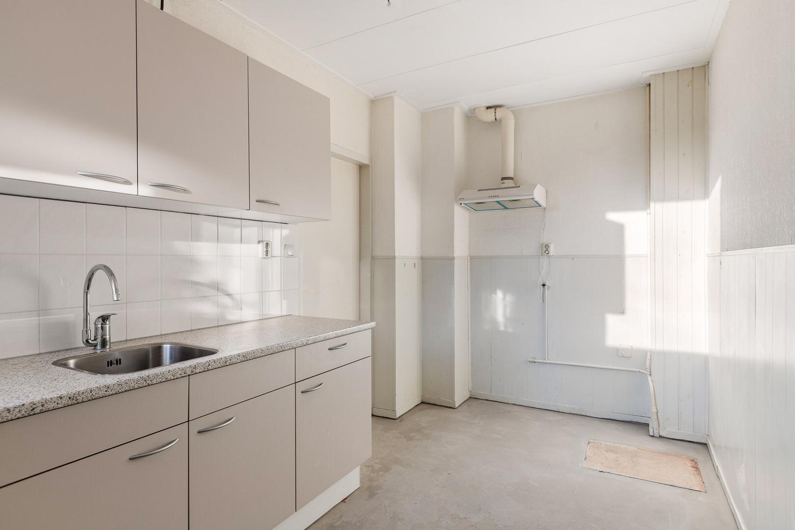 De afgesloten keuken is eenvoudig uitgevoerd met een recht keukenblok, gootsteen en afzuiging en biedt ruimte voor witgoed. Aansluitend bevindt zich de berging, ideaal voor fietsen, containers en tuingereedschap. Vanuit hier is de tuin bereikbaar.