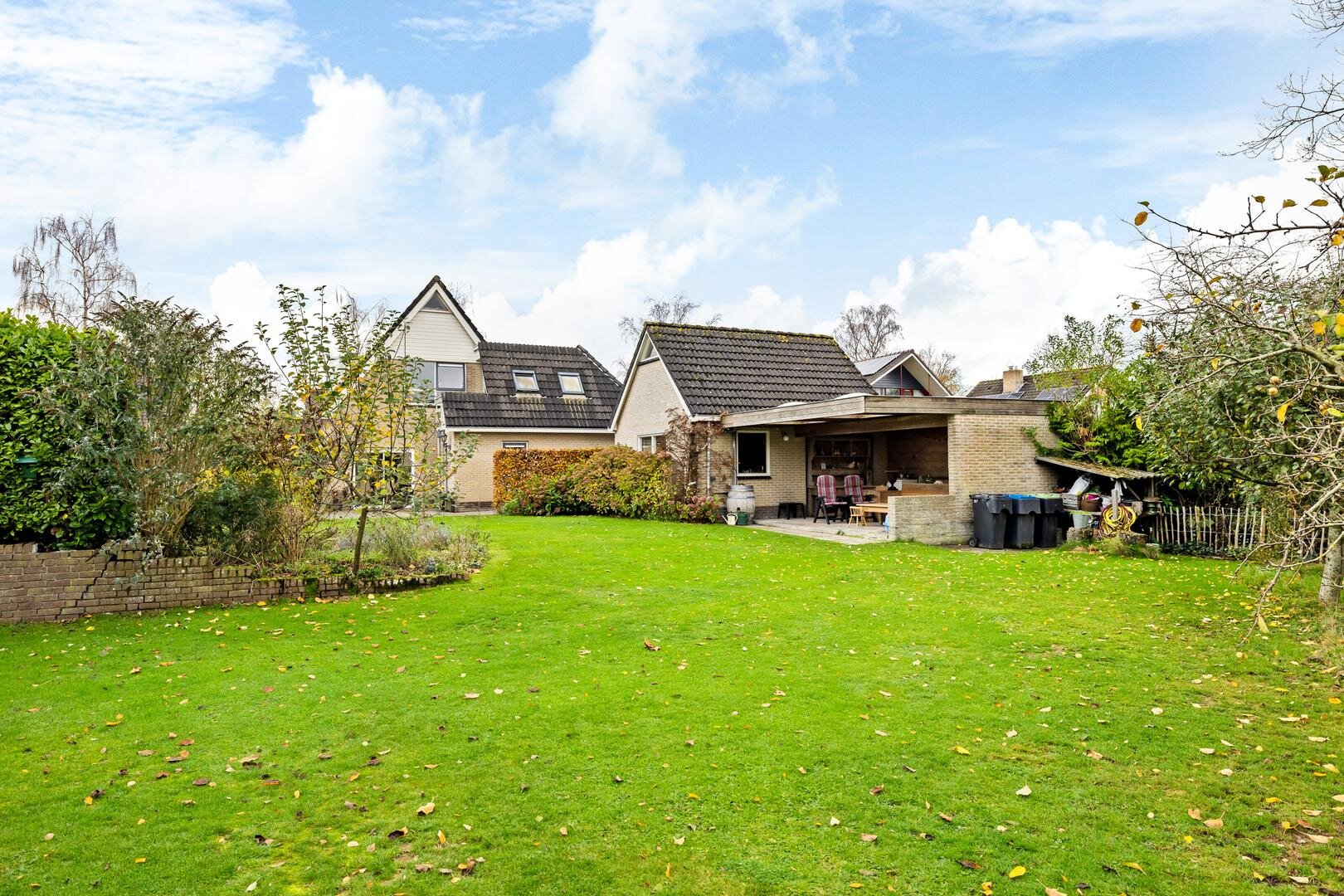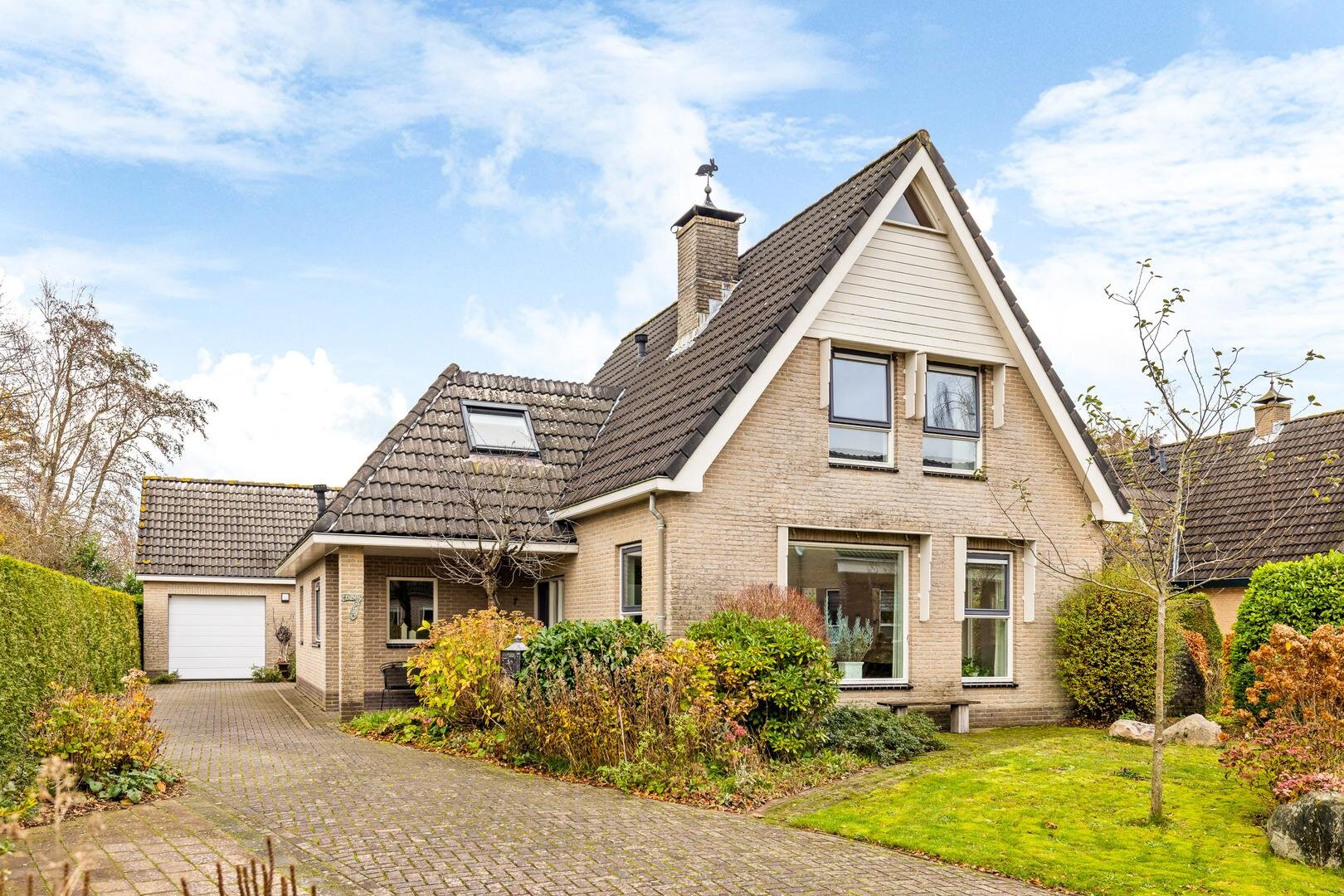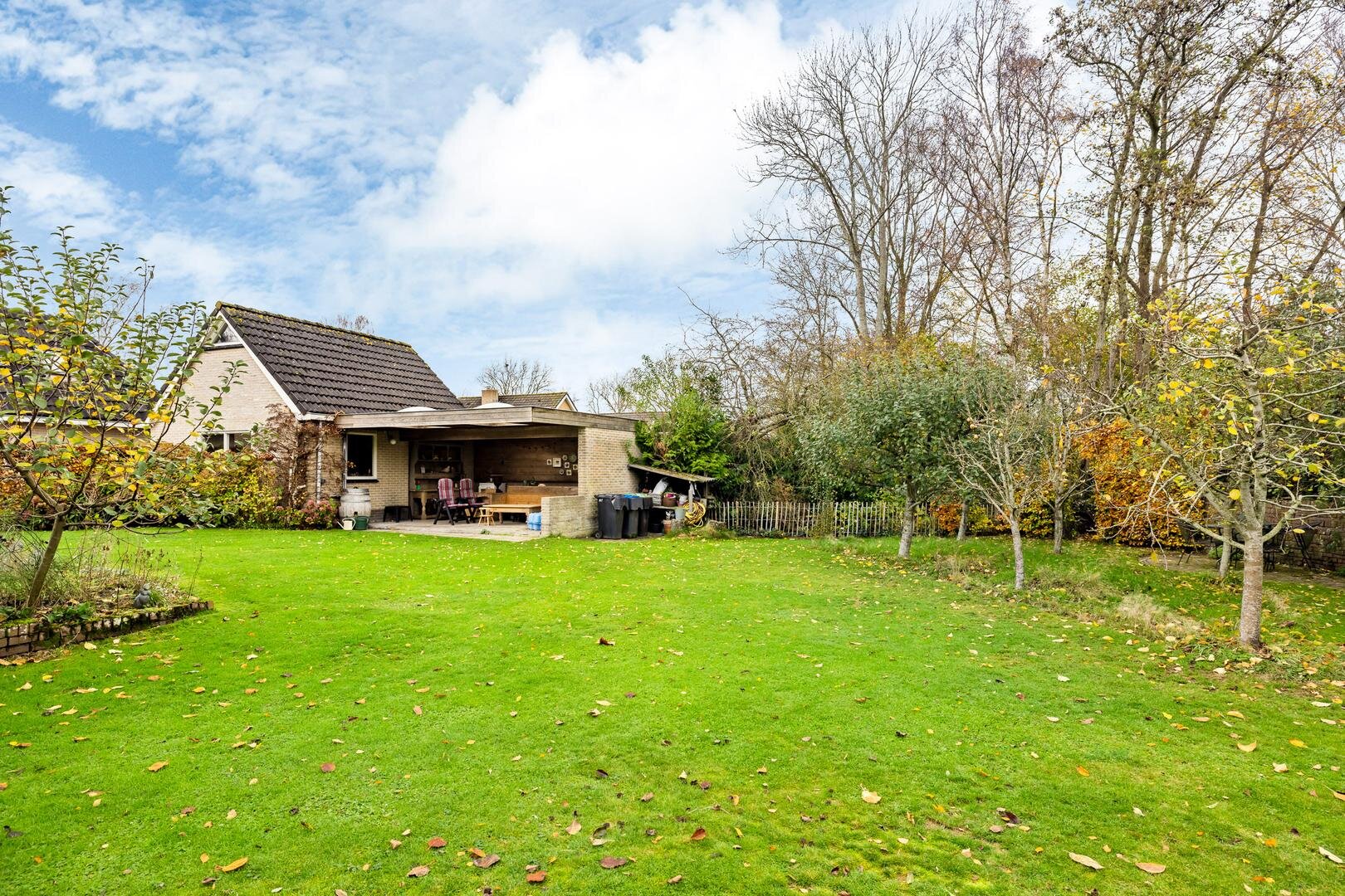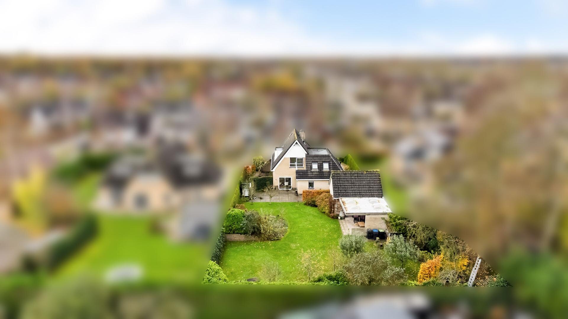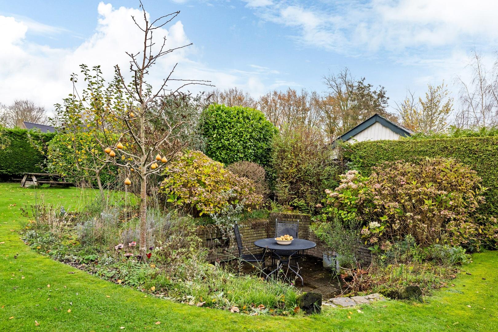 Dan de vrijstaande garage. Deze is voorzien van een betonnen vloer, elektrische deur en een vliering die via een vlizotrap bereikbaar is. Perfect voor de auto, hobby’s of extra opslag.