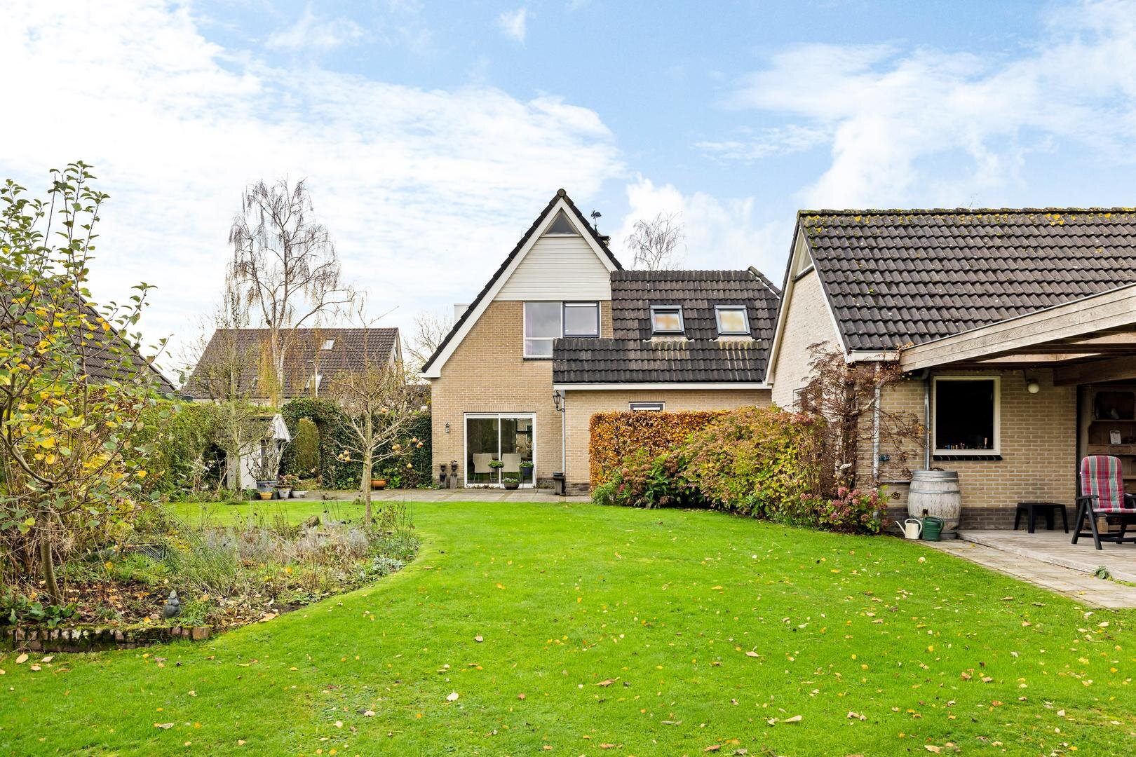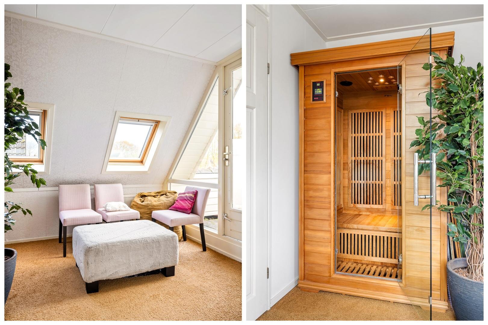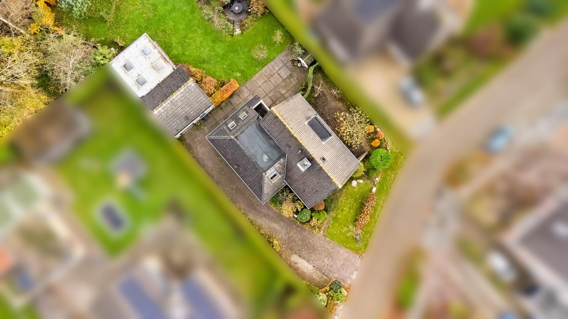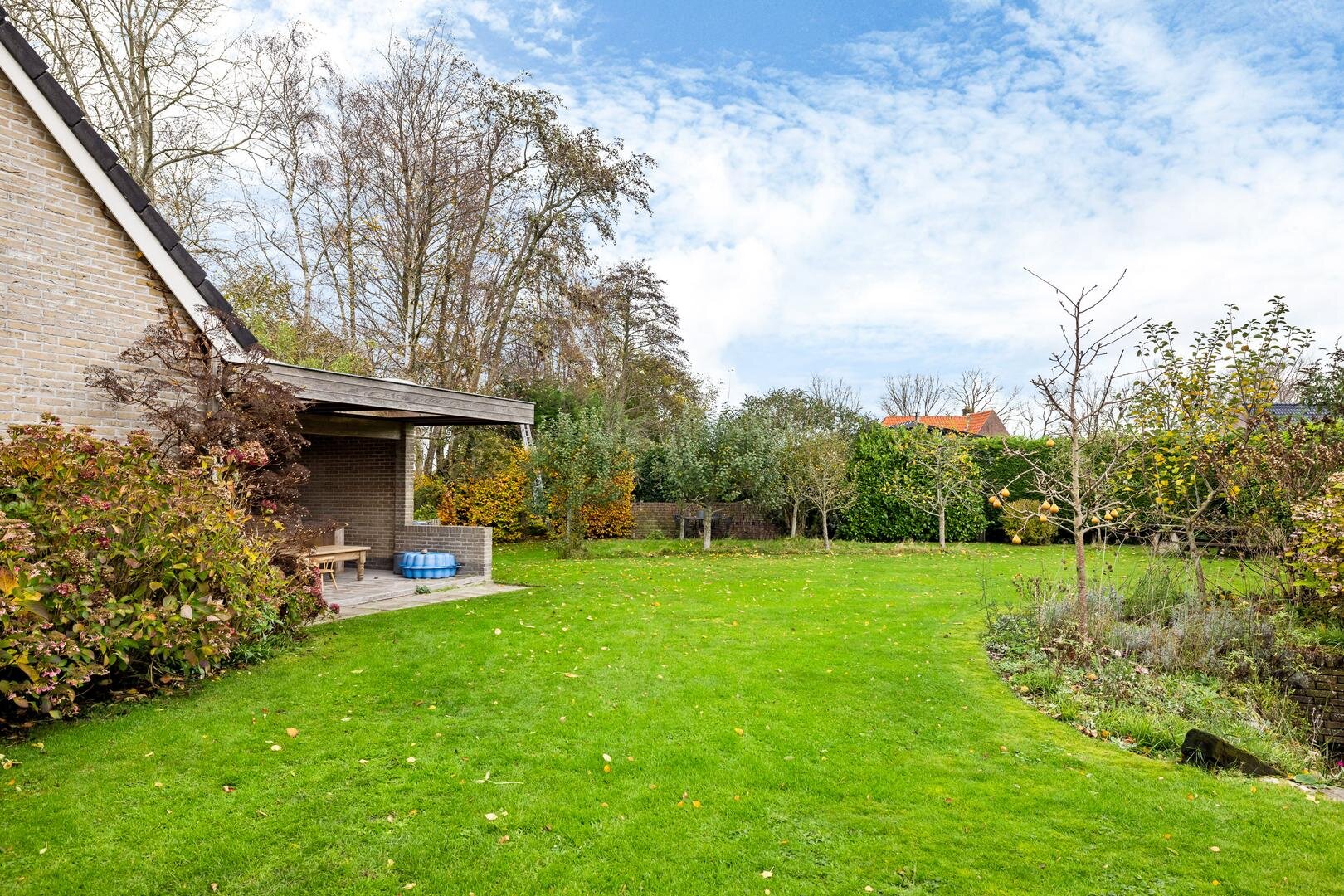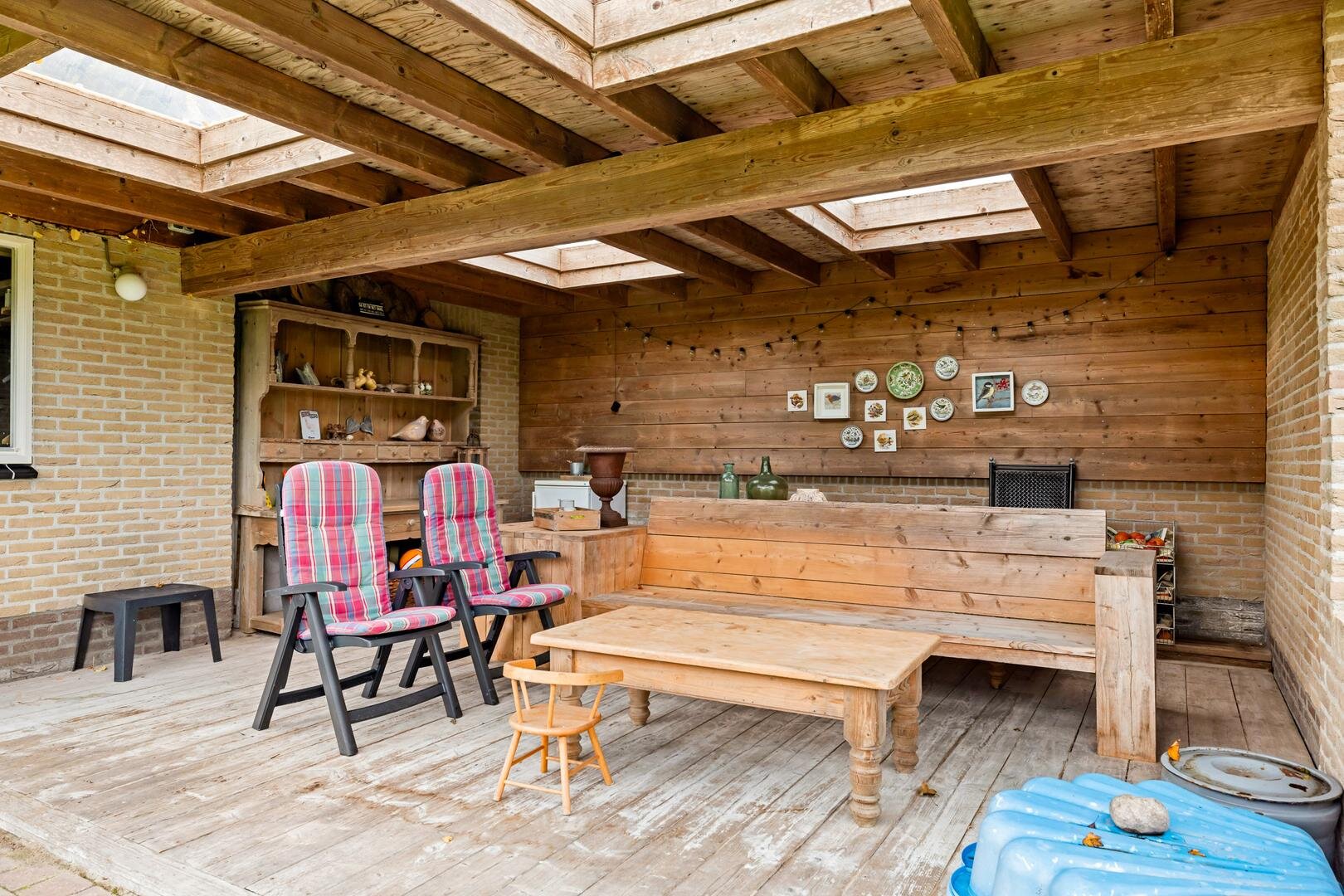 Dan de vrijstaande garage. Deze is voorzien van een betonnen vloer, elektrische deur en een vliering die via een vlizotrap bereikbaar is. Perfect voor de auto, hobby’s of extra opslag.