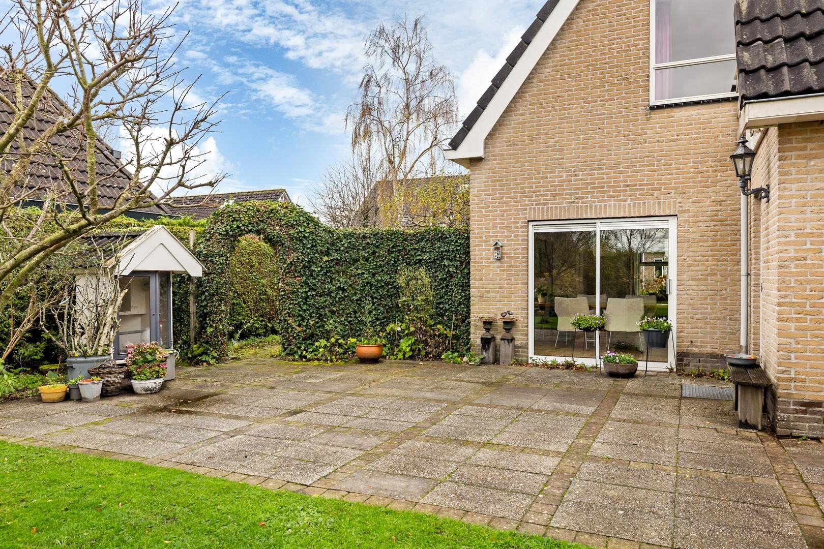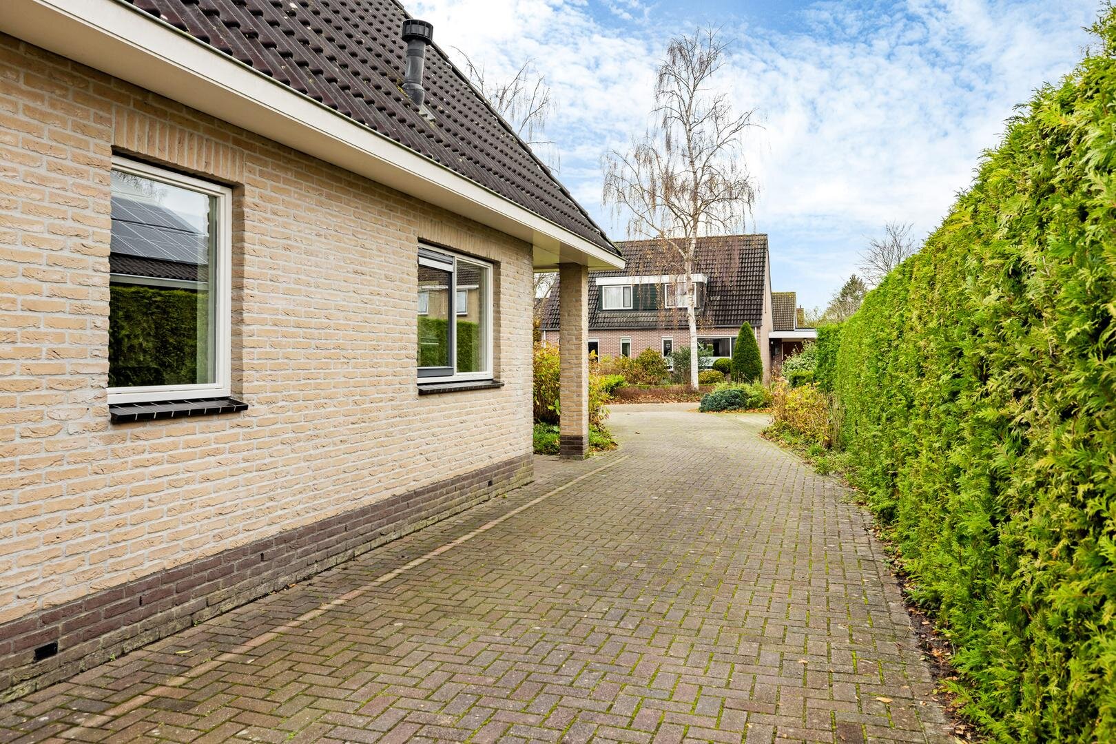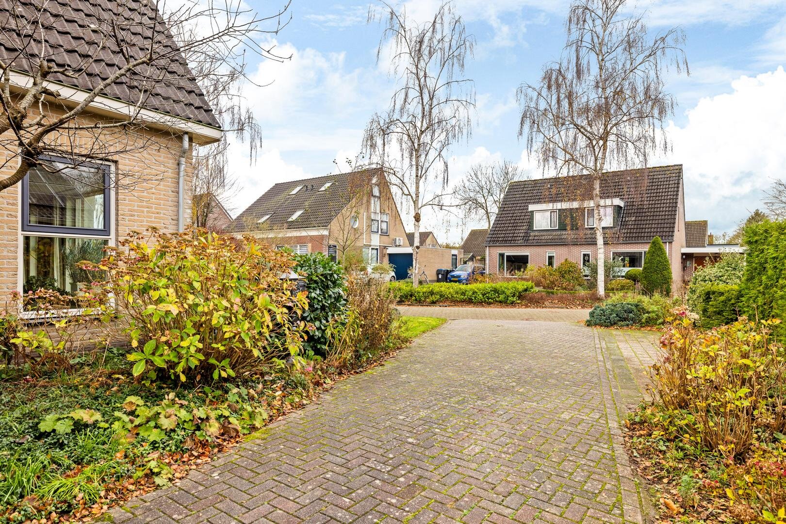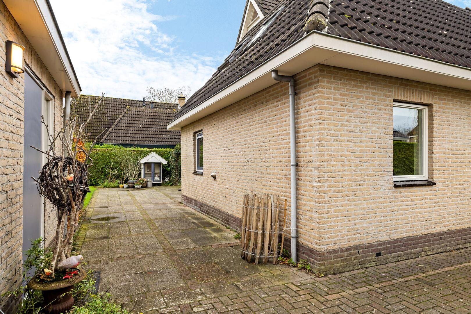 Dan de vrijstaande garage. Deze is voorzien van een betonnen vloer, elektrische deur en een vliering die via een vlizotrap bereikbaar is. Perfect voor de auto, hobby’s of extra opslag.
