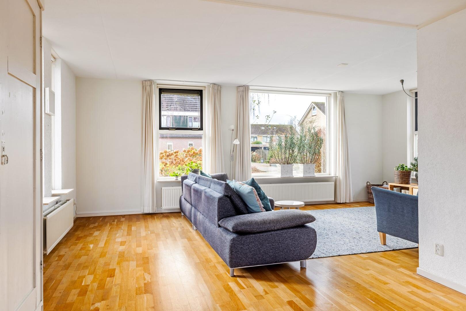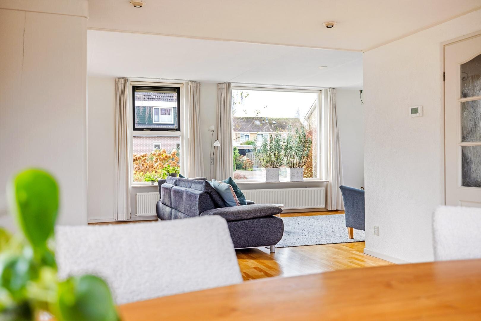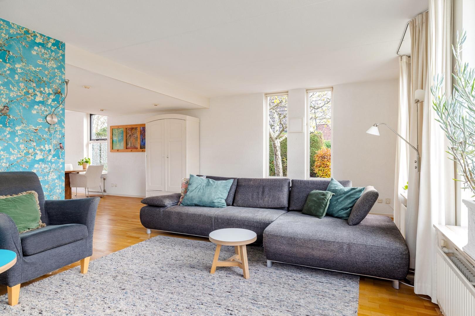 De woonkamer is royaal en licht dankzij de grote ramen en de aluminium schuifpui naar de tuin. Hier geniet je van een mooi uitzicht op het groen en de verzorgde achtertuin met zitkuil.
