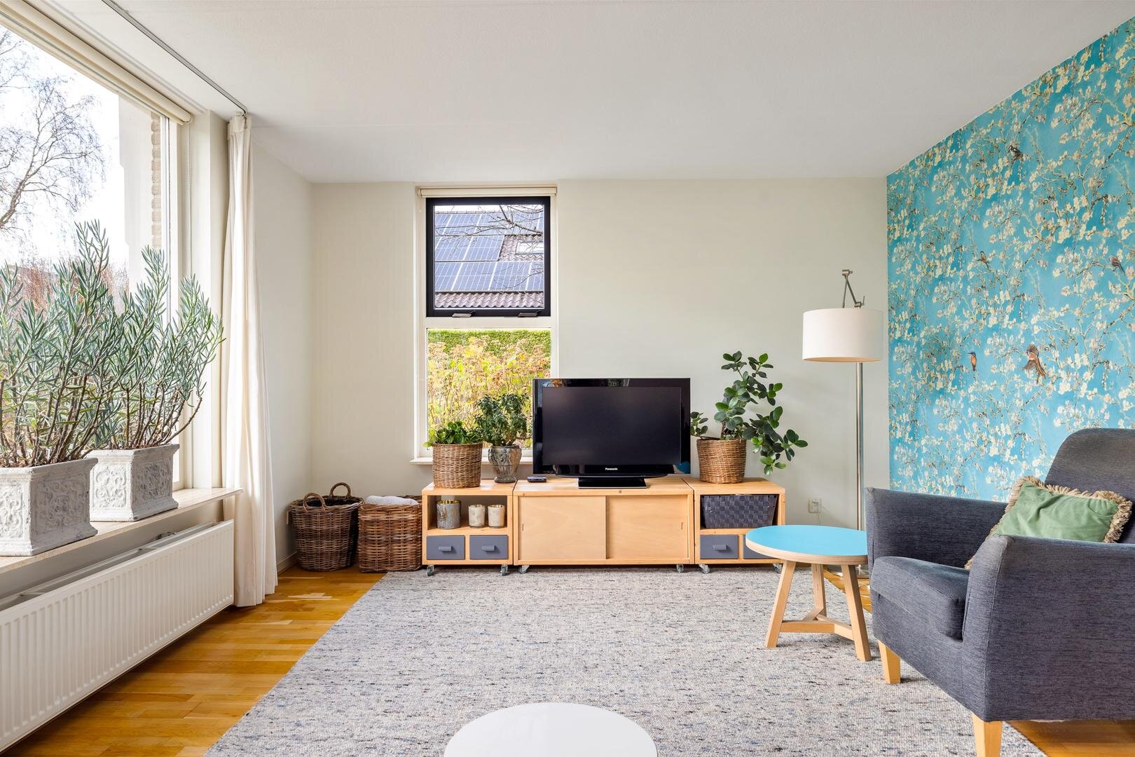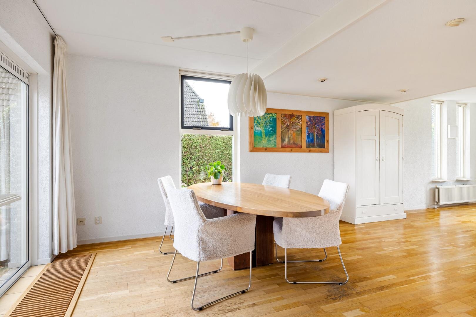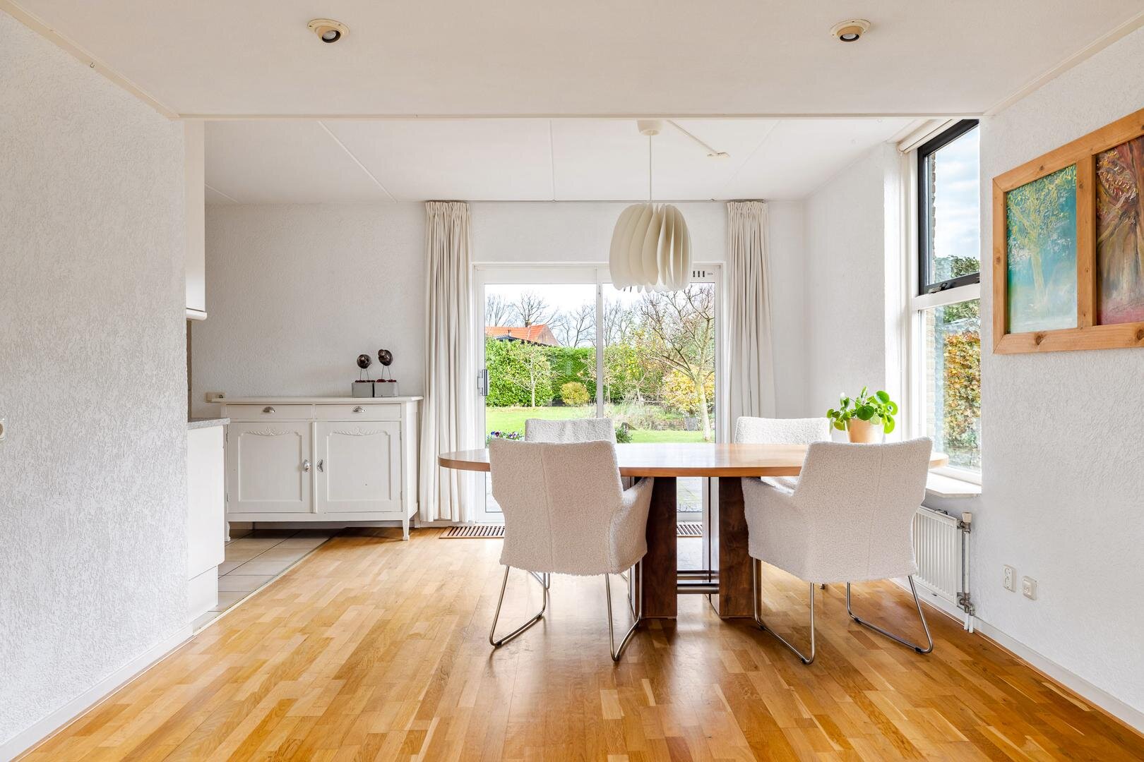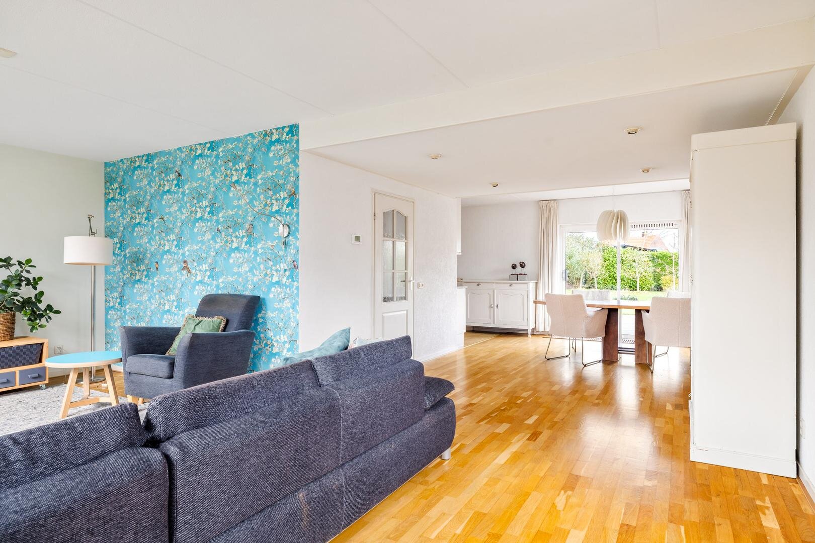 De woonkamer is royaal en licht dankzij de grote ramen en de aluminium schuifpui naar de tuin. Hier geniet je van een mooi uitzicht op het groen en de verzorgde achtertuin met zitkuil.