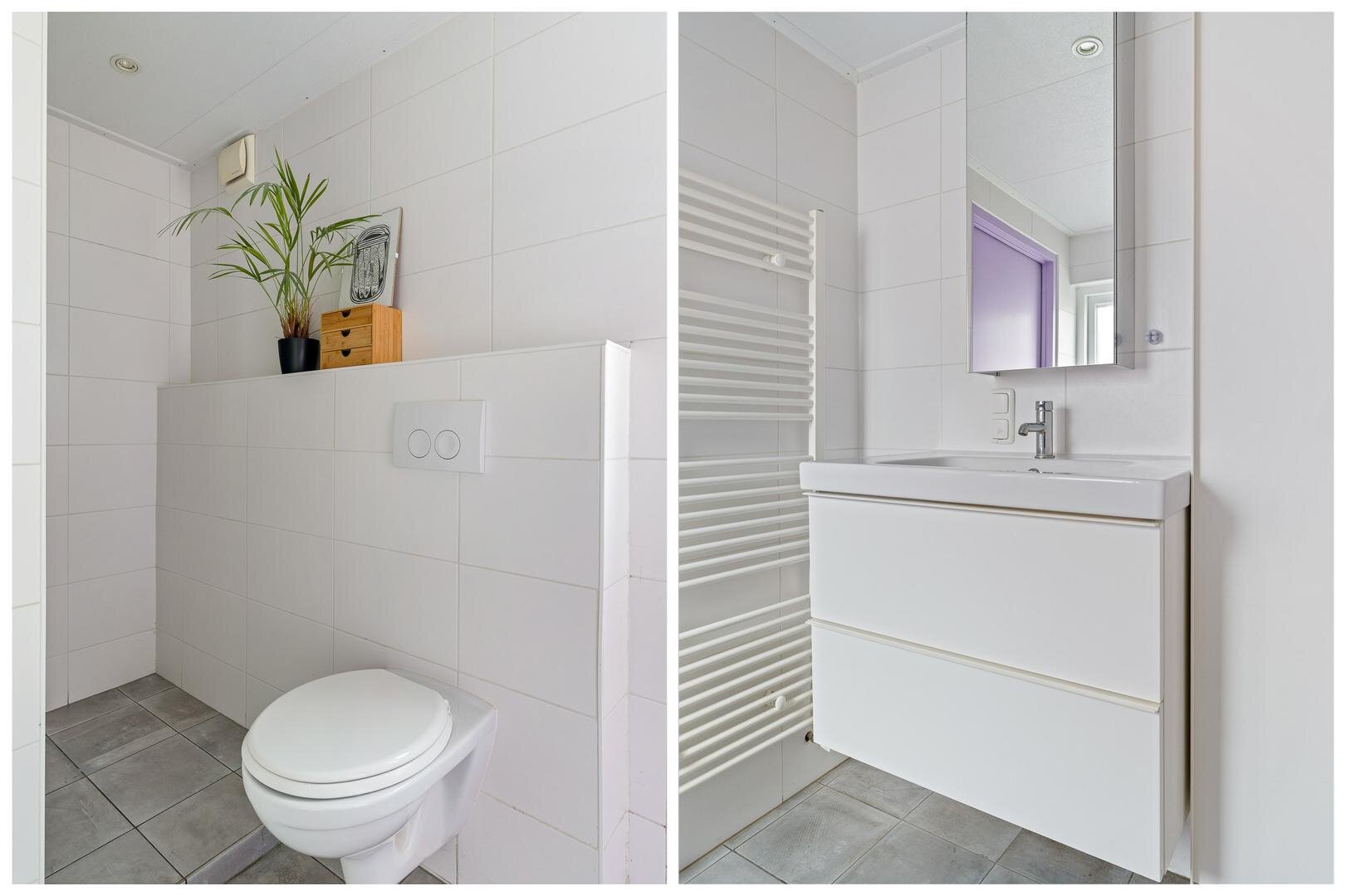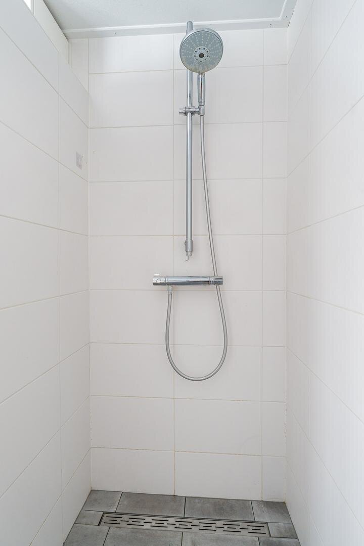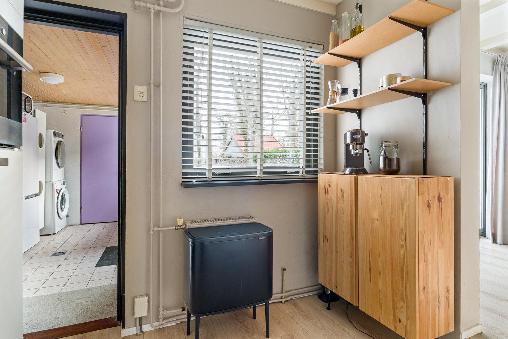 Via de keuken toegang tot de bijkeuken, voorzien van wasmachineaansluiting. De bijkeuken biedt toegang tot de achtertuin en tot een steeg aan de voorzijde van de woning. Aansluitend bevindt zich de badkamer, licht betegeld en uitgevoerd met een douche, toilet en wastafelmeubel.