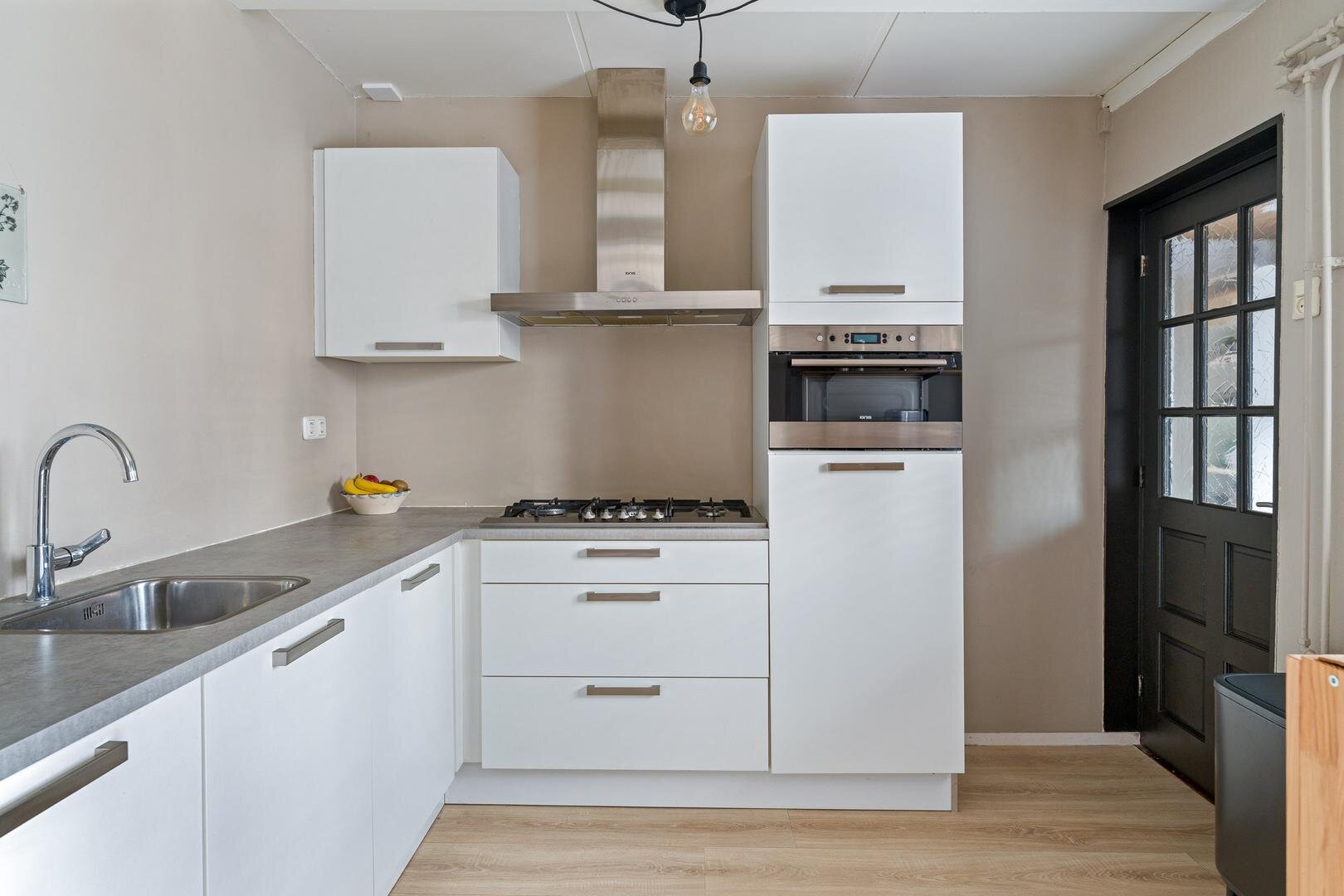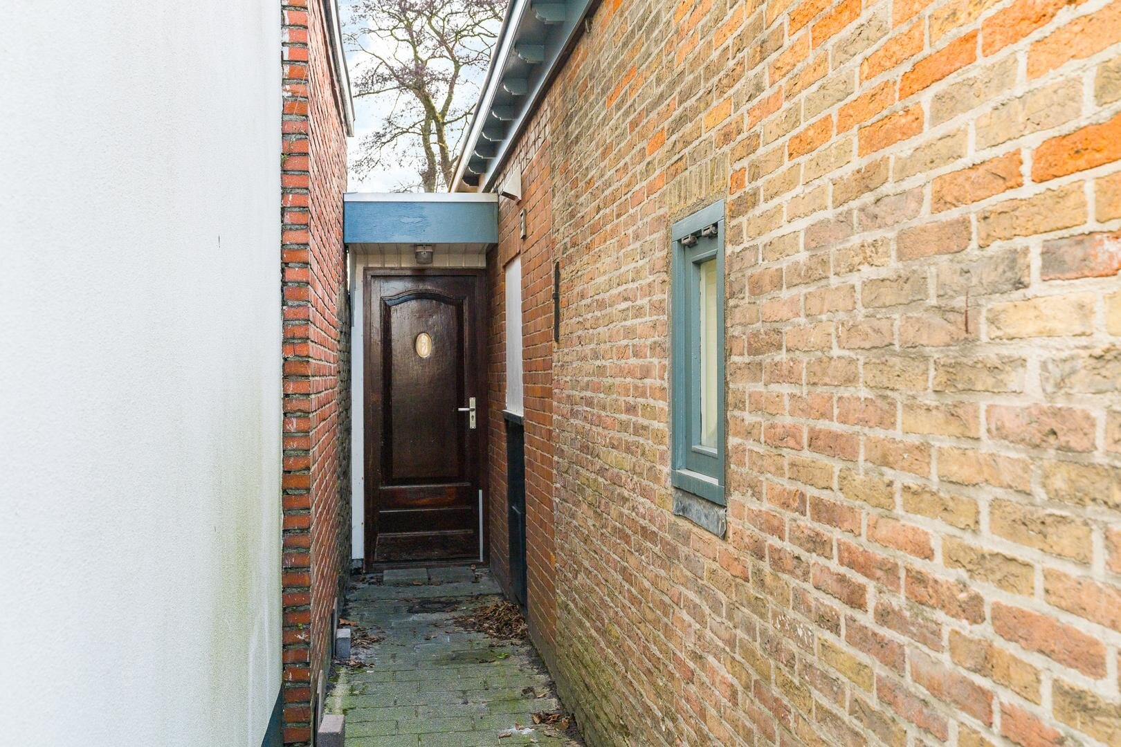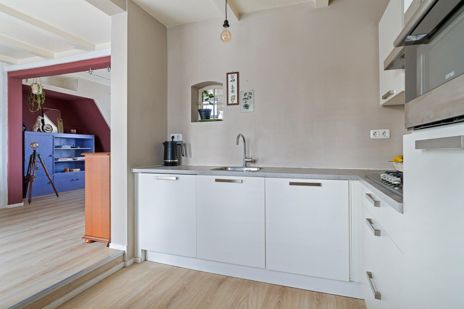 Via de keuken toegang tot de bijkeuken, voorzien van wasmachineaansluiting. De bijkeuken biedt toegang tot de achtertuin en tot een steeg aan de voorzijde van de woning. Aansluitend bevindt zich de badkamer, licht betegeld en uitgevoerd met een douche, toilet en wastafelmeubel.