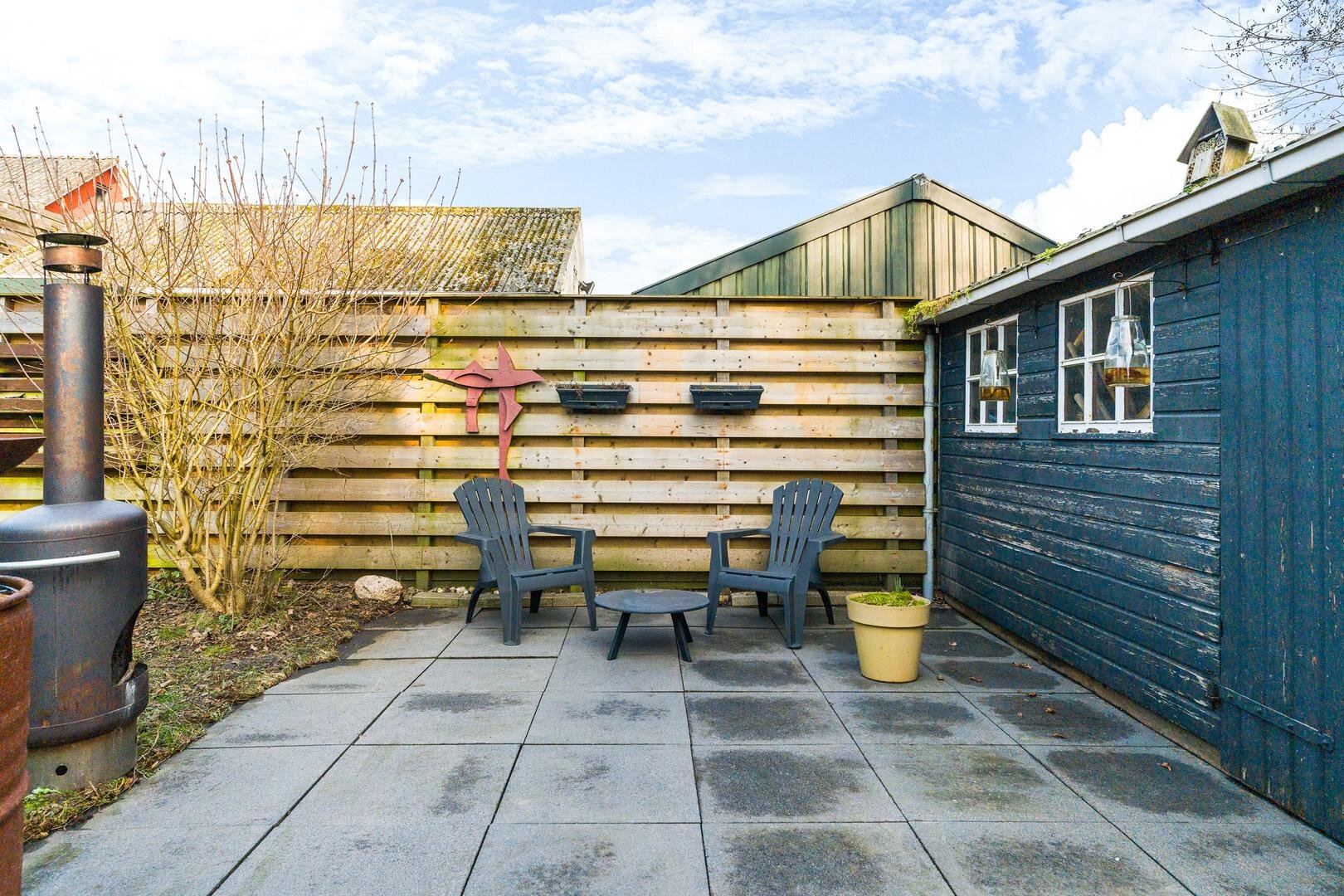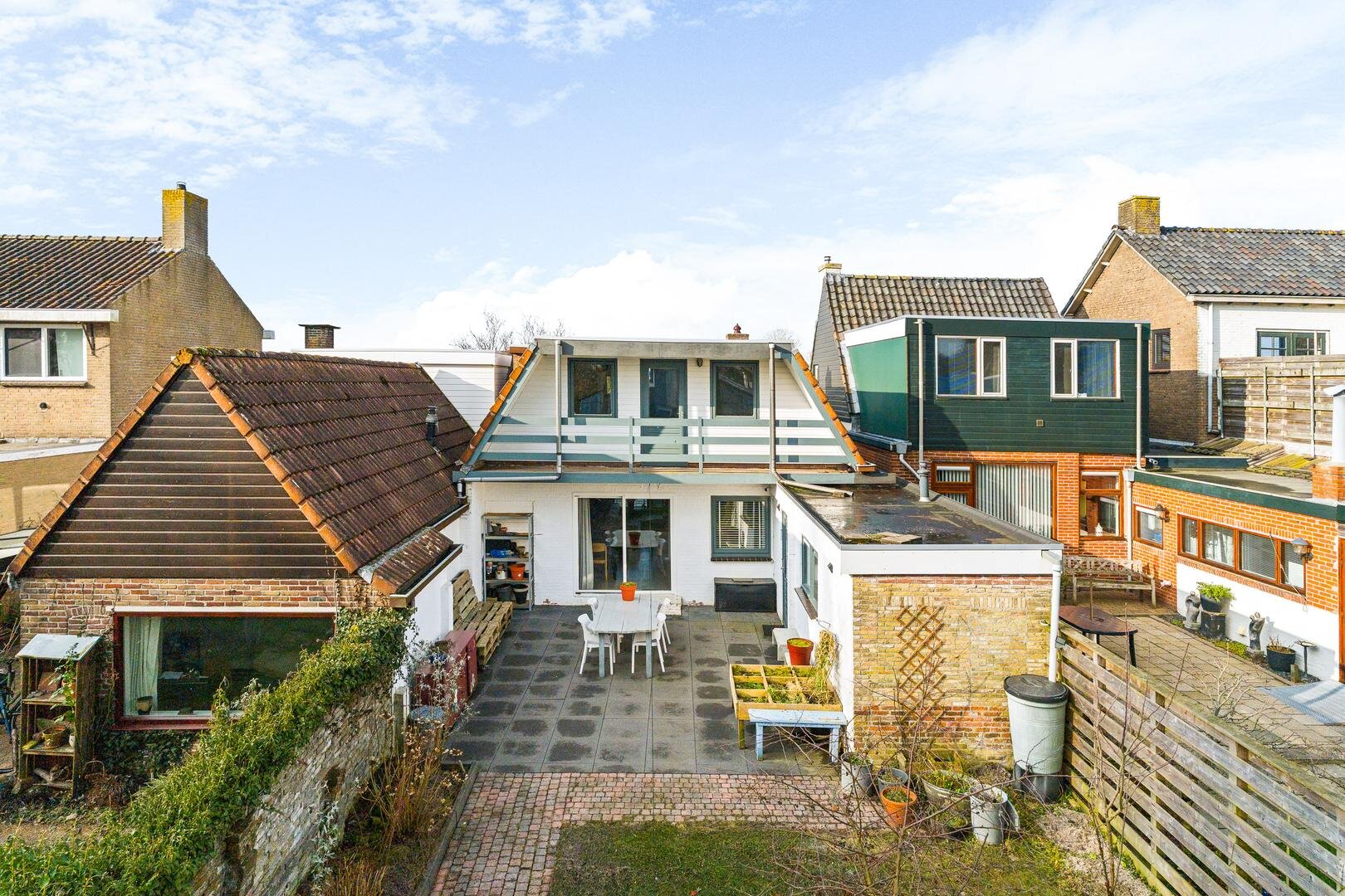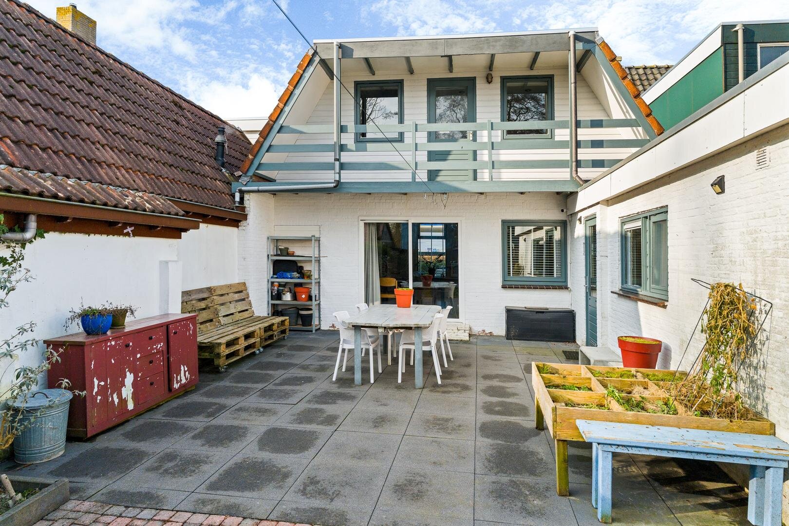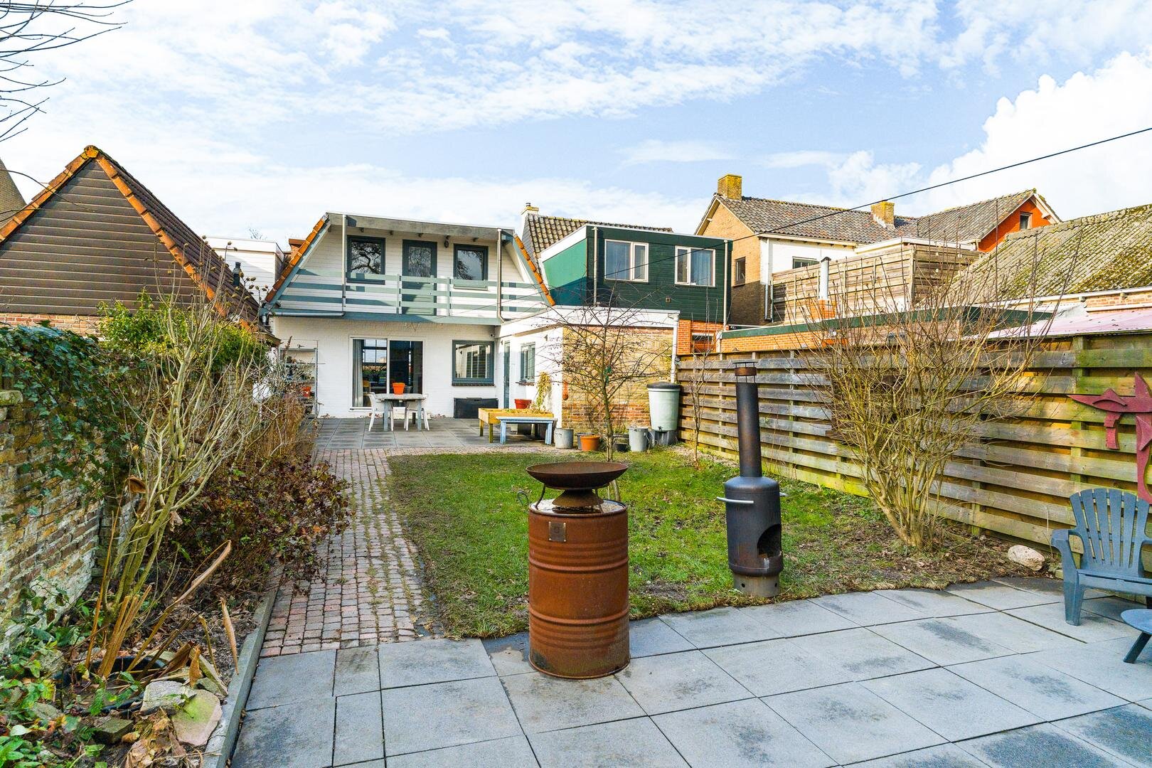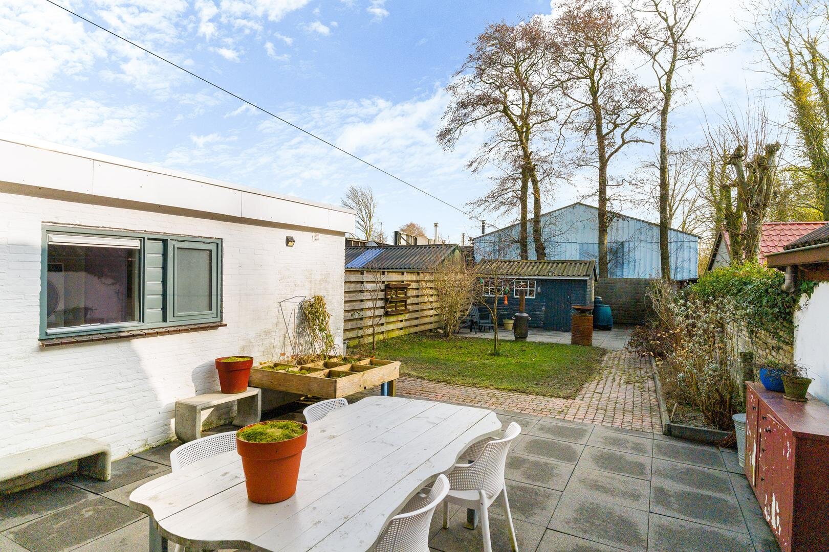 De achtertuin heeft een diepte van circa 21 meter en is deels betegeld, waardoor er op zonnige dagen volop ruimte is voor een fijne zitplek, eettafel of barbecue. Achterin de tuin bevindt zich een vrijstaande schuur. Aan de rechterzijde van de tuin zijn plantenbakken aanwezig, geschikt voor een bloemen- of moestuin.