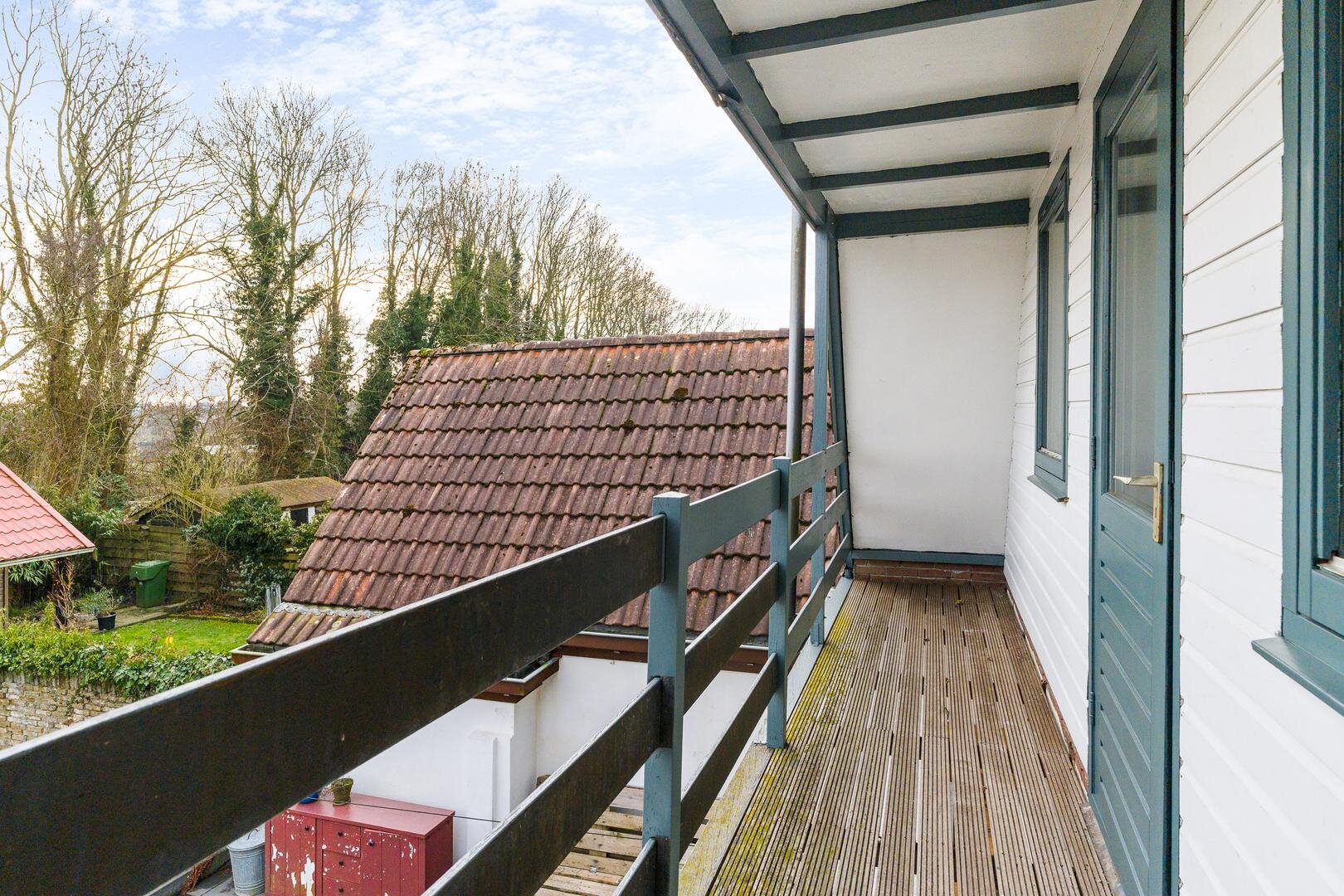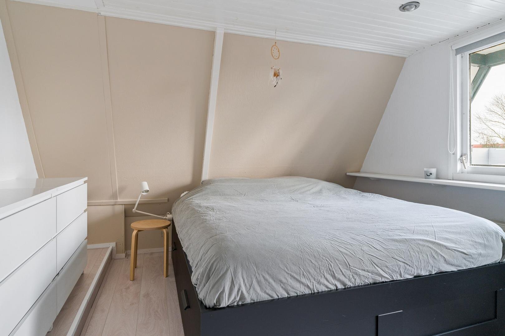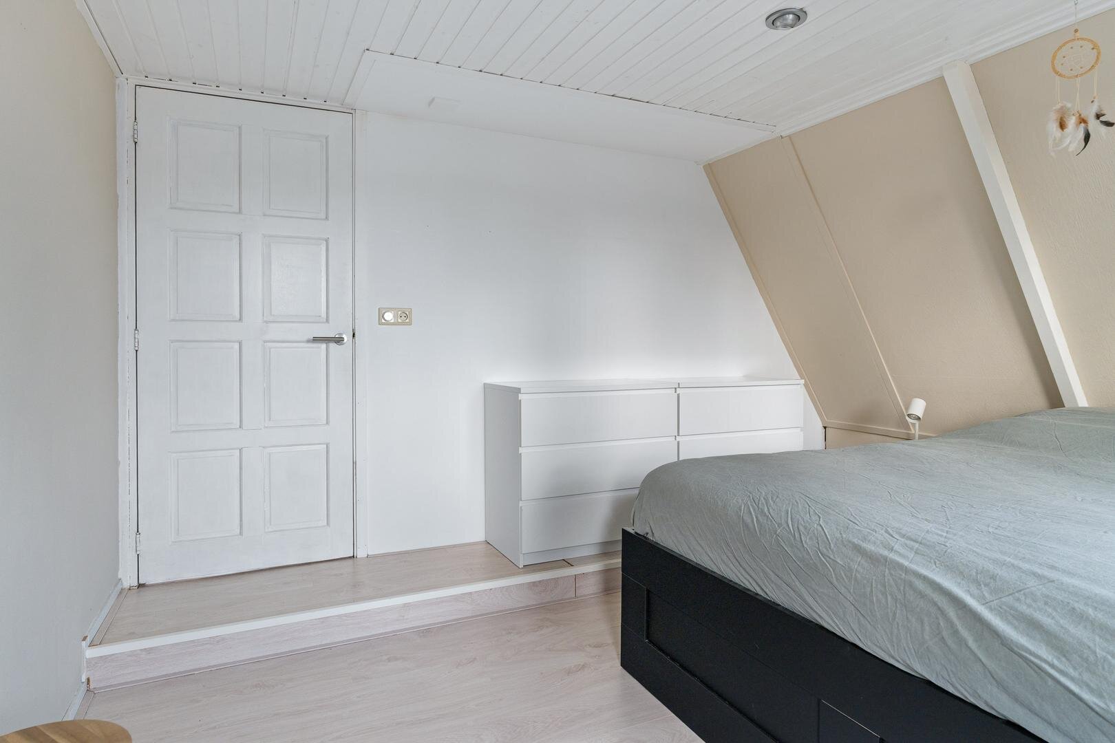 Overloop met toegang tot drie slaapkamers en een berging. Twee slaapkamers zijn gelegen aan de achterzijde, waaronder de hoofdslaapkamer van circa 11 m² met toegang tot een balkon van circa 6 m² en uitzicht over de tuin. De derde slaapkamer bevindt zich aan de voorzijde van de woning.