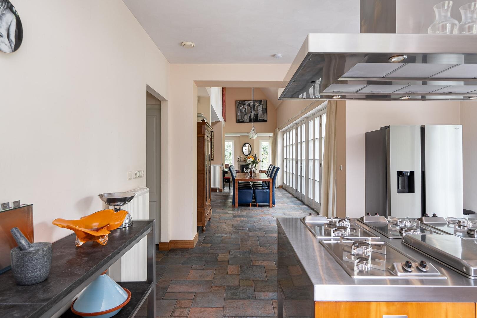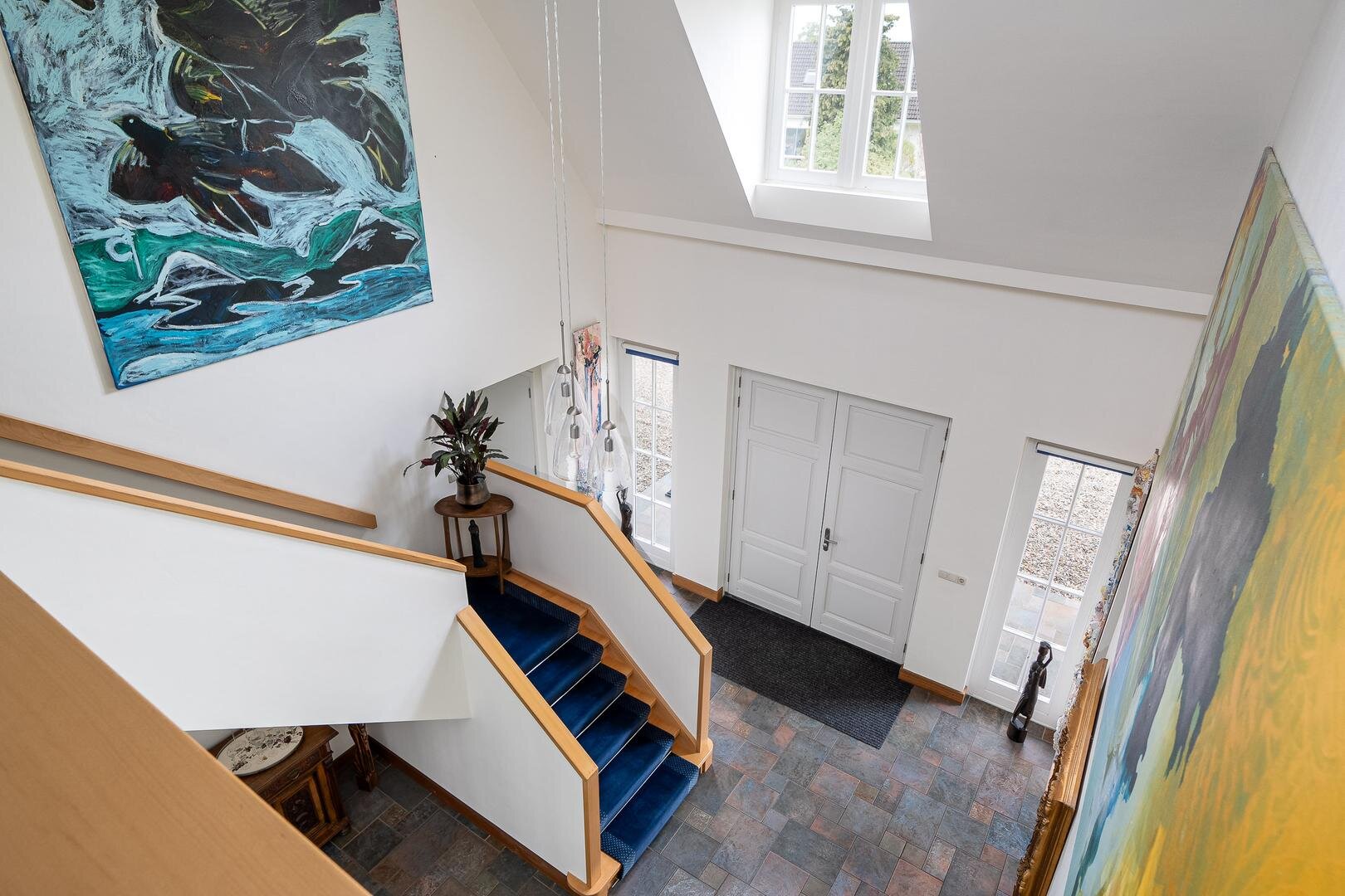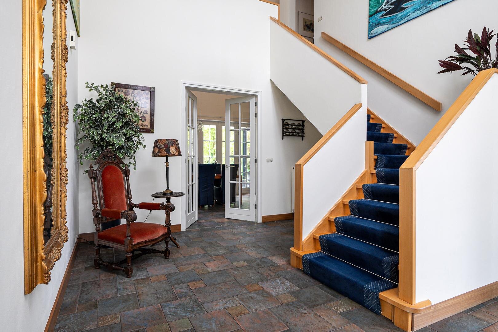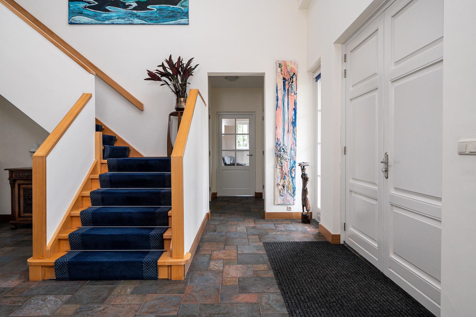 De royale entreehal verwelkomt je met een stijlvolle open trapopgang naar de vide, die meteen een bijzonder gevoel van ruimte creëert. Vanuit de hal is er toegang tot het gastentoilet, de werk-/leeskamer (kantoor of bibliotheek), en de royale woonkamer van ca. 75 m². Deze is open, licht en tegelijkertijd intiem ingedeeld met verschillende zit- en leefhoeken. De eetkamer, met openslaande deuren naar de tuin, vormt het hart van de woning. De keuken is modern opgezet met een kookeiland, hoogwaardige inbouwapparatuur en directe toegang tot het terras. Praktisch is ook de bijkeuken met ingebouwde kastenwand en wasruimte.