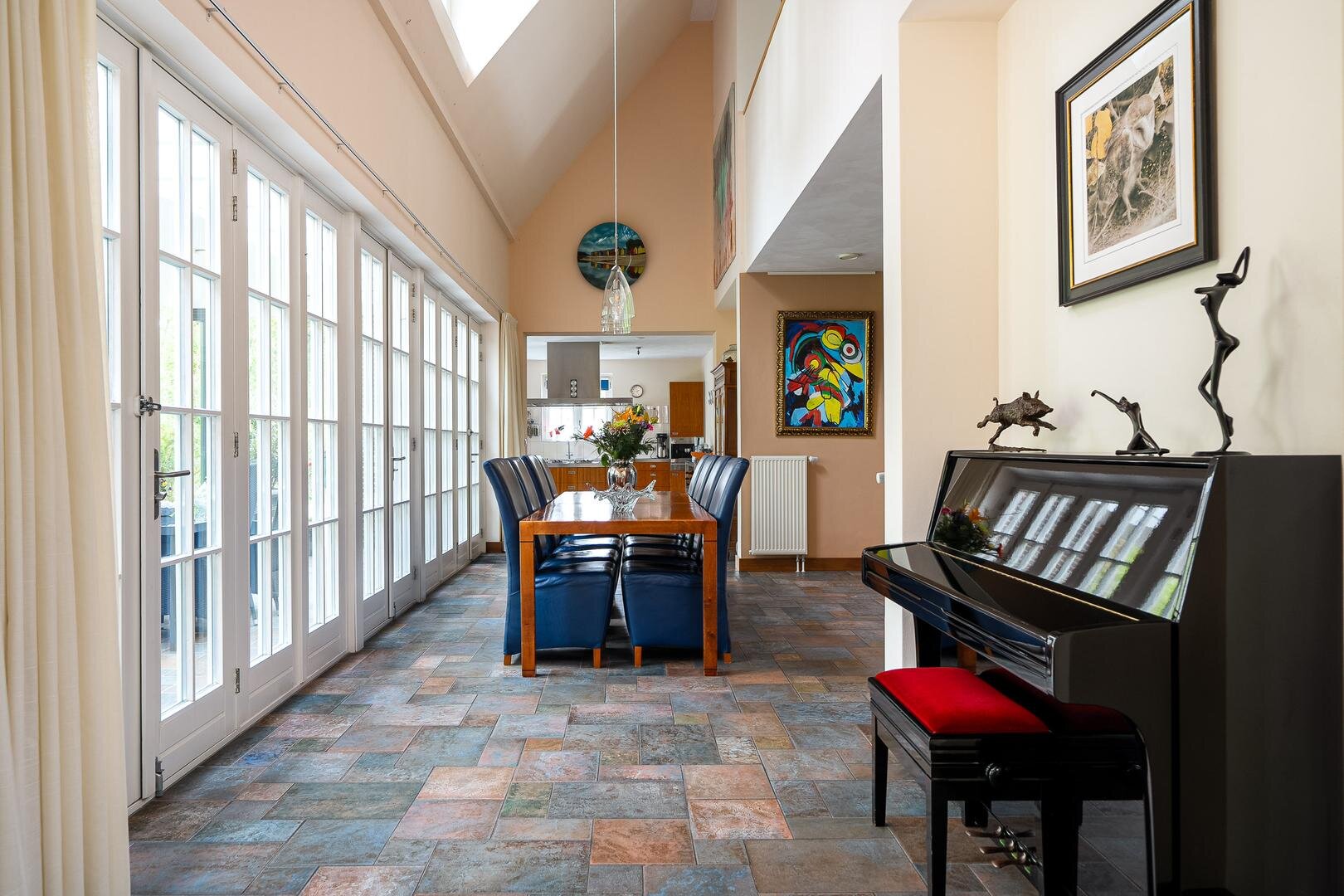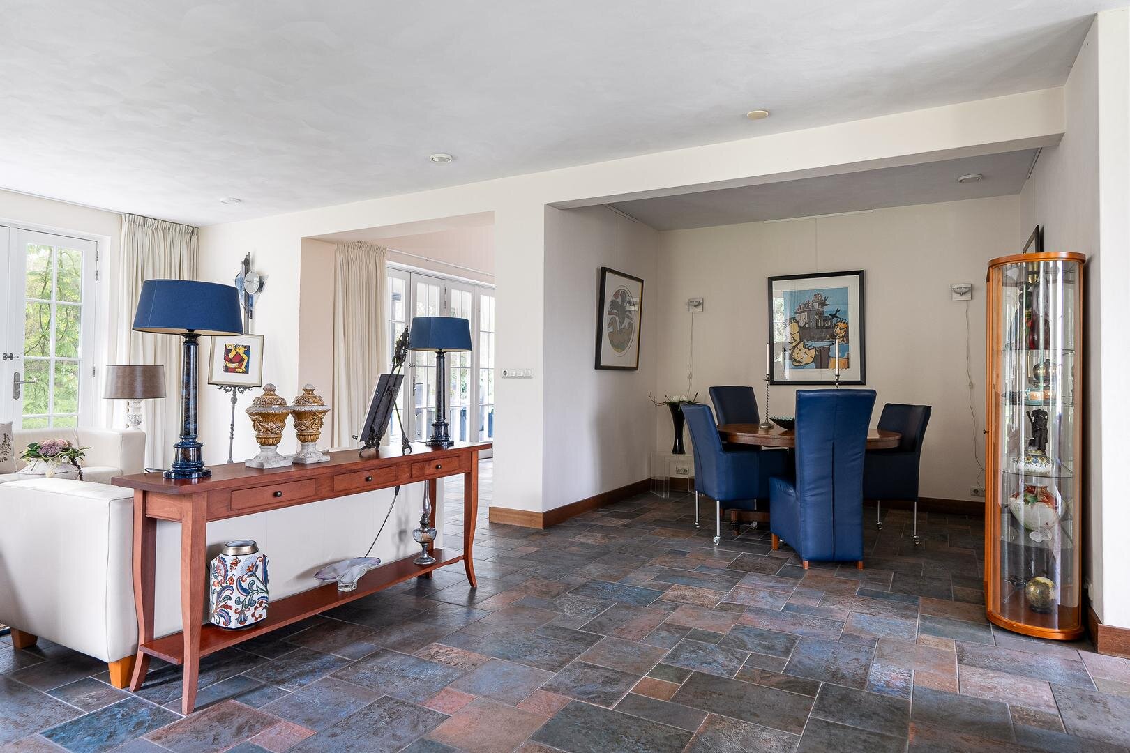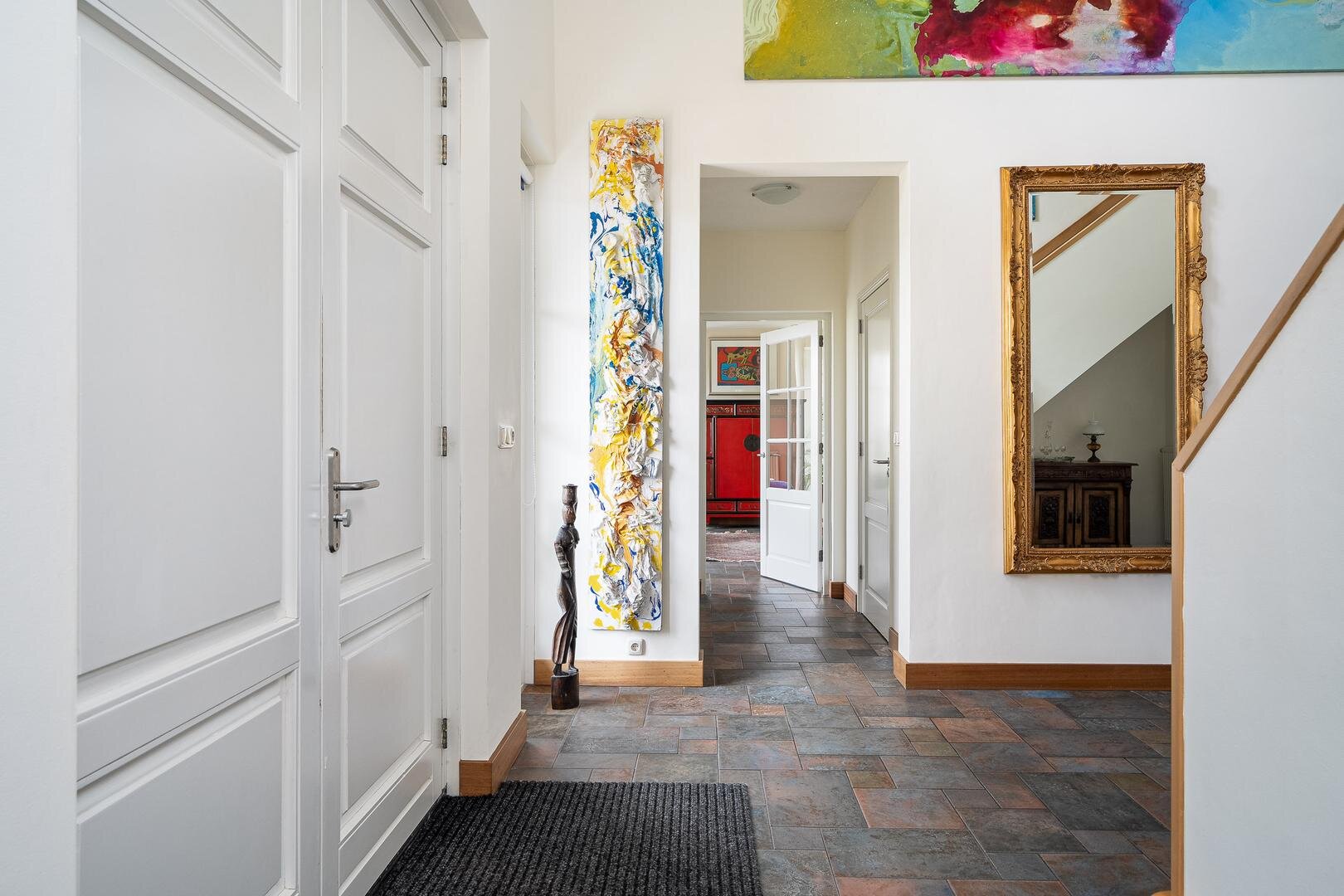 De royale entreehal verwelkomt je met een stijlvolle open trapopgang naar de vide, die meteen een bijzonder gevoel van ruimte creëert. Vanuit de hal is er toegang tot het gastentoilet, de werk-/leeskamer (kantoor of bibliotheek), en de royale woonkamer van ca. 75 m². Deze is open, licht en tegelijkertijd intiem ingedeeld met verschillende zit- en leefhoeken. De eetkamer, met openslaande deuren naar de tuin, vormt het hart van de woning. De keuken is modern opgezet met een kookeiland, hoogwaardige inbouwapparatuur en directe toegang tot het terras. Praktisch is ook de bijkeuken met ingebouwde kastenwand en wasruimte.