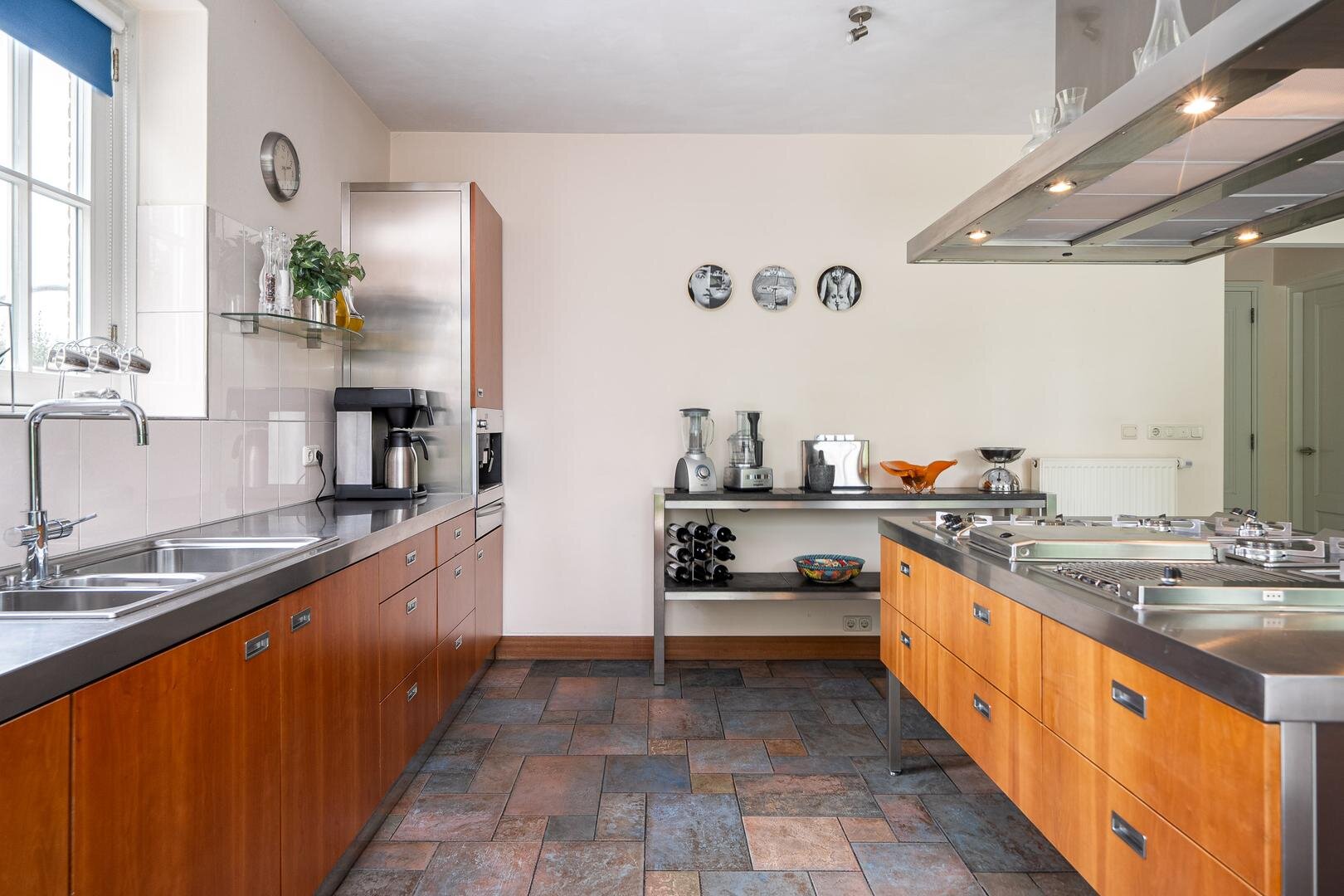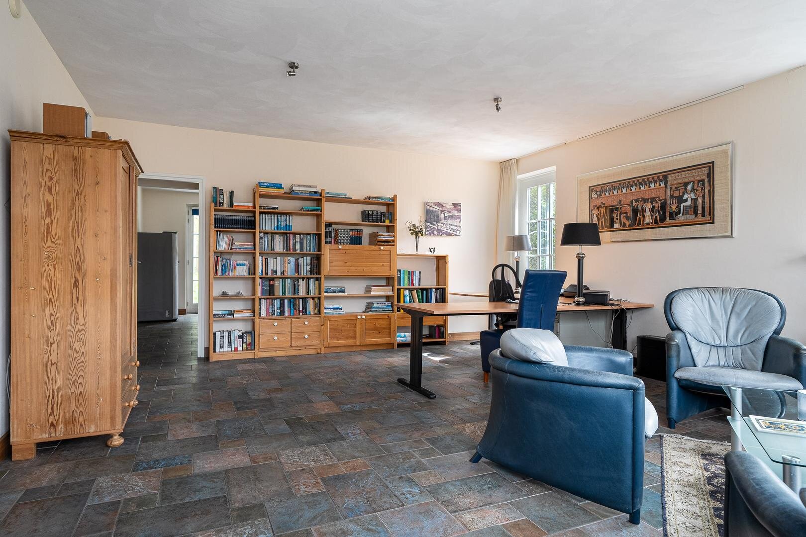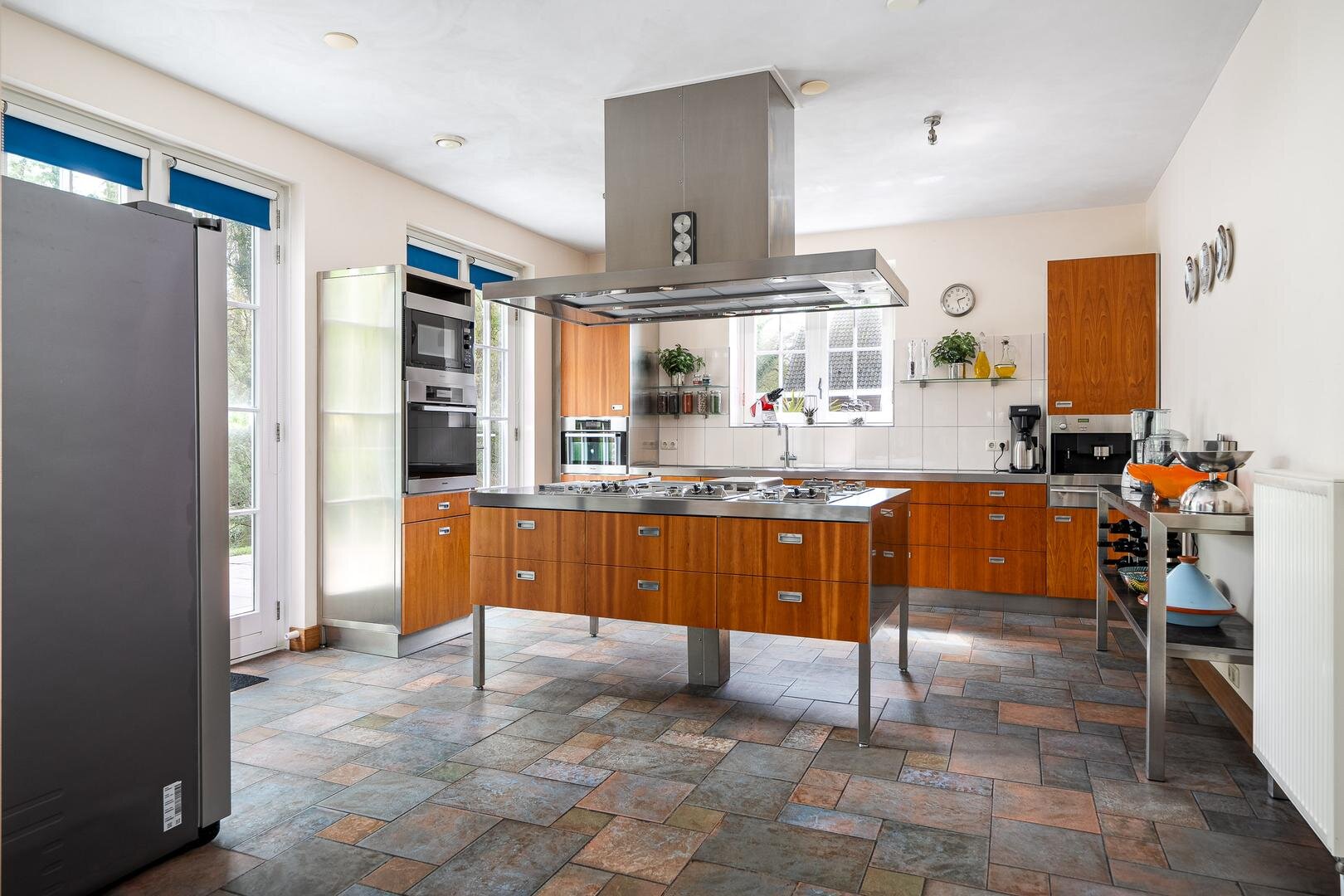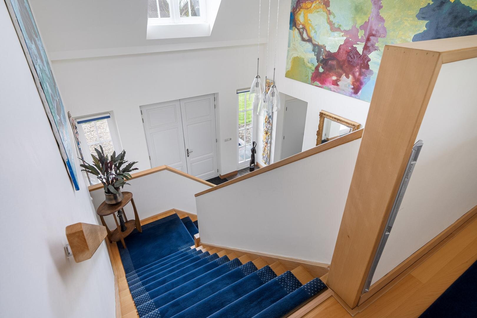 De royale entreehal verwelkomt je met een stijlvolle open trapopgang naar de vide, die meteen een bijzonder gevoel van ruimte creëert. Vanuit de hal is er toegang tot het gastentoilet, de werk-/leeskamer (kantoor of bibliotheek), en de royale woonkamer van ca. 75 m². Deze is open, licht en tegelijkertijd intiem ingedeeld met verschillende zit- en leefhoeken. De eetkamer, met openslaande deuren naar de tuin, vormt het hart van de woning. De keuken is modern opgezet met een kookeiland, hoogwaardige inbouwapparatuur en directe toegang tot het terras. Praktisch is ook de bijkeuken met ingebouwde kastenwand en wasruimte.