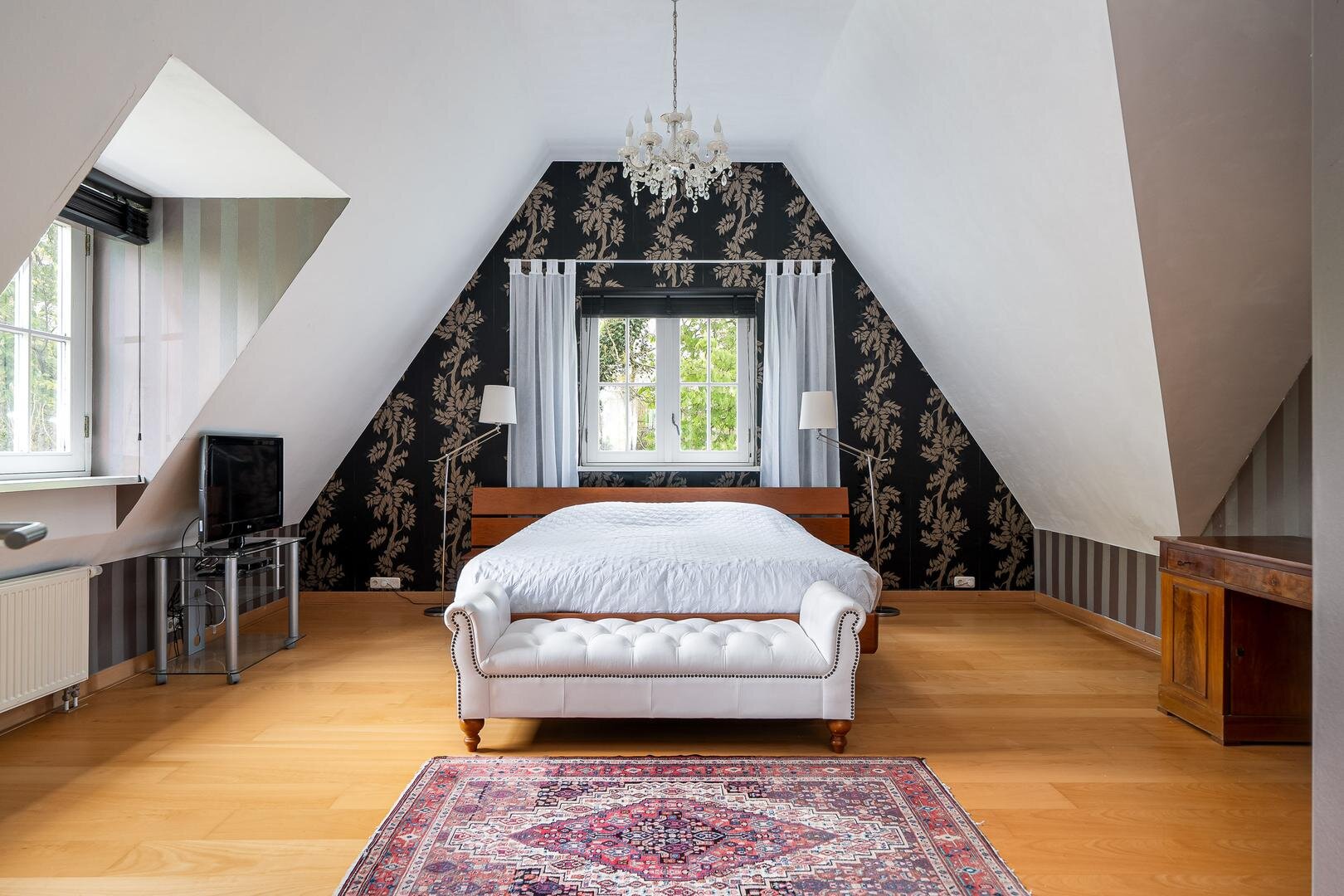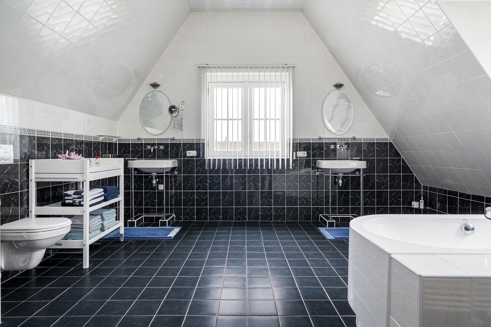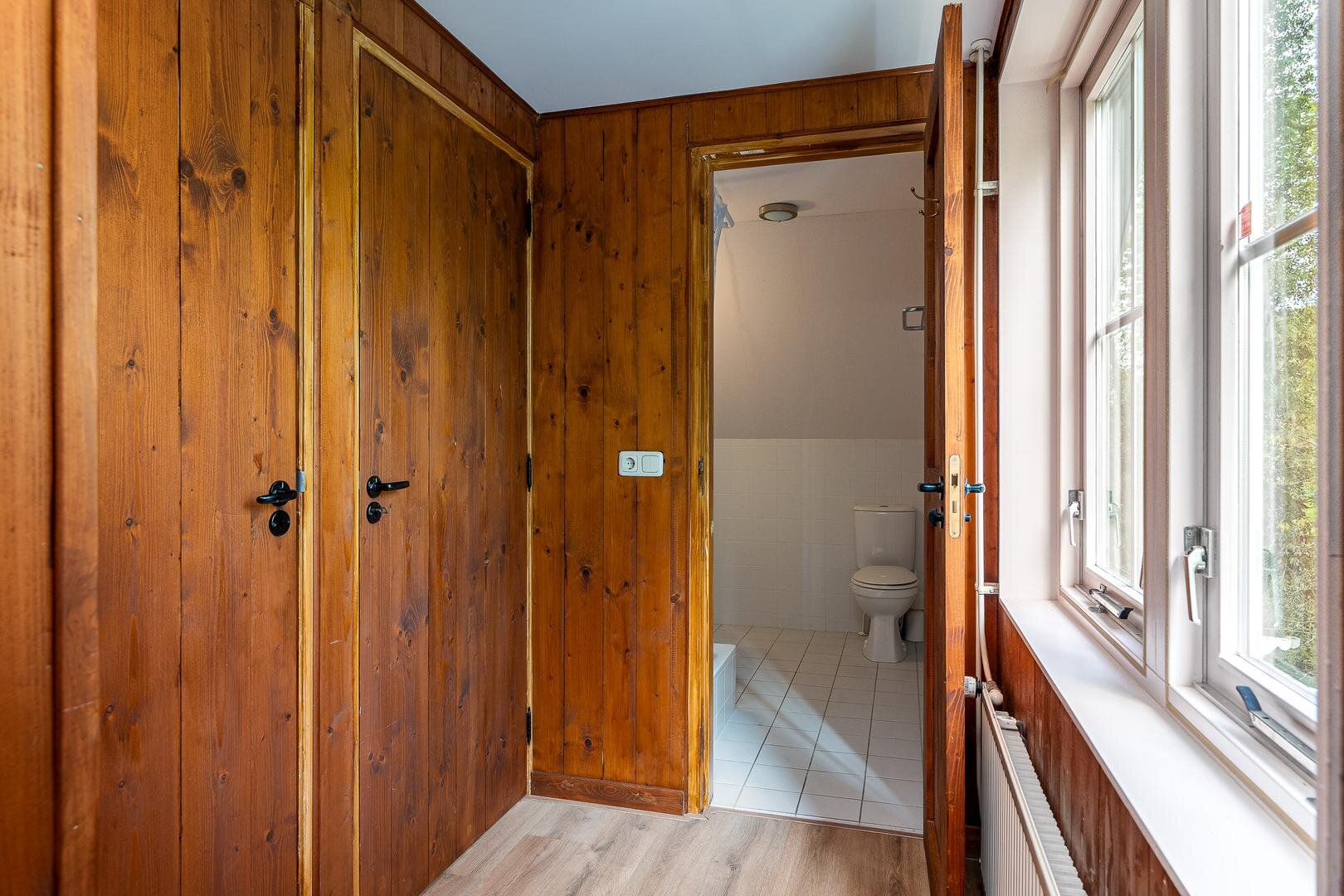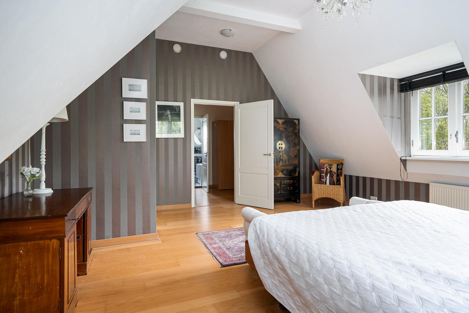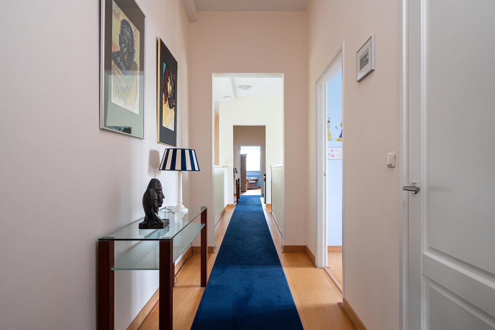 Via de vide kom je op de slaapverdieping met vijf slaapkamers, waaronder een masterbedroom met royale afmetingen. Daarnaast zijn er twee moderne badkamers, een aparte berging en een technische ruimte voor de verwarmingsinstallaties. Dankzij de slimme plaatsing van ramen valt het daglicht prachtig naar binnen, zónder concessies te doen aan privacy.