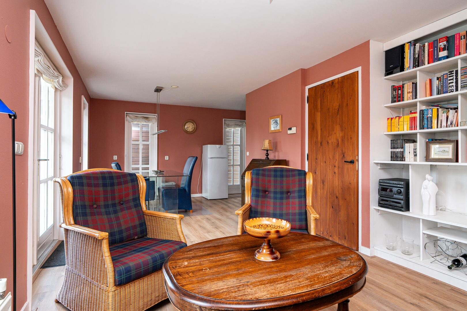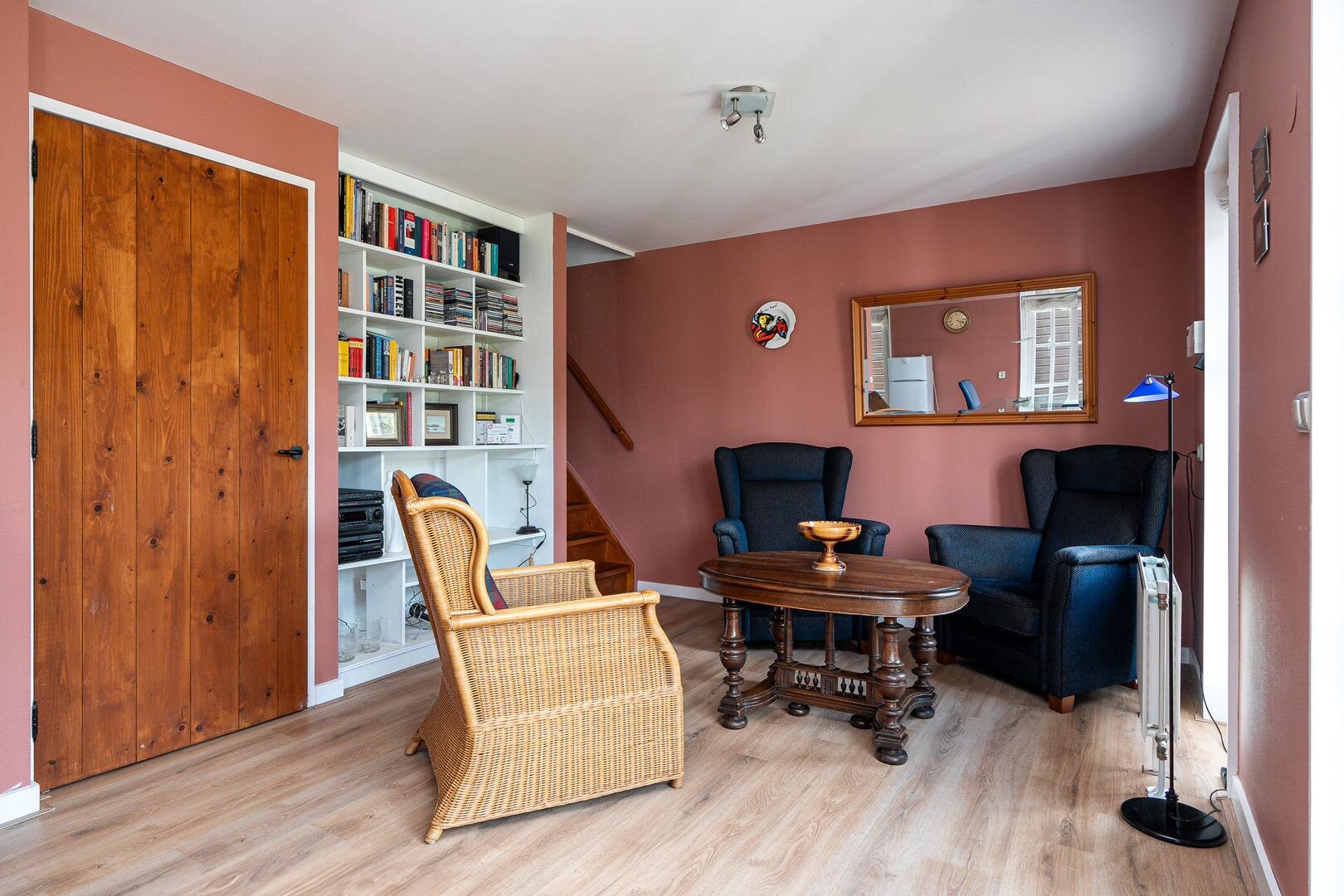 De woning beschikt over een gezellige woonkamer met open keuken, hal met toilet en trapopgang.