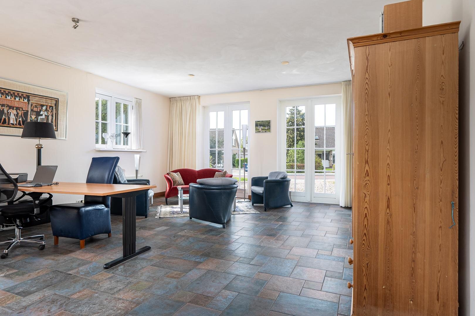 Op het perceel bevindt zich een losstaand en volledig ingericht guesthouse van ca. 65 m², perfect geschikt als kantoorruimte met eigen entree, zorgwoning, atelier, of als luxueuze verblijfplaats voor gasten.