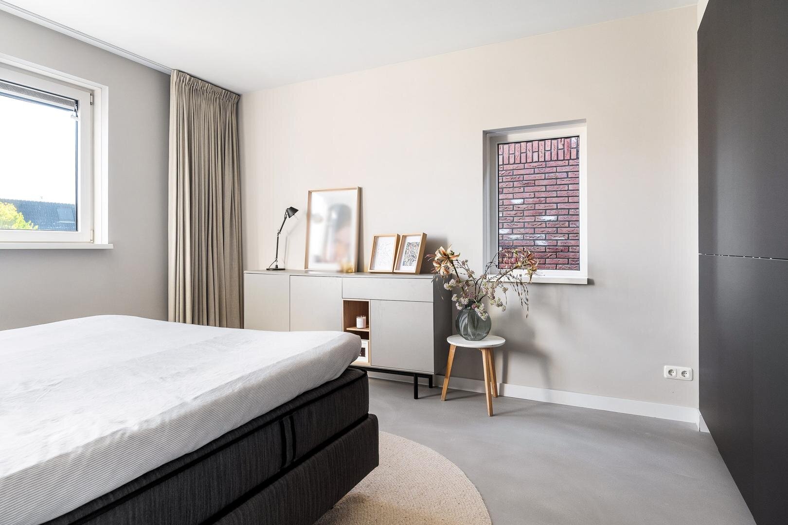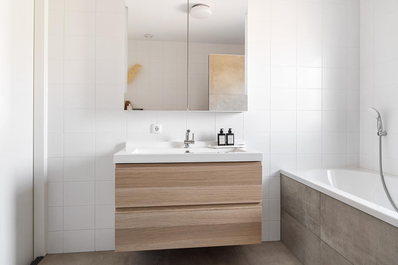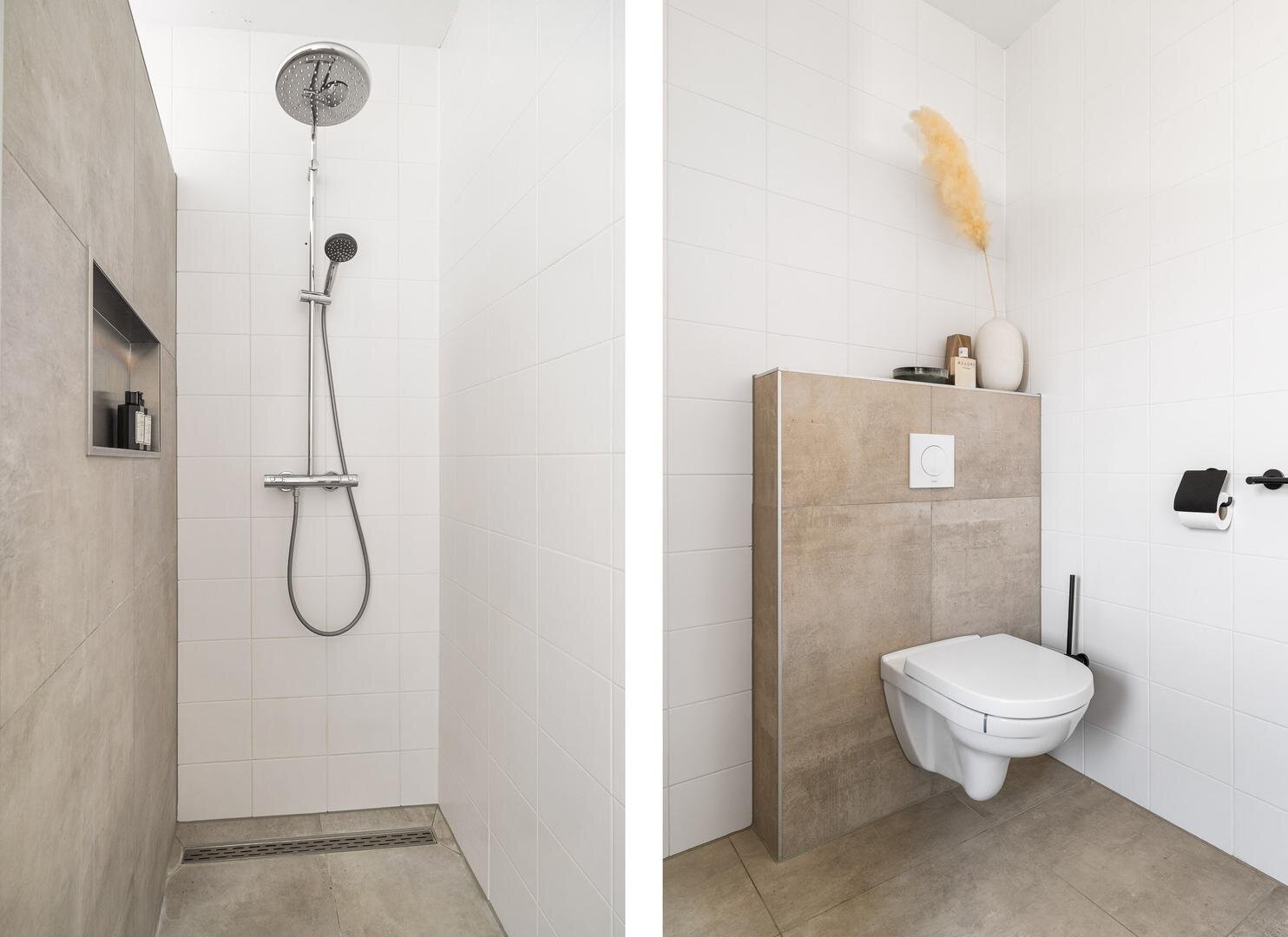 We gaan via de trap naar de overloop op de eerste verdieping. Hier is de strakke badkamer met inloopdouche, ligbad, wastafelmeubel en het tweede toilet. Verder vind je op de eerste verdieping drie ruime slaapkamers waarvan twee aan de achterzijde en een aan de voorzijde van de woning. De master bedroom heeft een ruime inbouwkast Ook hier weer overal vloerverwarming