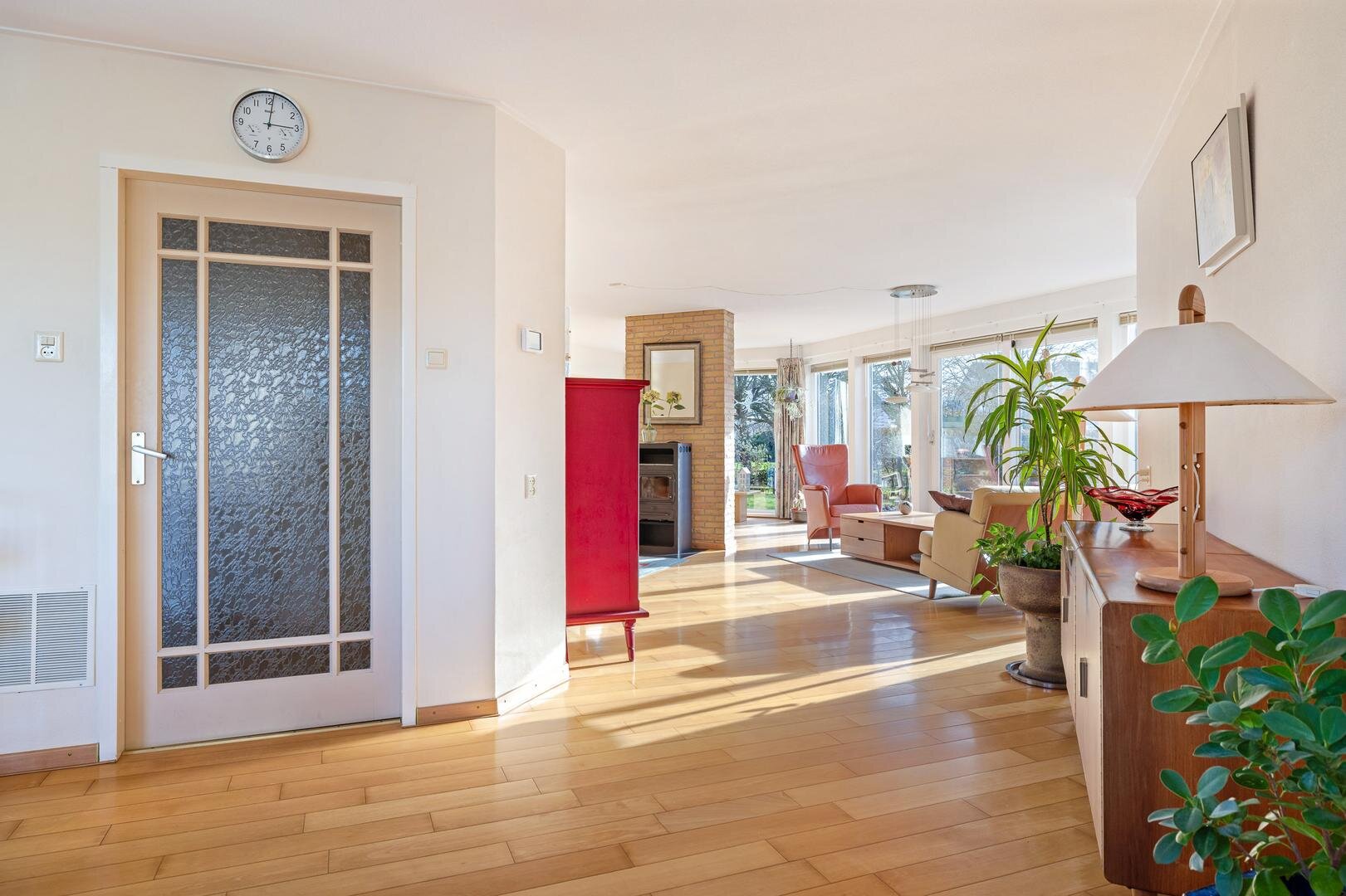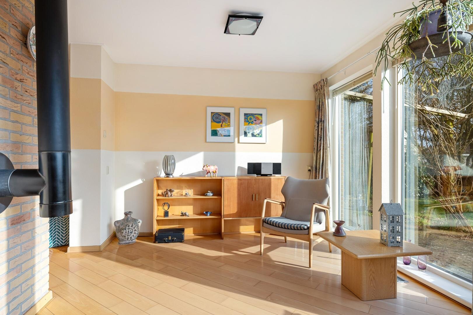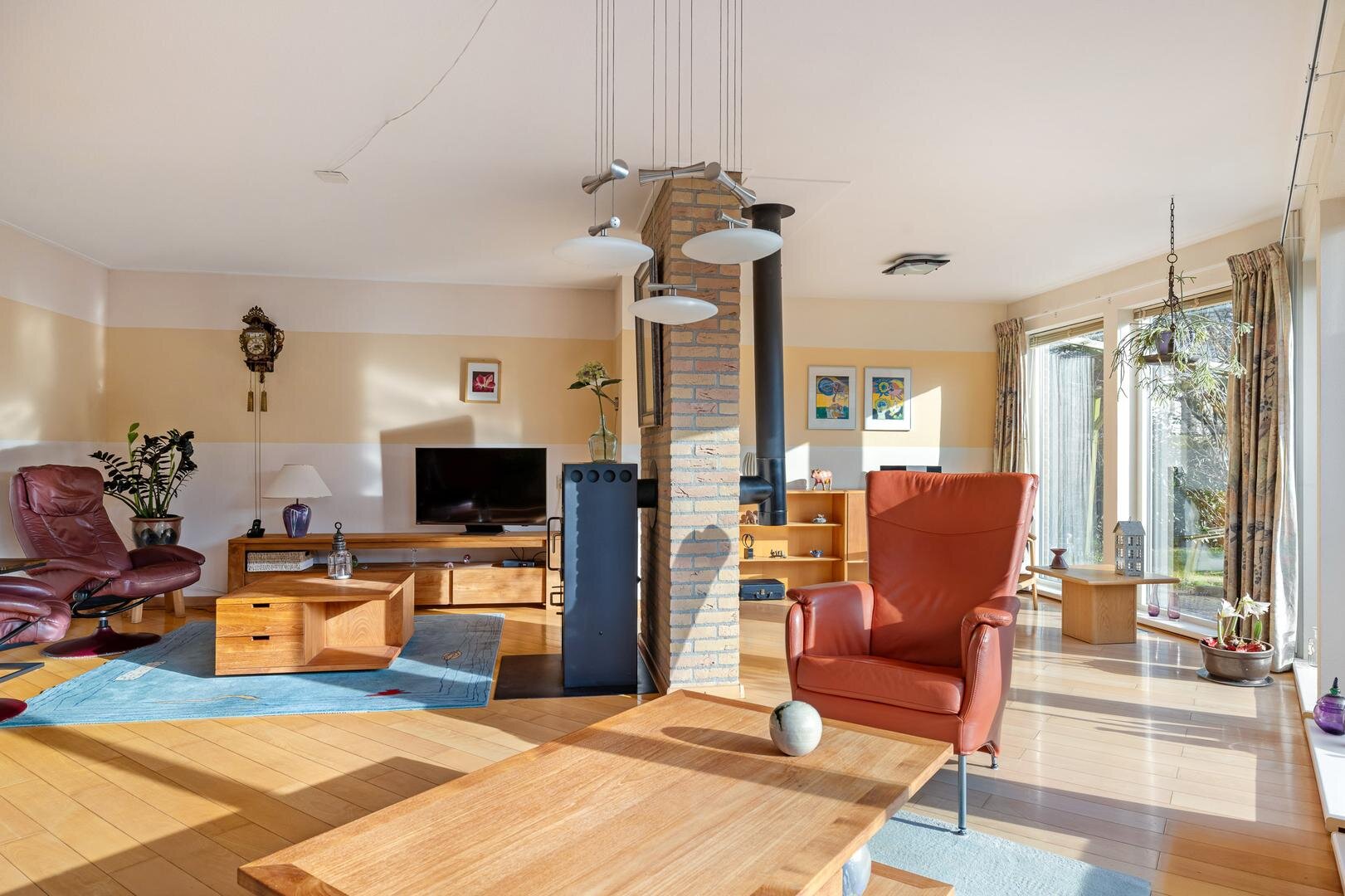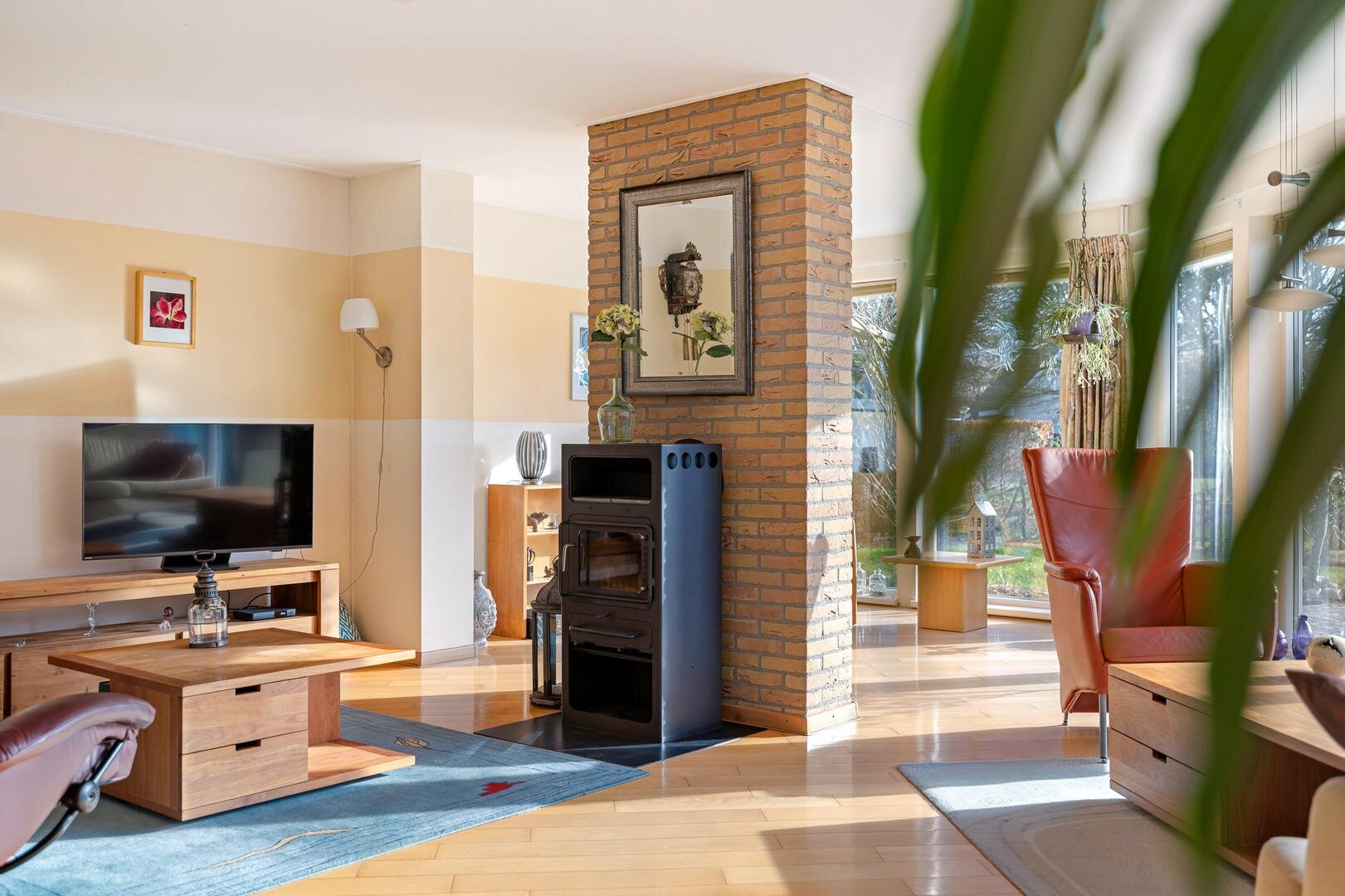 Via de hal met meterkast, separaat toilet en trapopgang bereik je de royale woonkamer. De vergrote serre – direct bij de bouw gerealiseerd – zorgt voor extra leefruimte en een prachtige lichtinval. Dankzij de indeling is er ruimte voor meerdere zithoeken. De woonkamer is voorzien van een fraaie lamelparketvloer en een sfeervolle houtkachel.