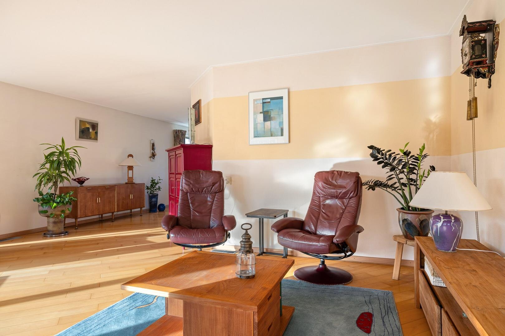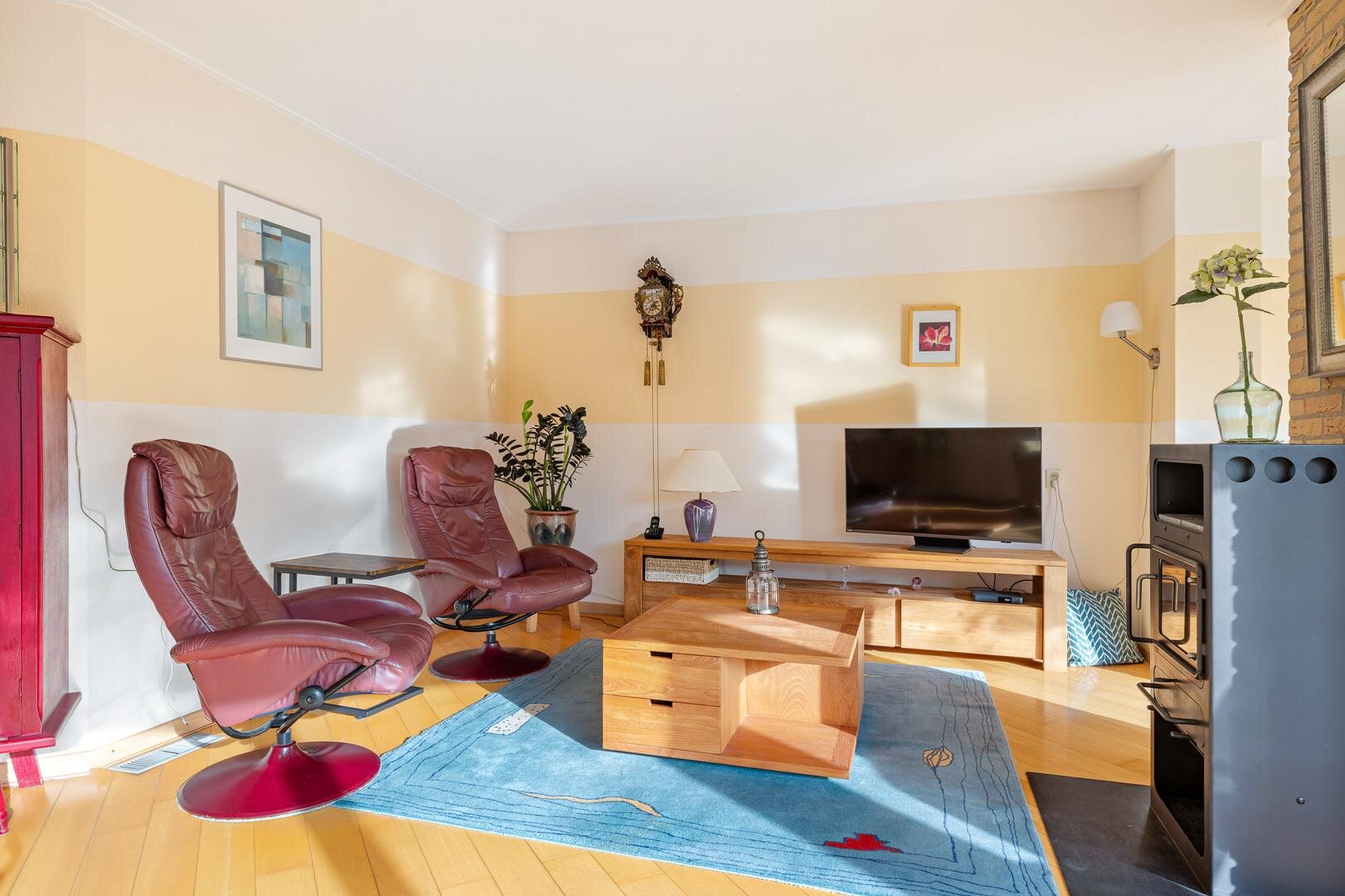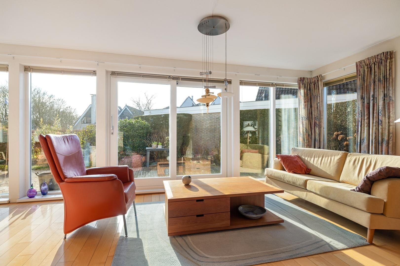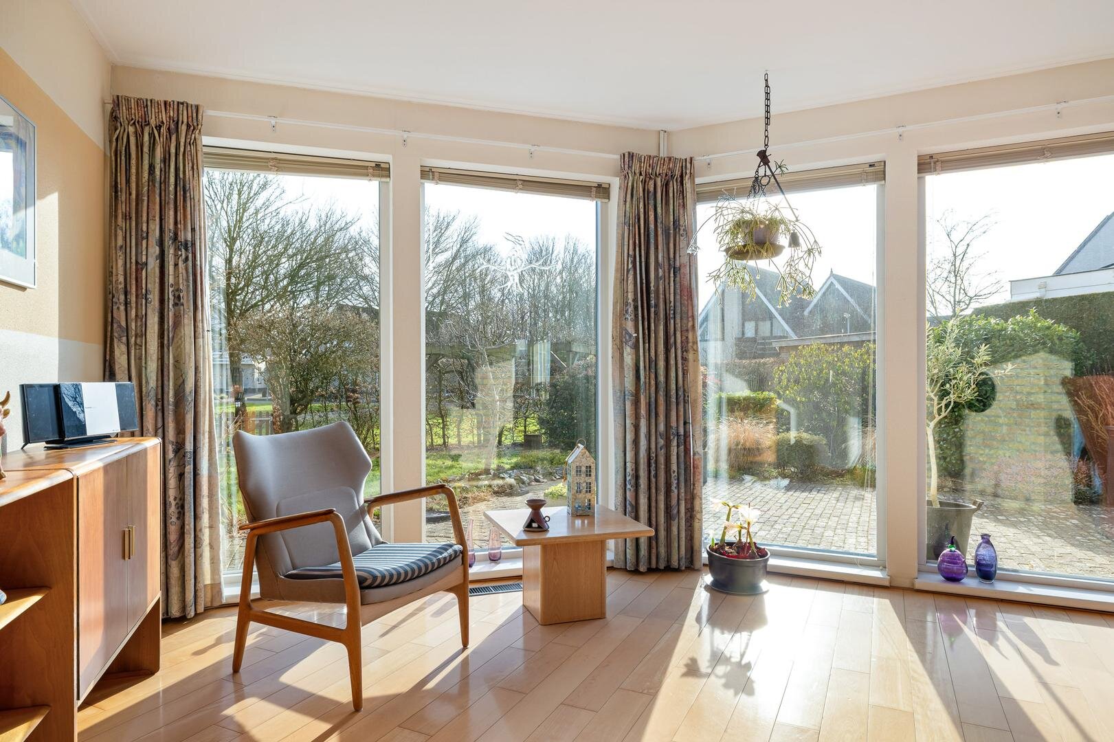 Via de hal met meterkast, separaat toilet en trapopgang bereik je de royale woonkamer. De vergrote serre – direct bij de bouw gerealiseerd – zorgt voor extra leefruimte en een prachtige lichtinval. Dankzij de indeling is er ruimte voor meerdere zithoeken. De woonkamer is voorzien van een fraaie lamelparketvloer en een sfeervolle houtkachel.