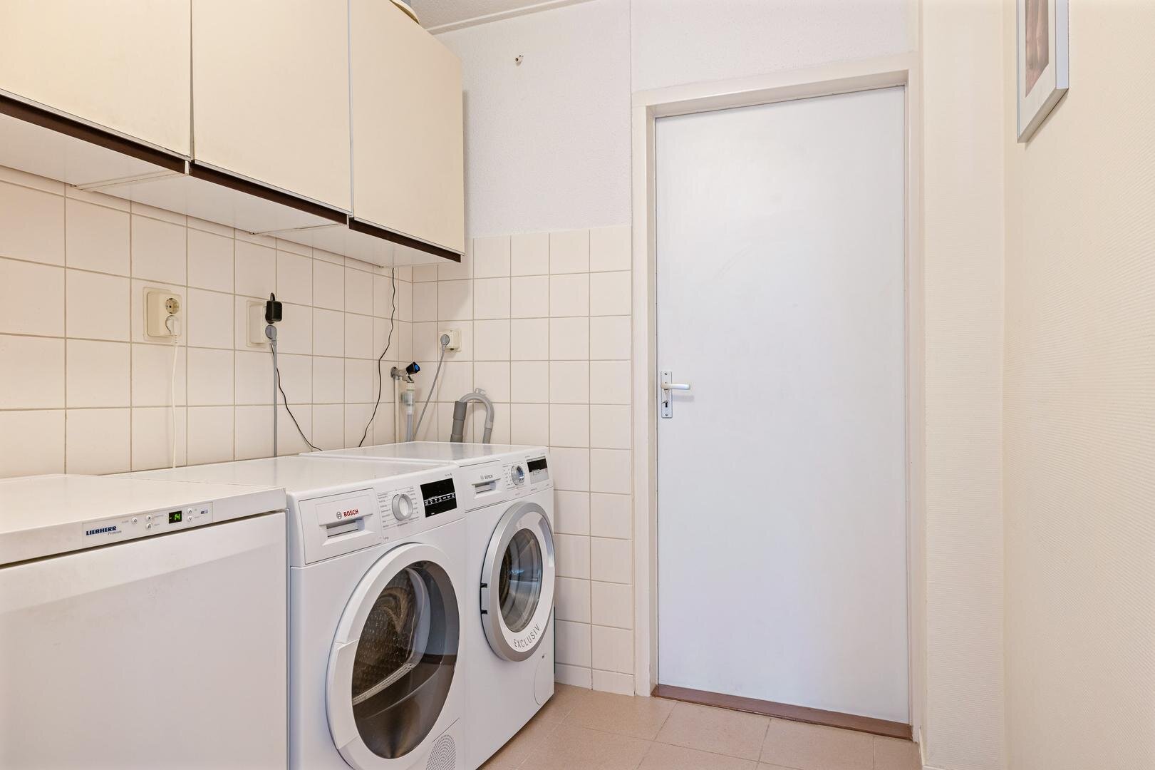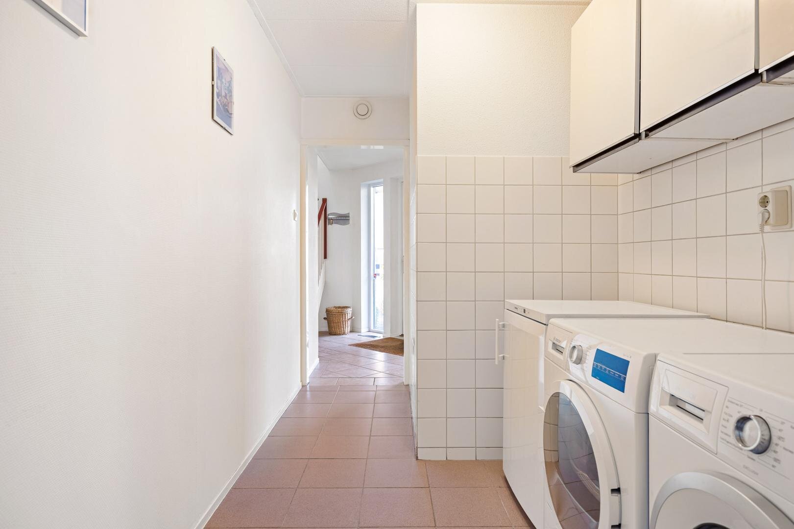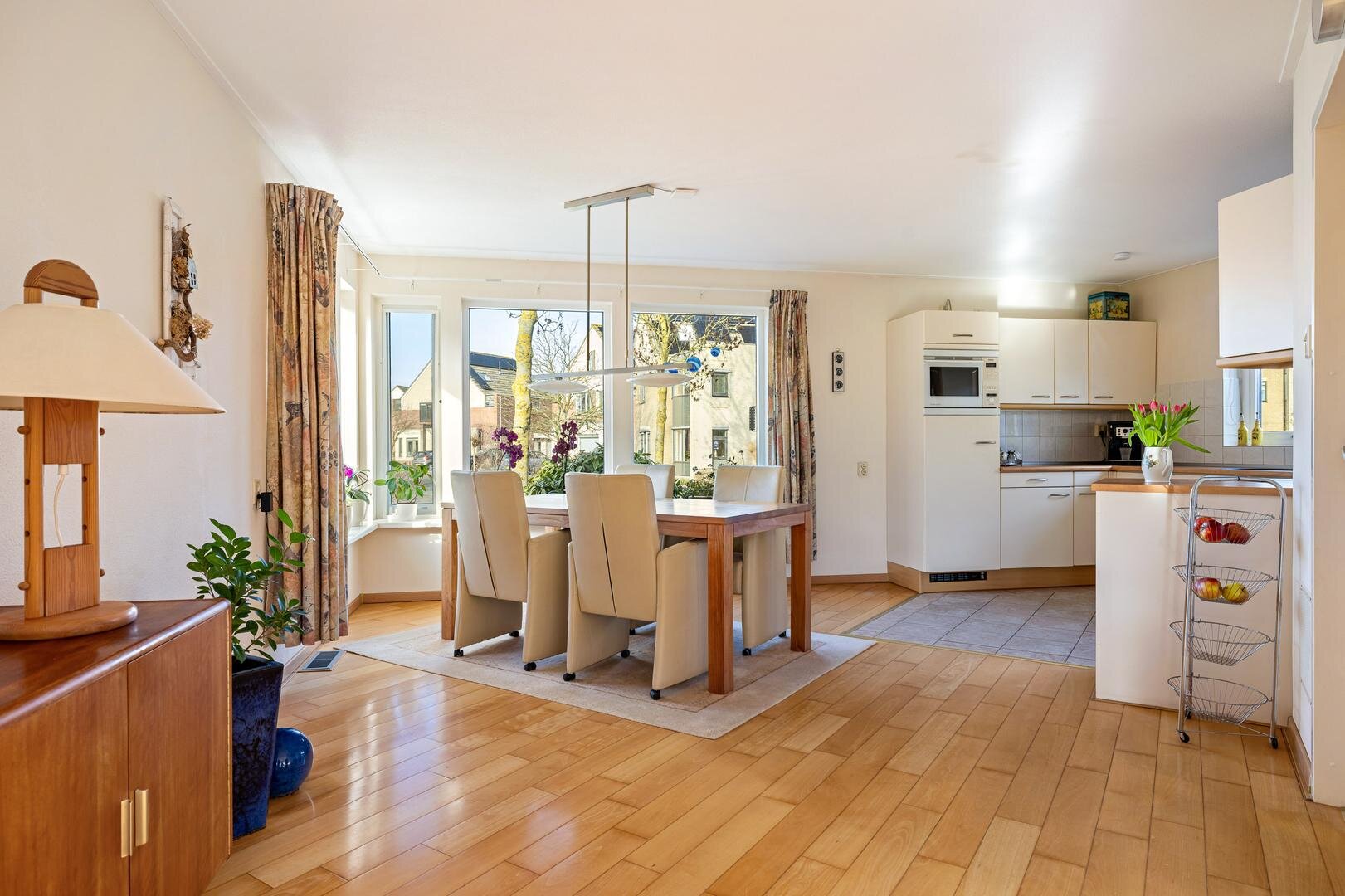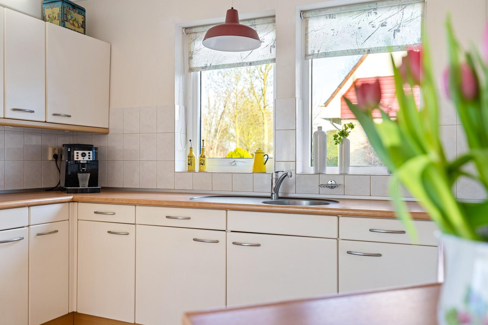 De keuken is uitgevoerd in de stijl van het bouwjaar en beschikt over onder andere een inductiekookplaat en combi-oven. Vanuit de hal is er toegang tot de praktische bijkeuken met witgoedaansluitingen en doorgang naar de garage.