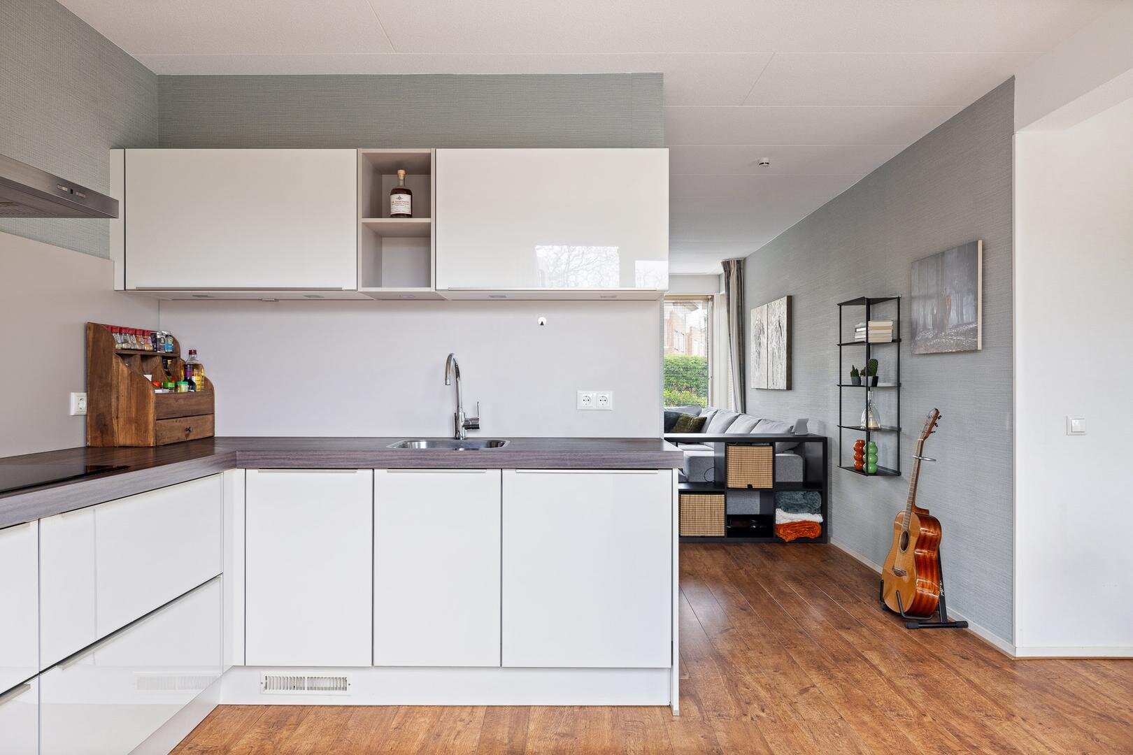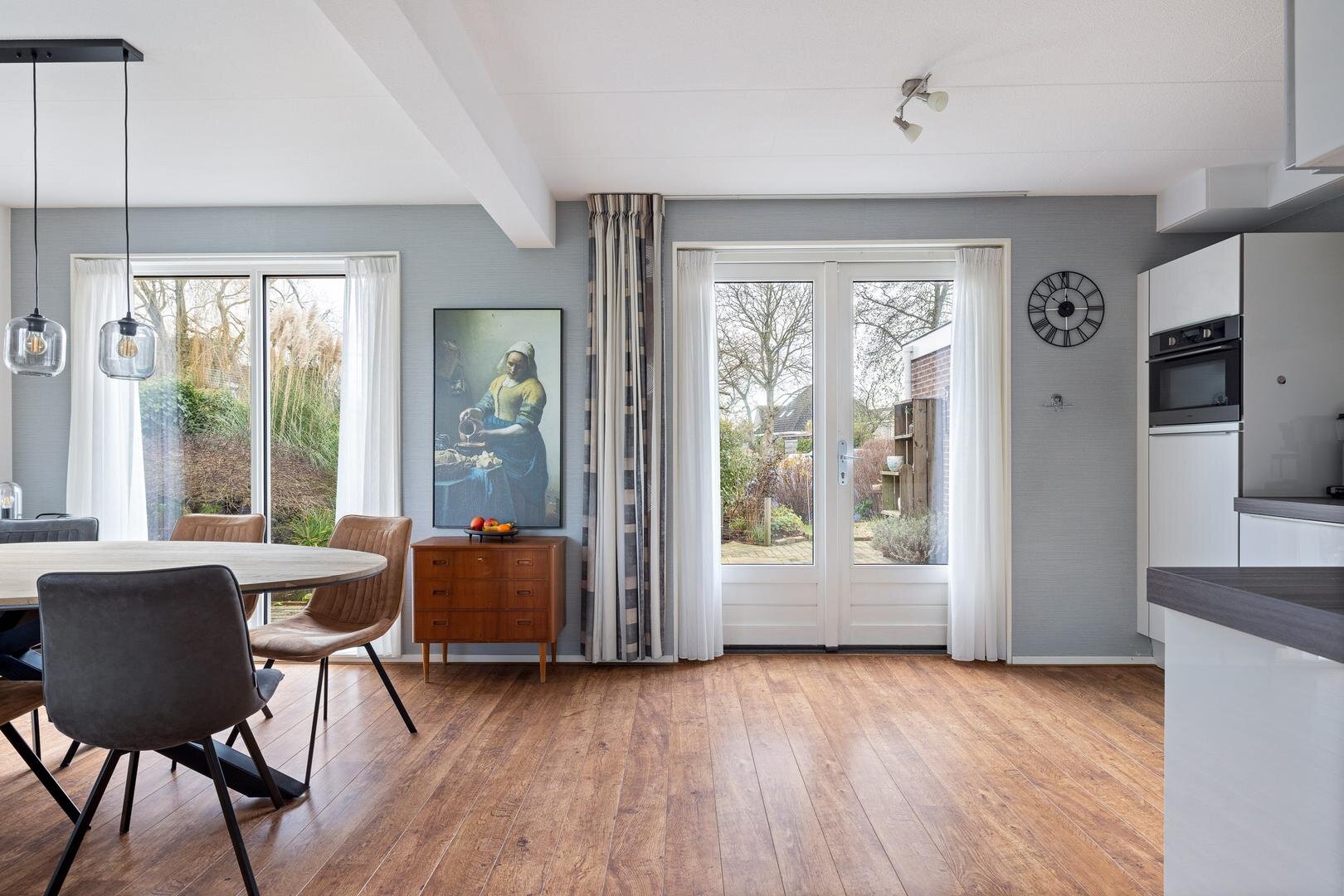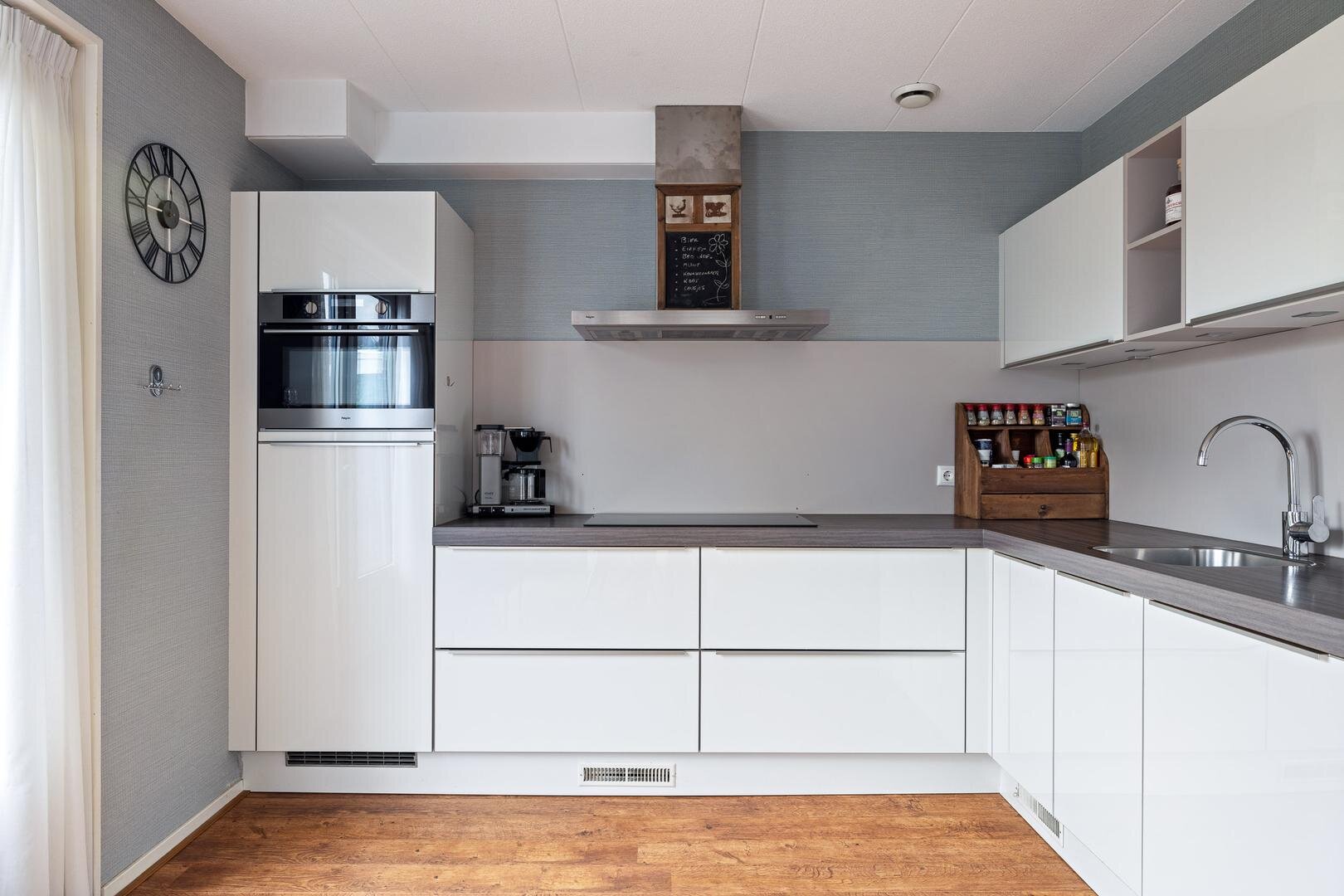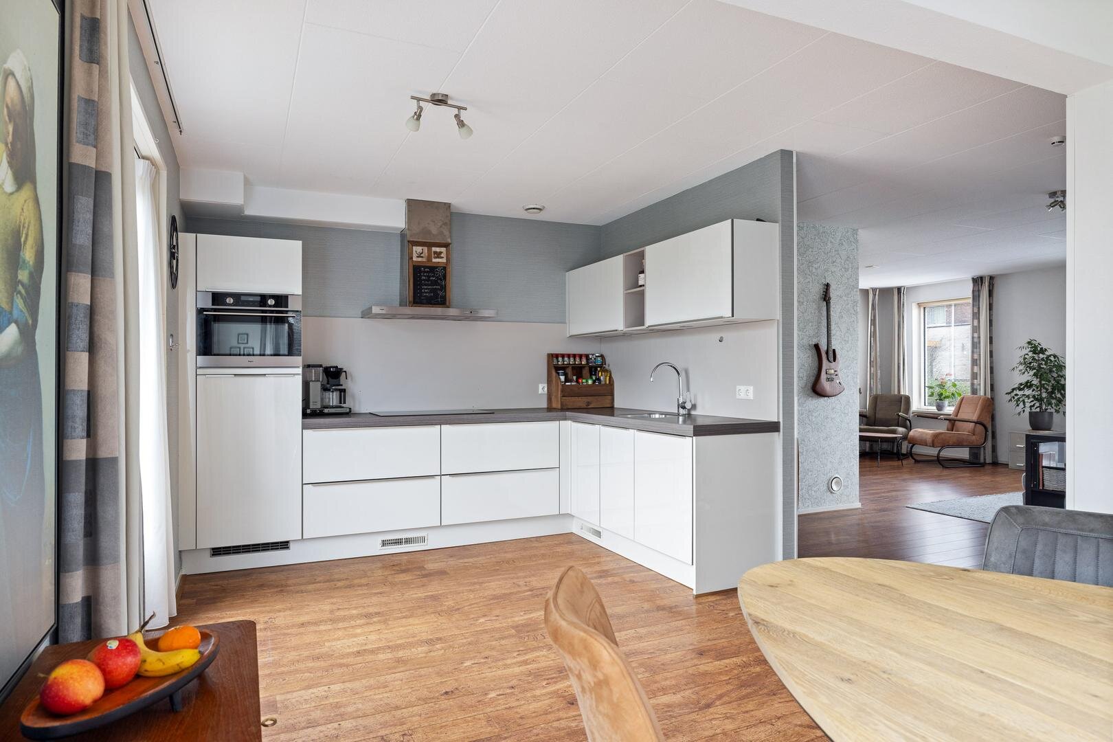 Via de zij-entree komt u in de hal met toilet (fonteintje) en mechanische ventilatie. De lichte woonkamer heeft een prettige sfeer en een nette laminaatvloer. De uitgebouwde woonkeuken beschikt over tuindeuren naar de zonnige achtertuin (west) en een moderne Bruynzeel keuken (2017) in hoekopstelling met inbouwapparatuur.