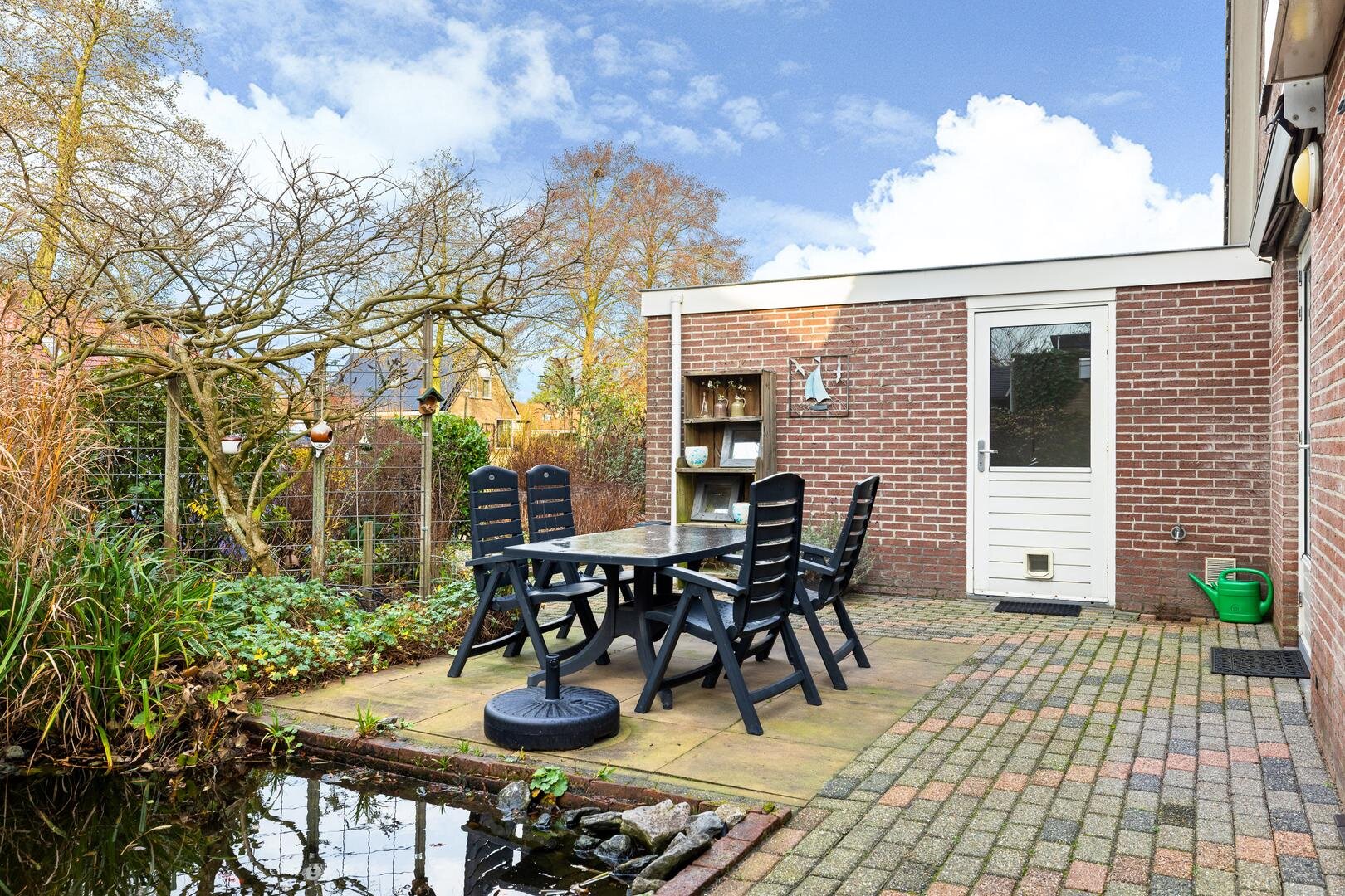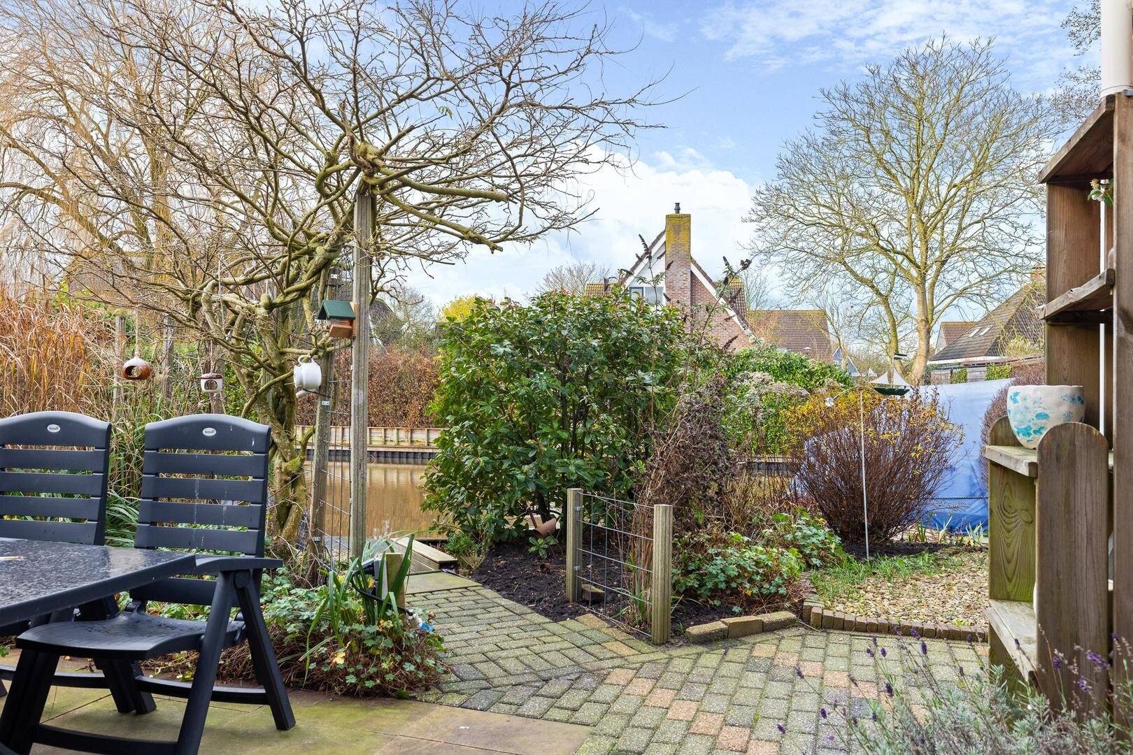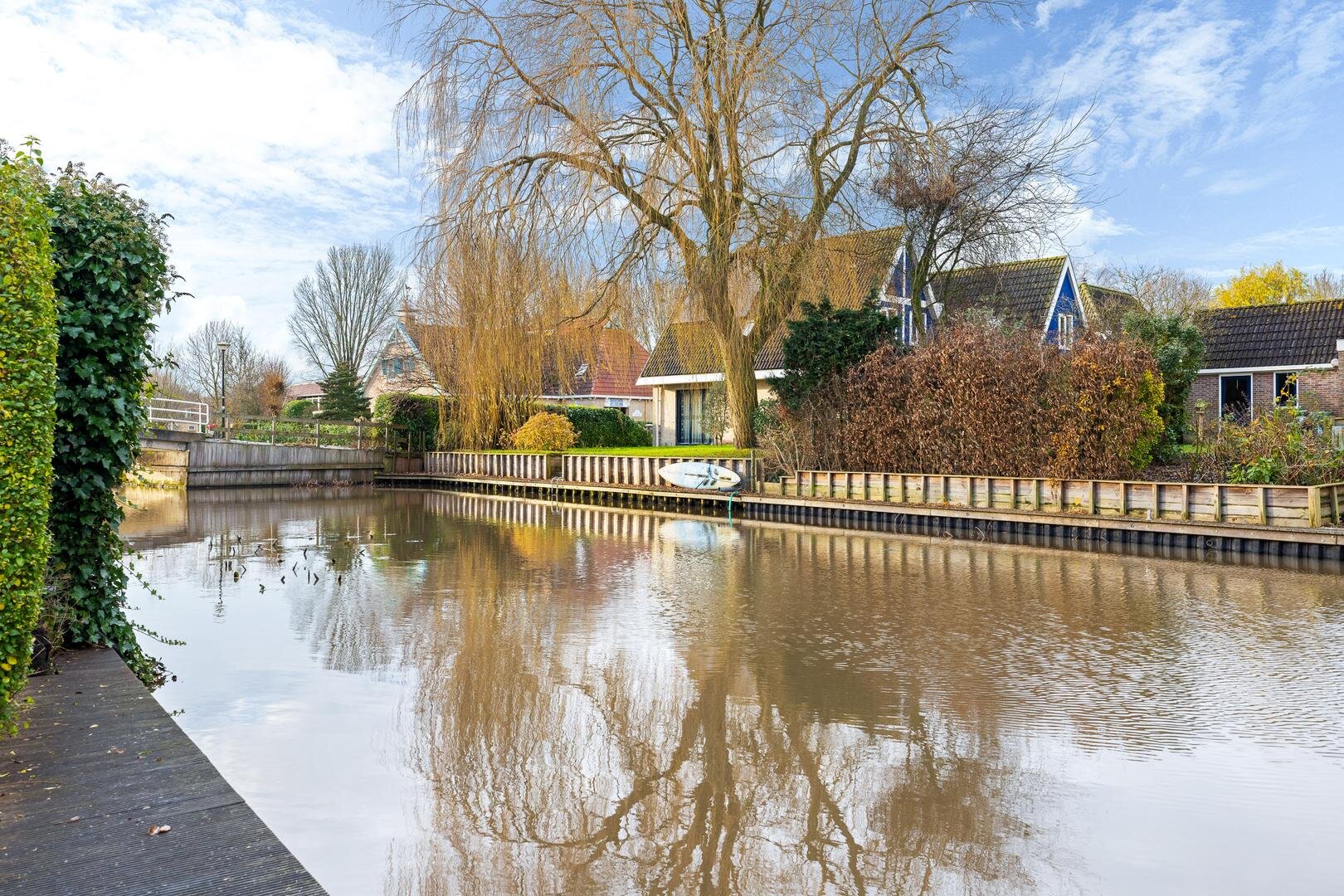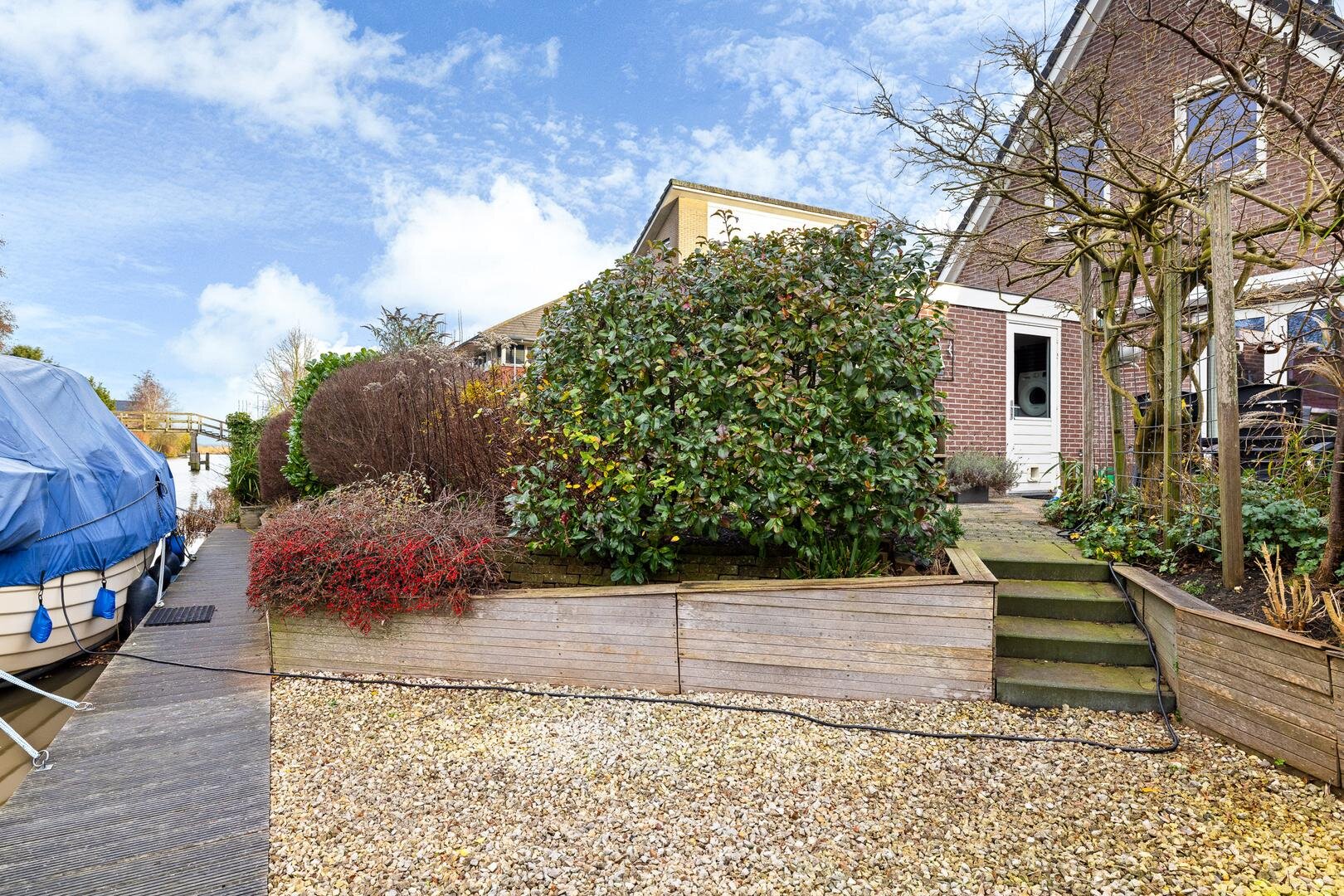 De zonnige achtertuin op het westen biedt veel privacy en grenst direct aan open vaarwater. Hier beschikt u over een eigen aanlegsteiger van circa 15 à 20 meter, met vernieuwde walbeschoeiing (2018). Ideaal voor varen, suppen of gewoon genieten aan het water. De brughoogte van ca. 2,50 meter maakt het vaargebied uitstekend toegankelijk.