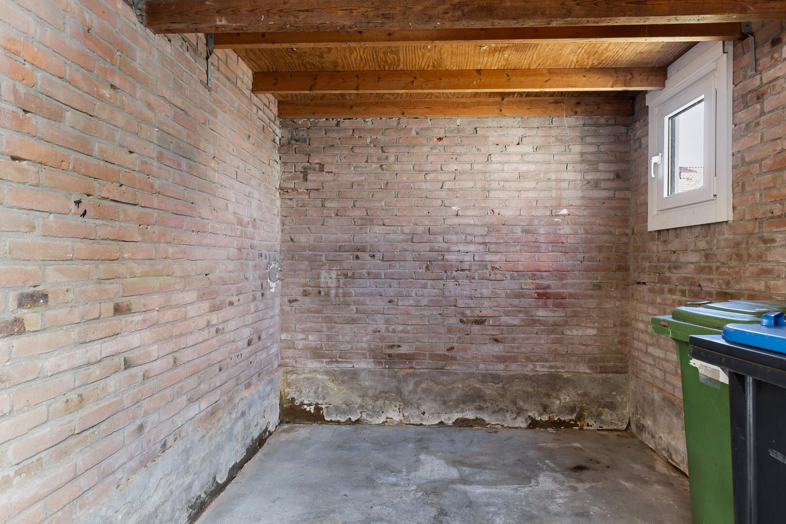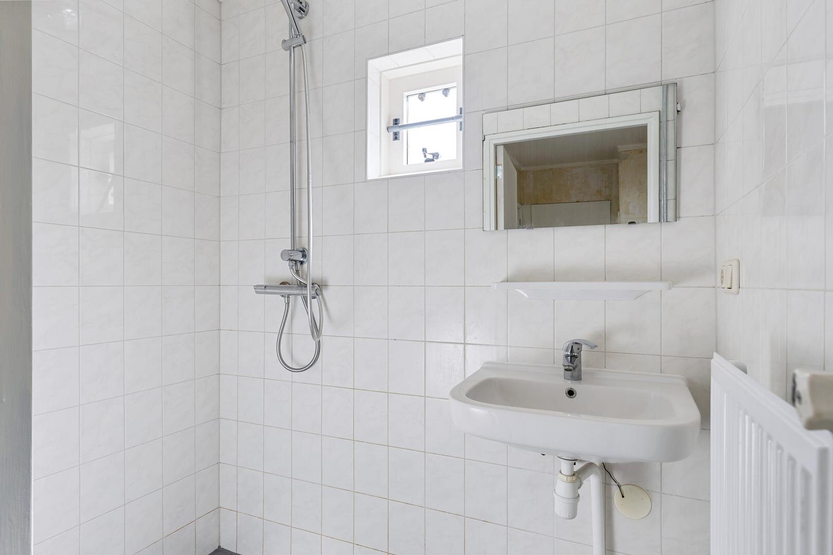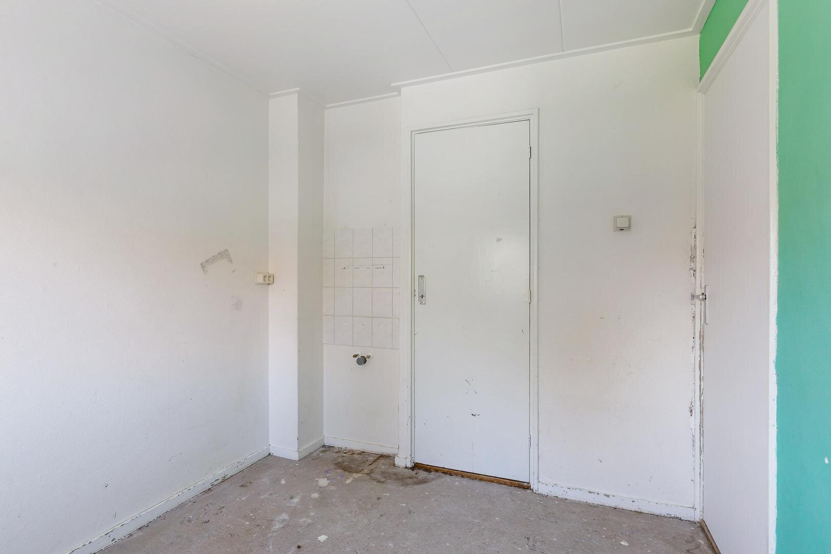 De keuken is eenvoudig uitgevoerd en staat in verbinding met de woonkamer. Vanuit de keuken heb je toegang tot de aangebouwde berging, ideaal voor extra opslag of het stallen van fietsen.
