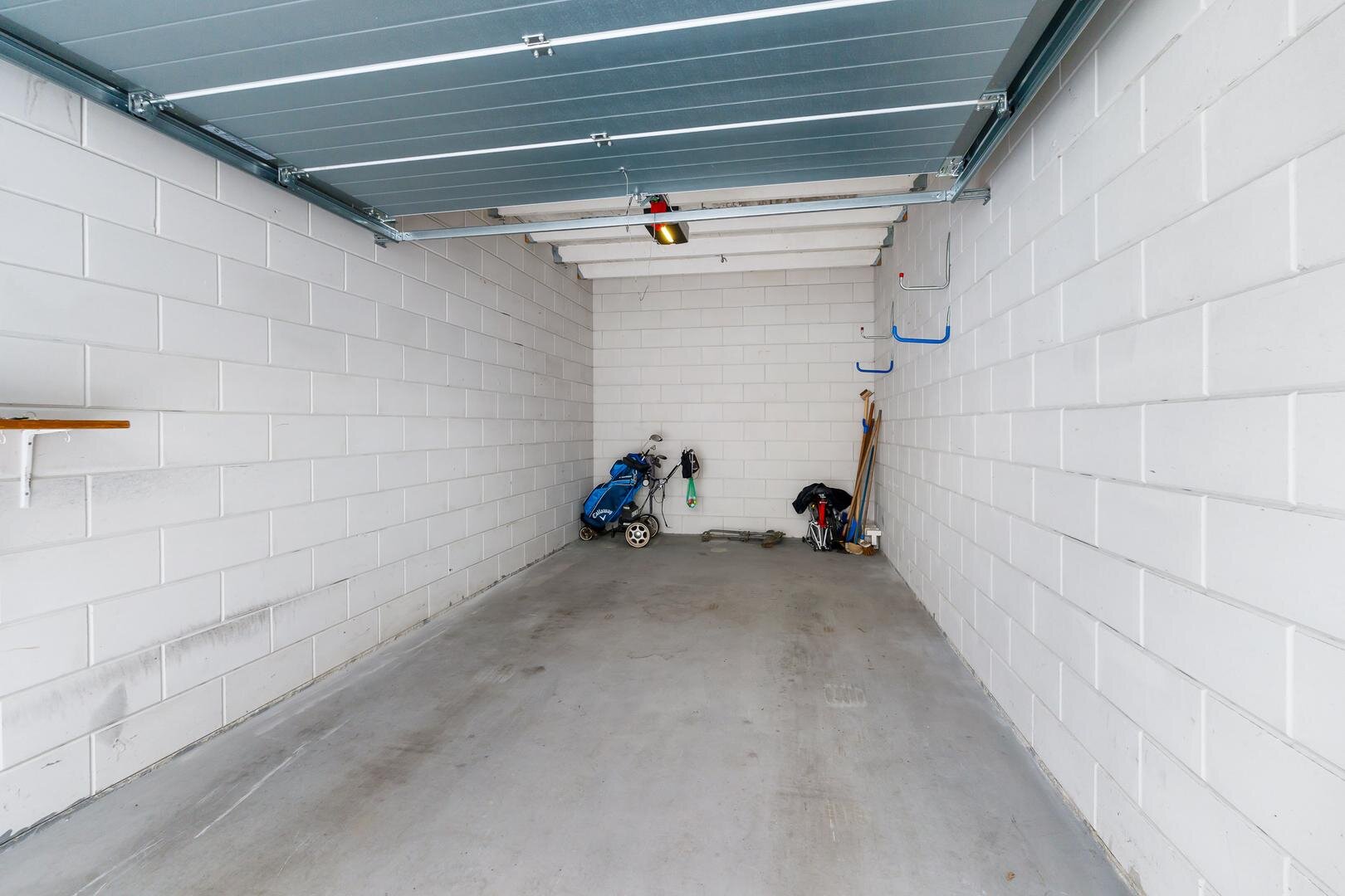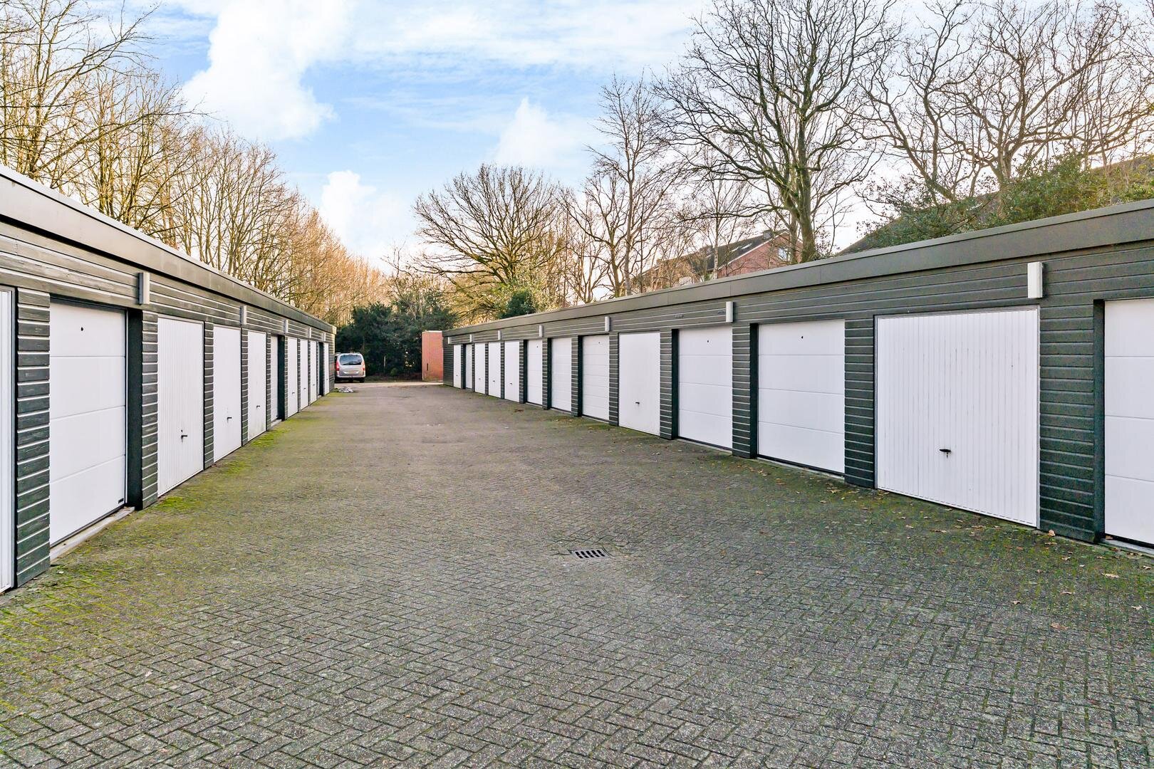 - Een garagebox met elektrische deur aan de overkant van de straat;