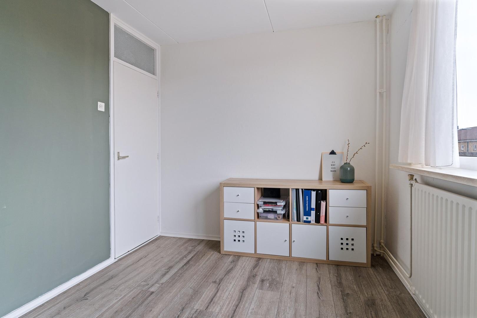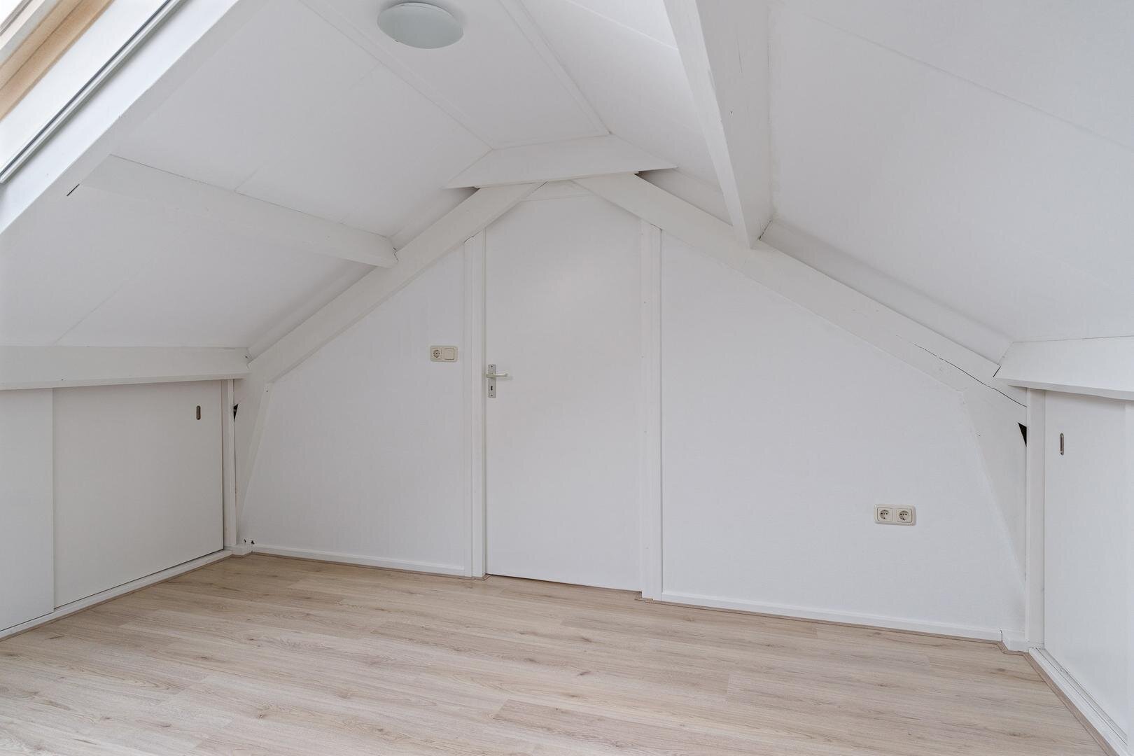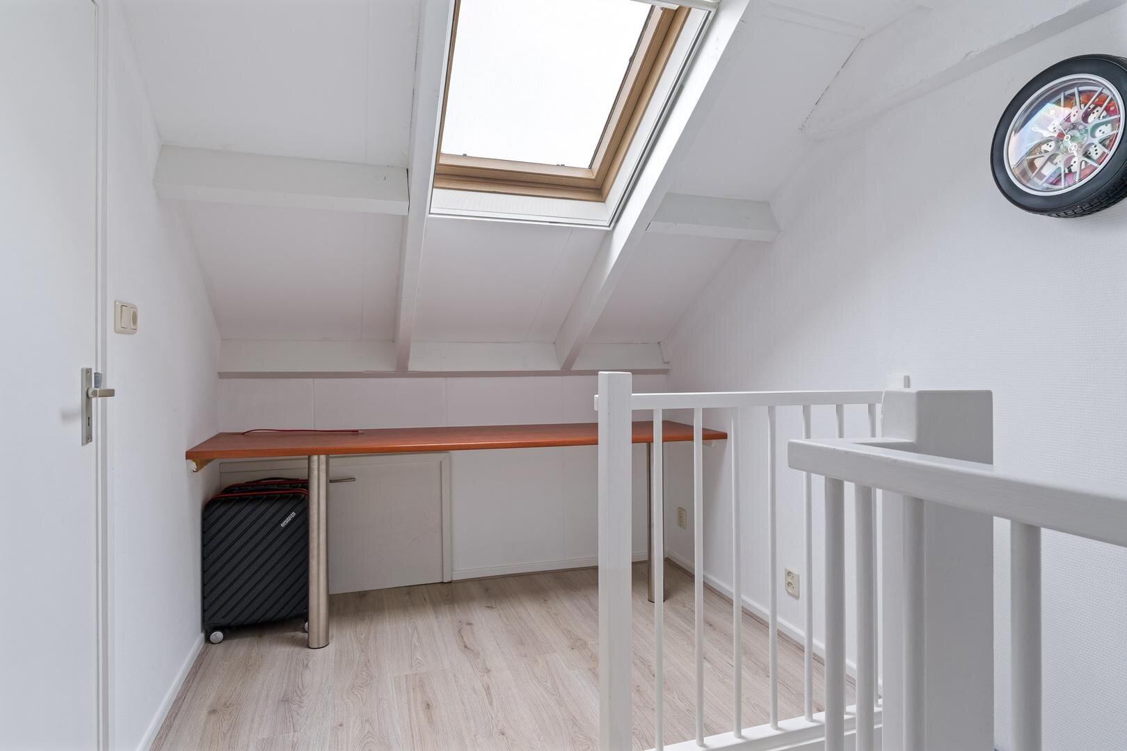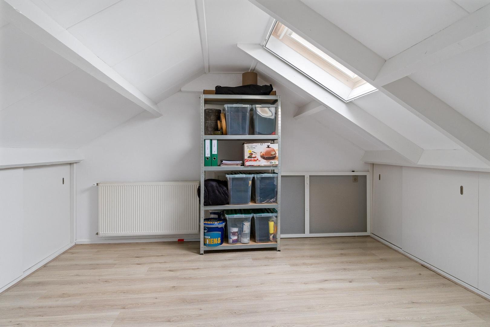 Via de vaste trap bereik je de tweede verdieping. Hier bevindt zich de vierde slaapkamer, voorzien van een Velux dakraam en verrassend veel opbergruimte achter de knieschotten. Op deze verdieping hangt ook de omvormer van de zonnepanelen. Verder is er een praktische vliering voor seizoensspullen en extra opslag.