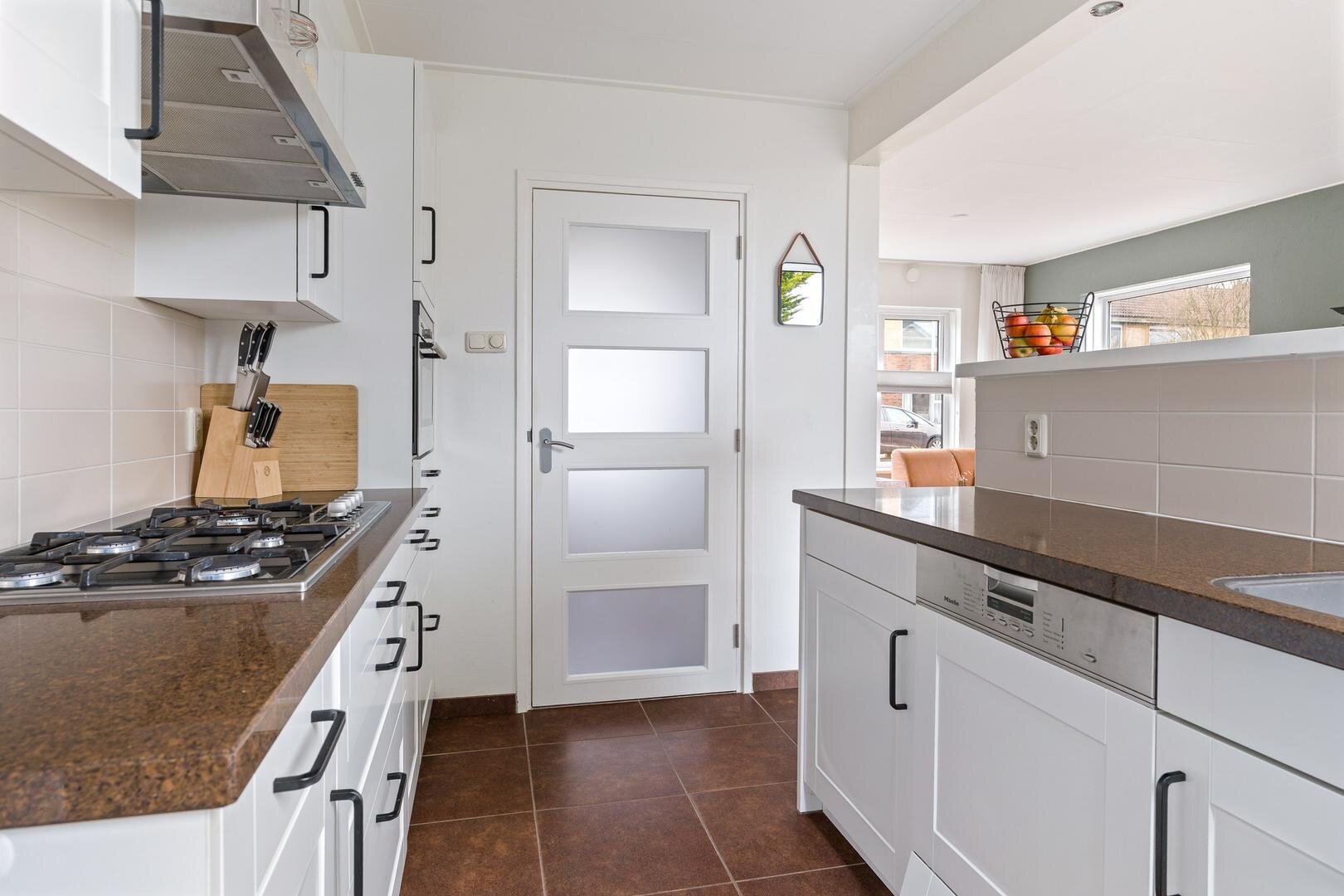Via de verzorgde voortuin stap je binnen in de hal. Hier vind je de meterkast met vernieuwde groepen, een praktische kelderkast, het moderne hangtoilet en de trapopgang naar boven. Vanuit de hal kom je in de woonkamer, een lichte ruimte dankzij de grote raampartijen, met voldoende plek voor zowel een comfortabele zithoek als een eethoek. De halfopen keuken sluit hier mooi op aan en is voorzien van een vaatwasser, combi-oven en gaskookplaat. De keuken vormt een nette, functionele basis en biedt volop mogelijkheden om deze naar eigen smaak verder te moderniseren.