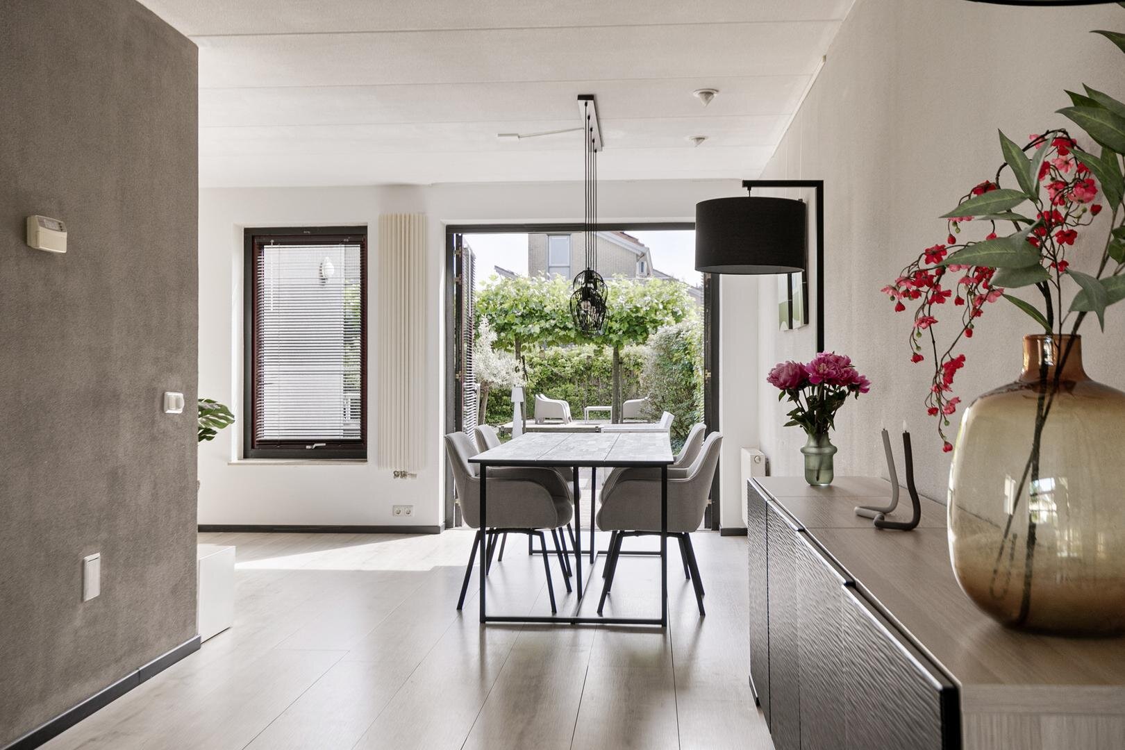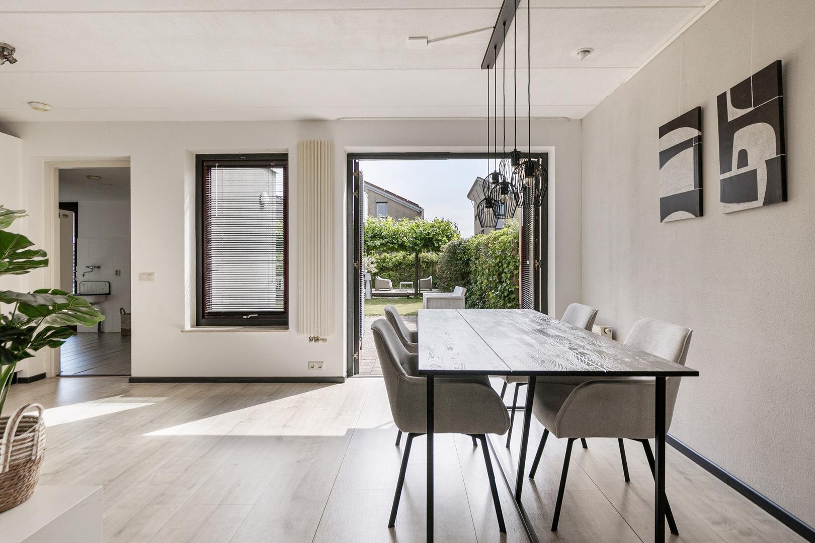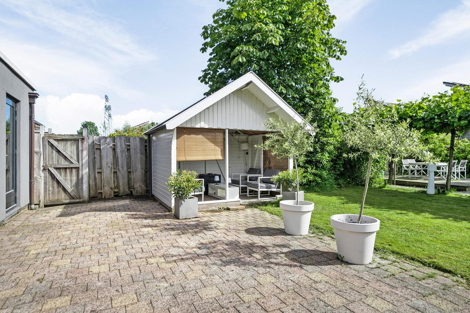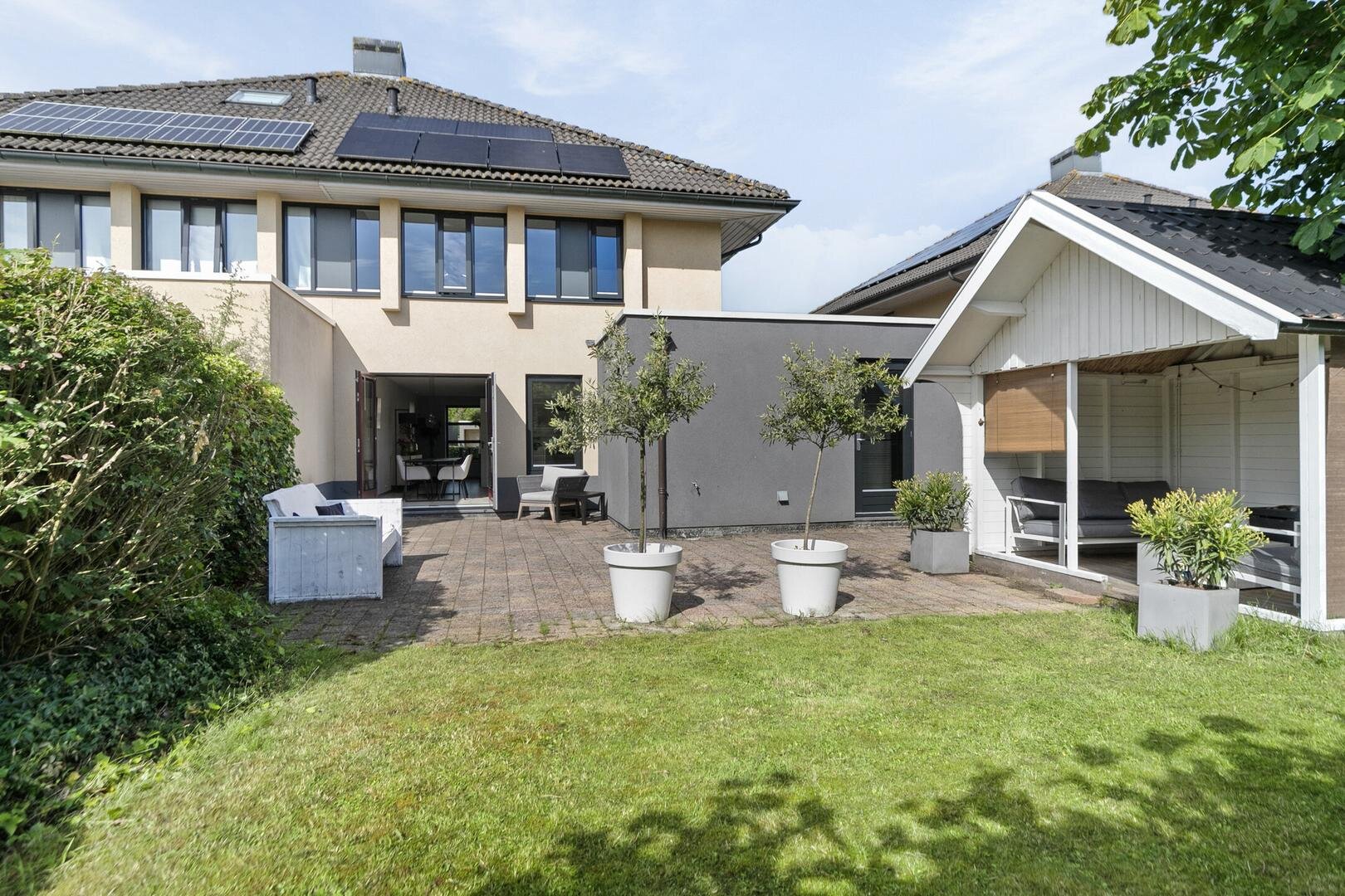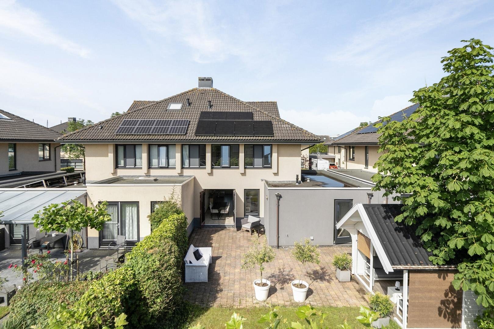 Je komt binnen in de ruime hal met vide. Hier bevindt zich een garderobe, meterkast en het eerste toilet. De woonkamer heeft door de hoge raampartijen een prachtige lichtinval en is voorzien van een lichte hardhouten vloer. De open keuken is voorzien van de nodige inbouwapparatuur zoals een vaatwasser, combi-oven, 5-pits gasfornuis, afzuigkap en koelkast. Via de aangrenzende bijkeuken is er een directe toegang tot de garage en ook tot de tuin. De openslaande deuren in de woonkamer zorgen voor een prachtige verbinding met de tuin. De prachtig aangelegde tuin heeft meerdere zitjes en zo is er op ieder moment van de dag wel een plekje in de zon of in de schaduw te vinden. In de tuin staat mooie overkapping waar het zomerdag heerlijk toeven is. Parkeergelegenheid is er te over op de oprit maar ook in de inpandige garage kun je de auto kwijt.