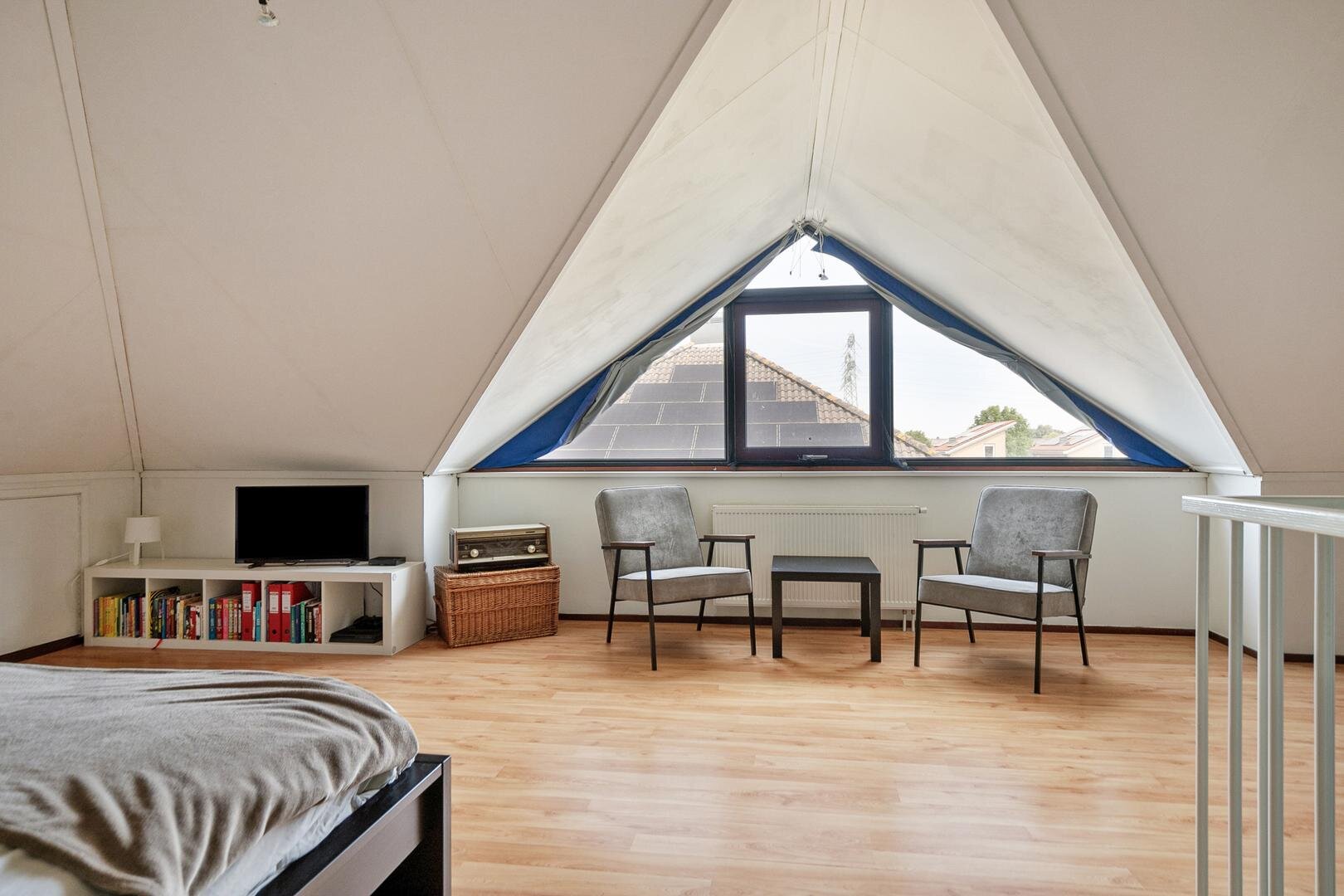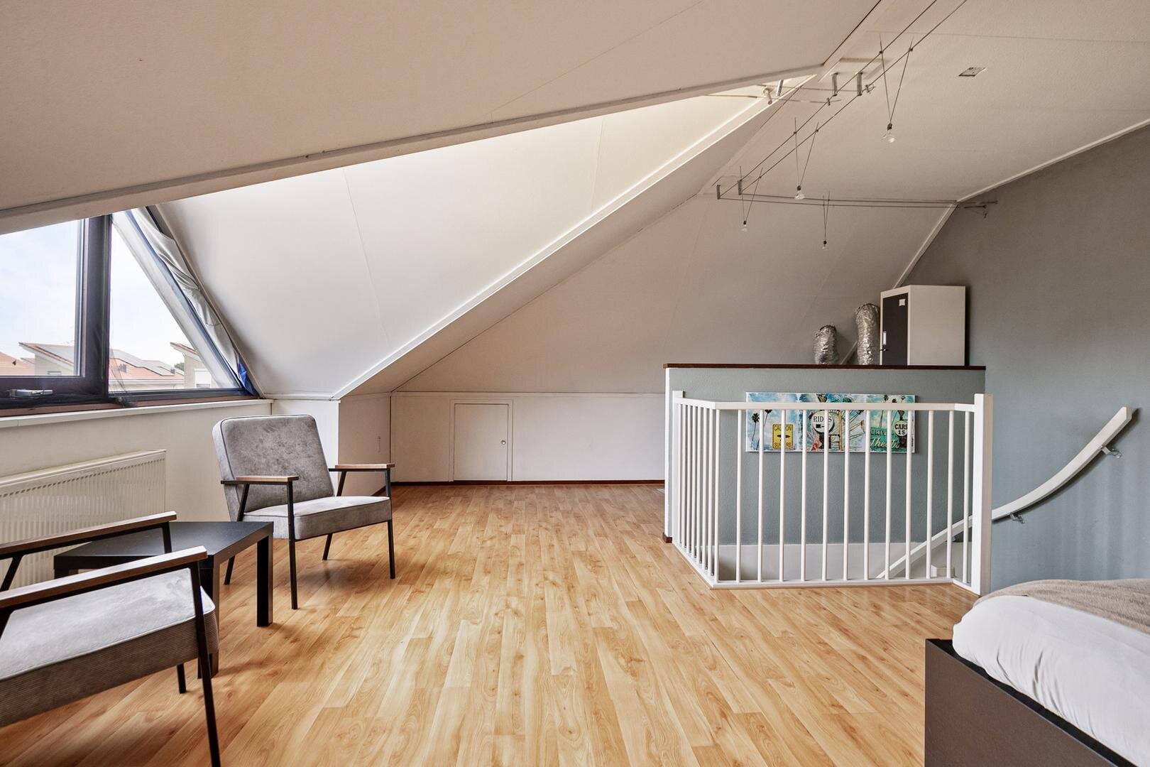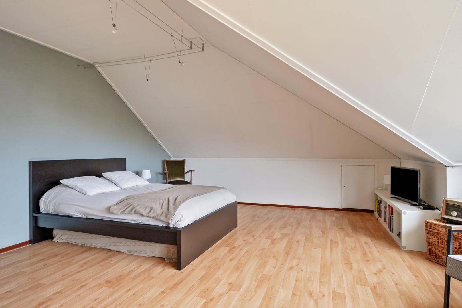 Via weer een vaste trap bereik je de tweede verdieping. Dit is een enorme ruimte die nu als slaapkamer in gebruik is. Met een kleine aanpassing is deze ruimte eenvoudig aan te passen naar twee slaapkamers. De grote raampartijen in de dakkapel zorgen voor een aangename ruimte met een mooie lichtinval.