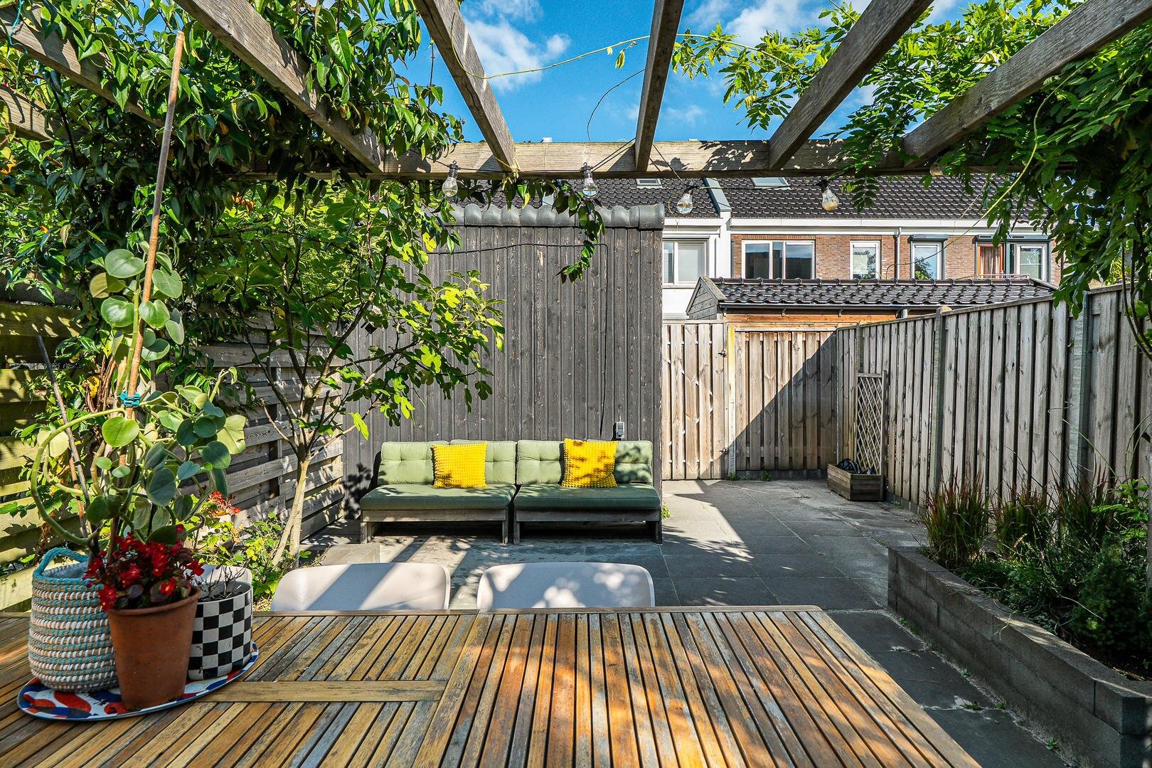 Fraai aangelegde tuin met pergola, schuur met elektra en achterom