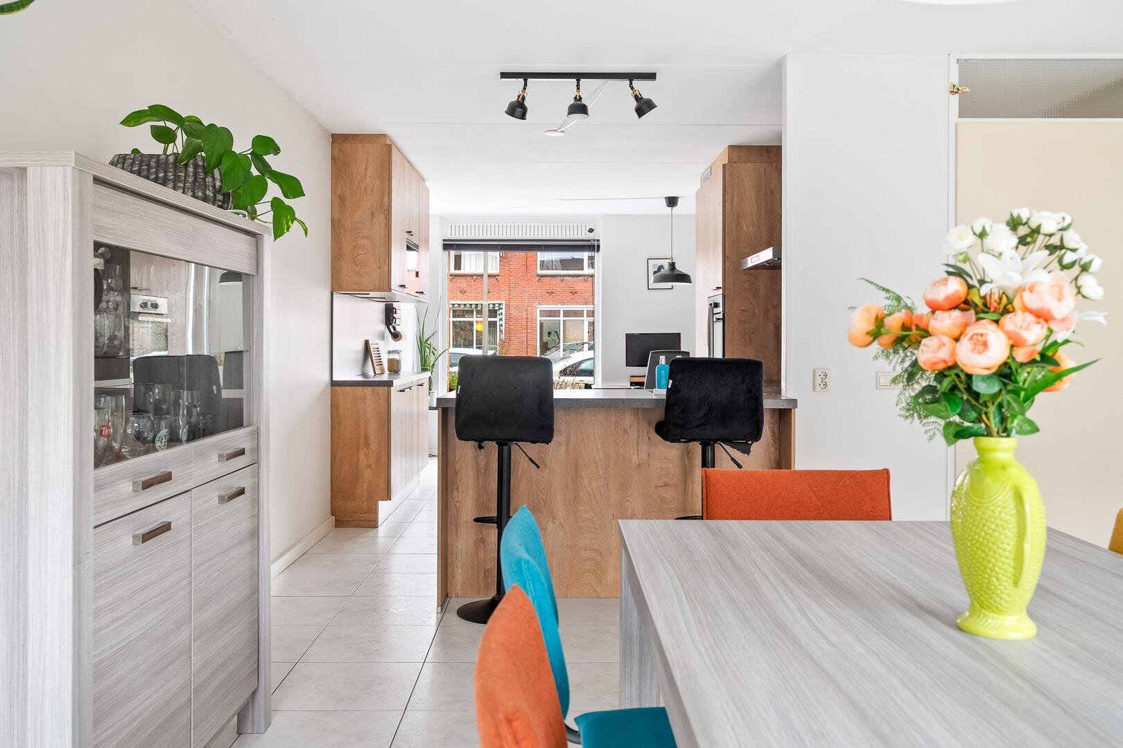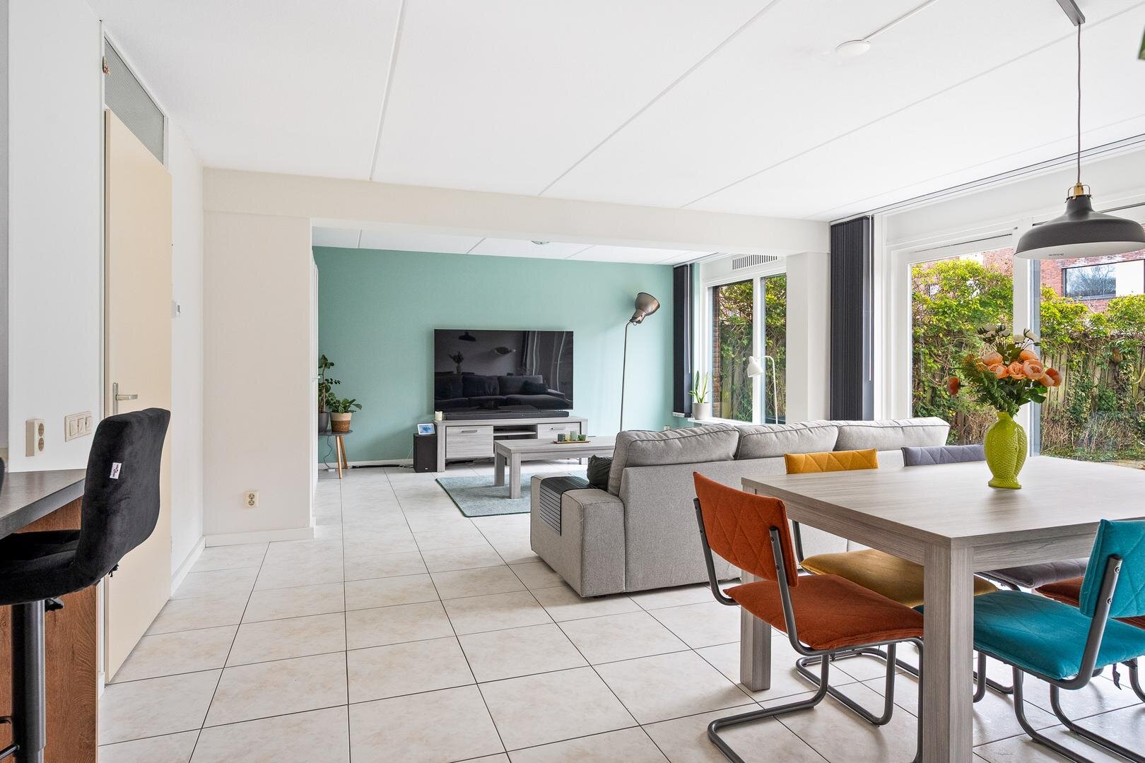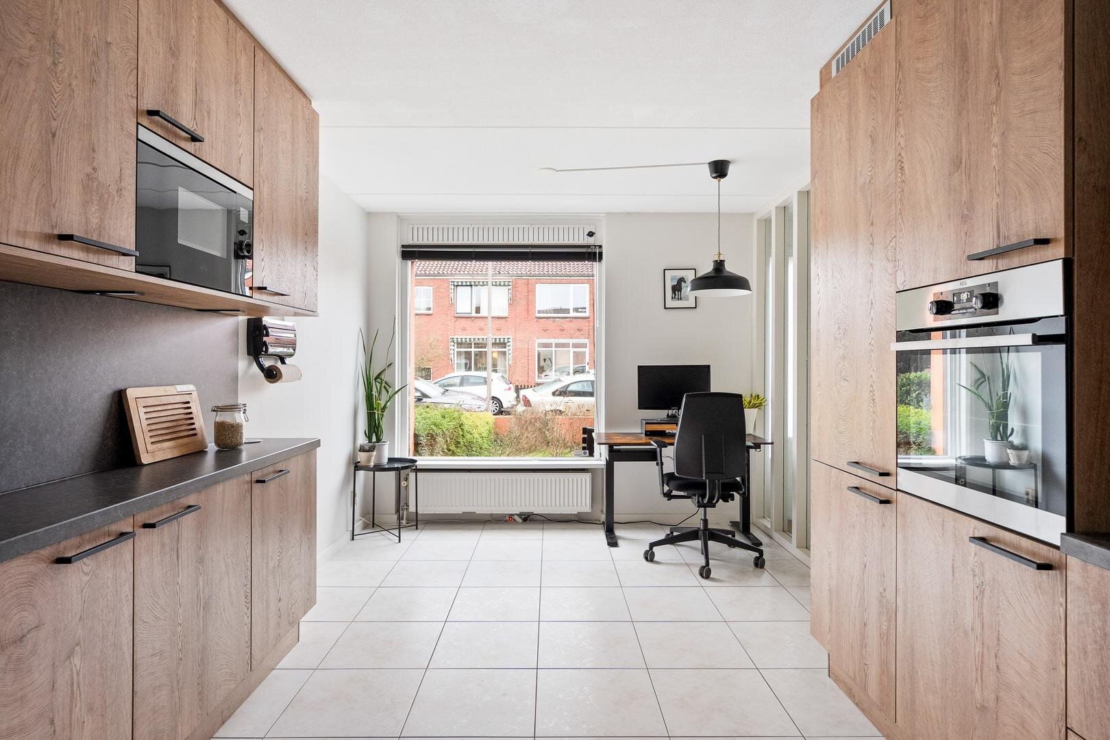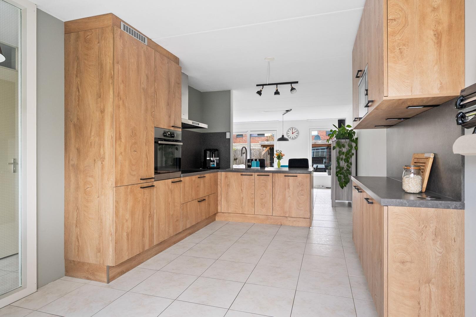 Je komt binnen in de hal met meterkast, trapopgang, praktische bergkast en een modern toilet met fonteintje. Vanuit de hal bereik je de voormalige garage, die nu in gebruik is als berging. De woonkamer bevindt zich aan de achterzijde en biedt een prettig uitzicht op de achtertuin. Dankzij de grote raampartijen valt hier veel daglicht naar binnen en via de schuifpui loop je zo de tuin in. De keuken (2021) is deel van de leefruimte door de open indeling en is uitgevoerd in hoekopstelling, voorzien van diverse inbouwapparatuur waaronder een inductie kookplaat, oven, magnetron, afzuigkap, vaatwasser, koelkast en vriezer.