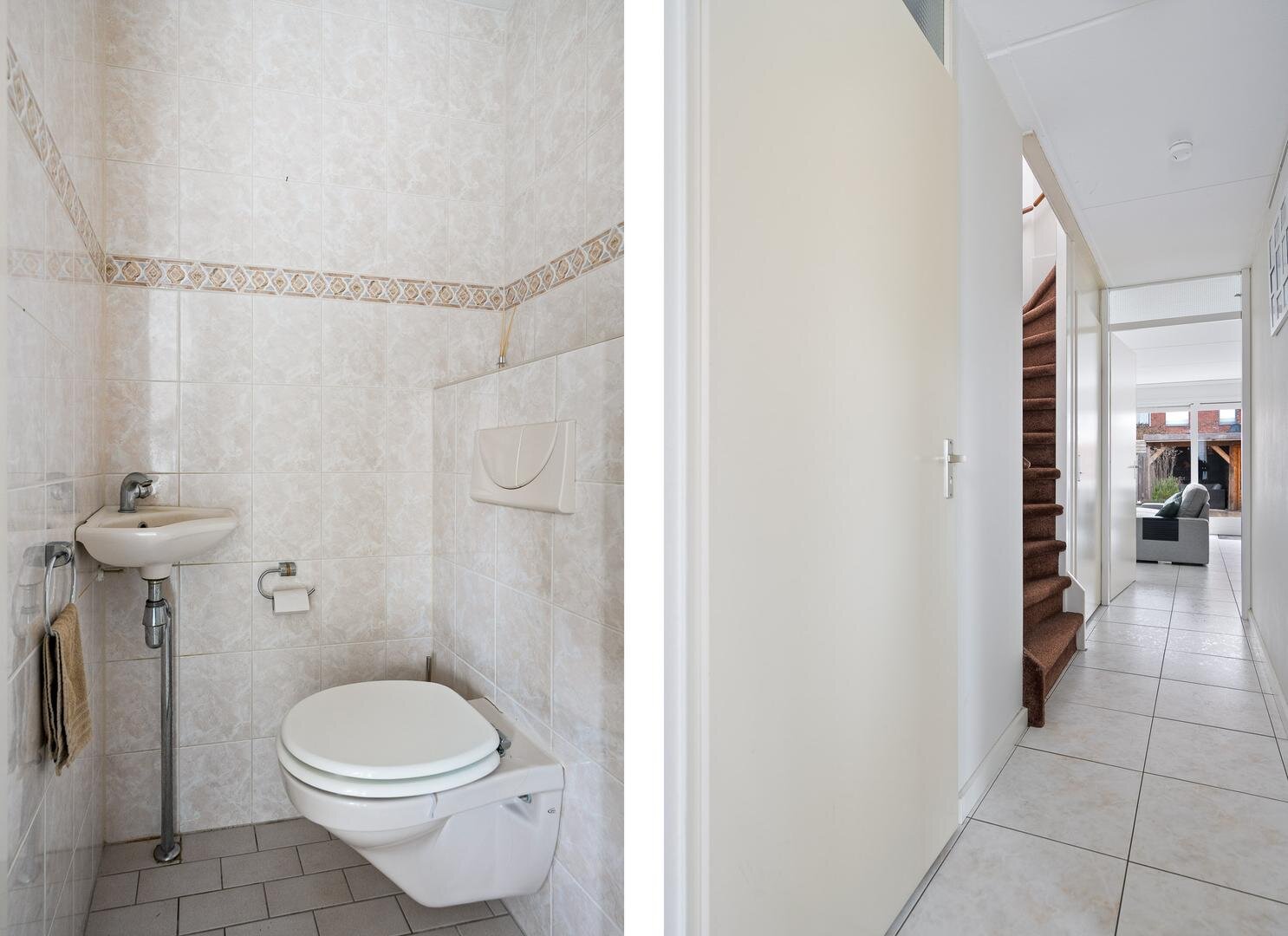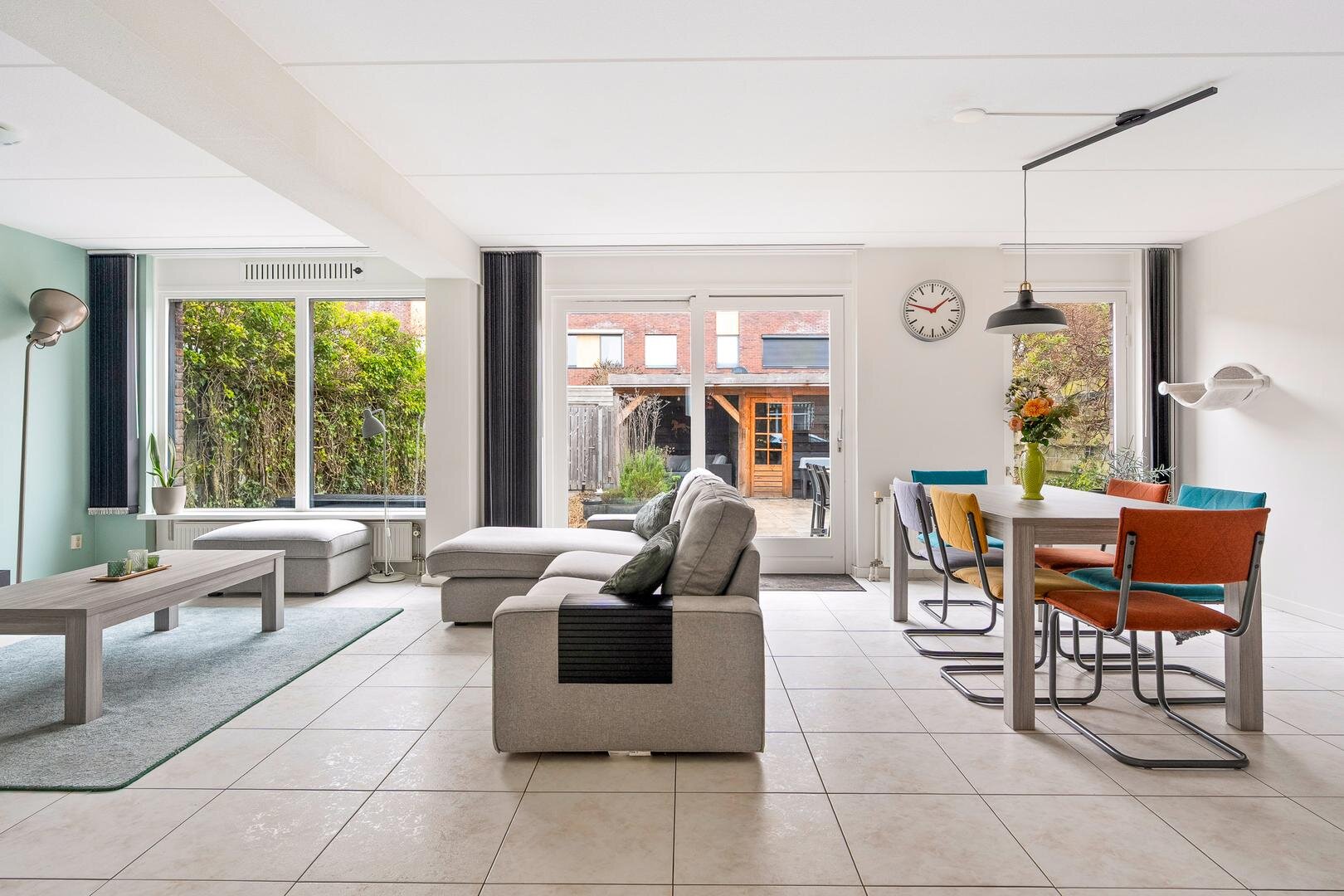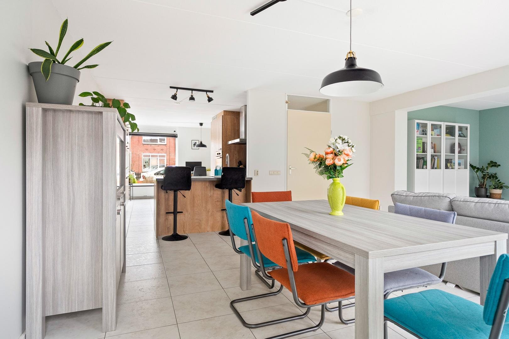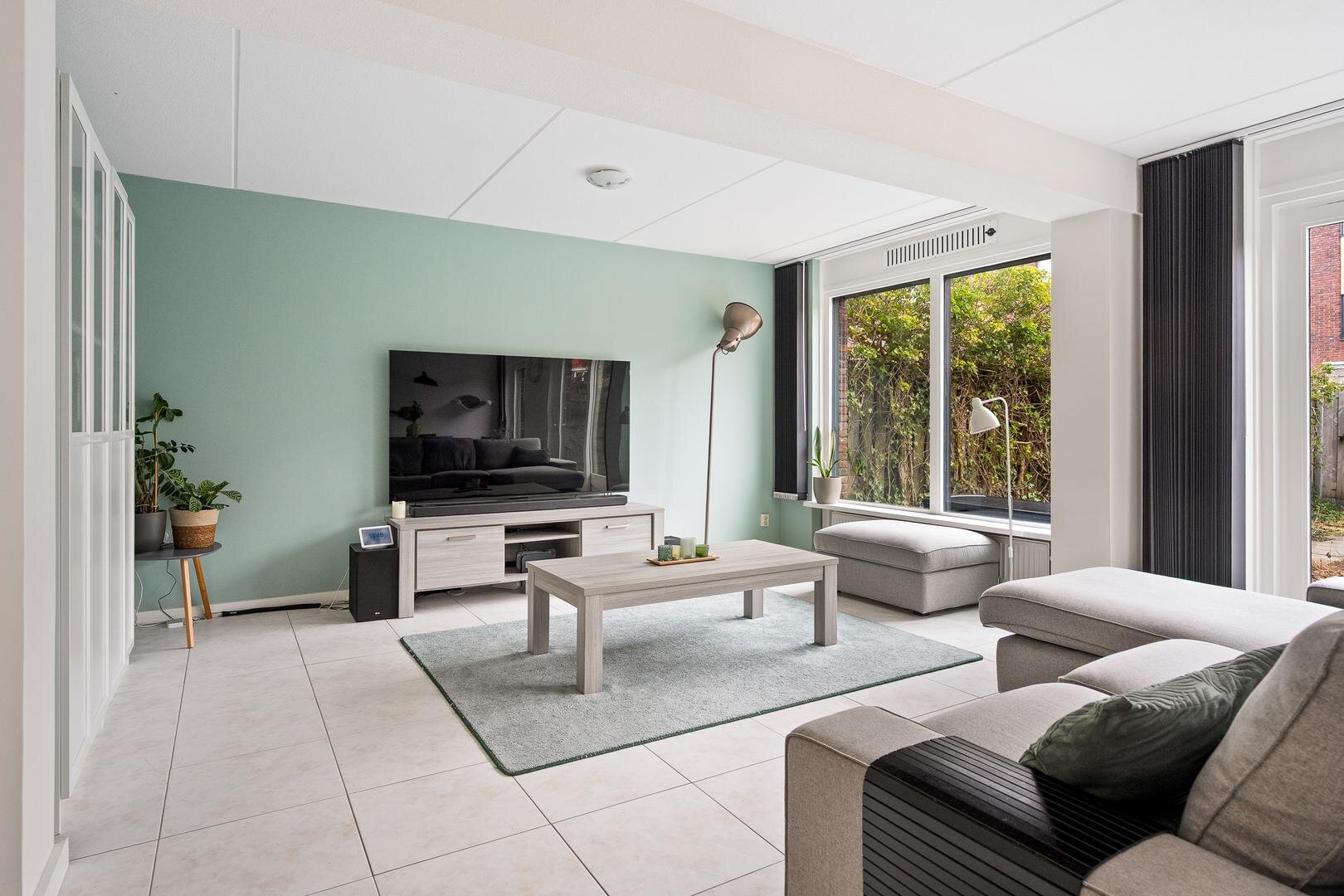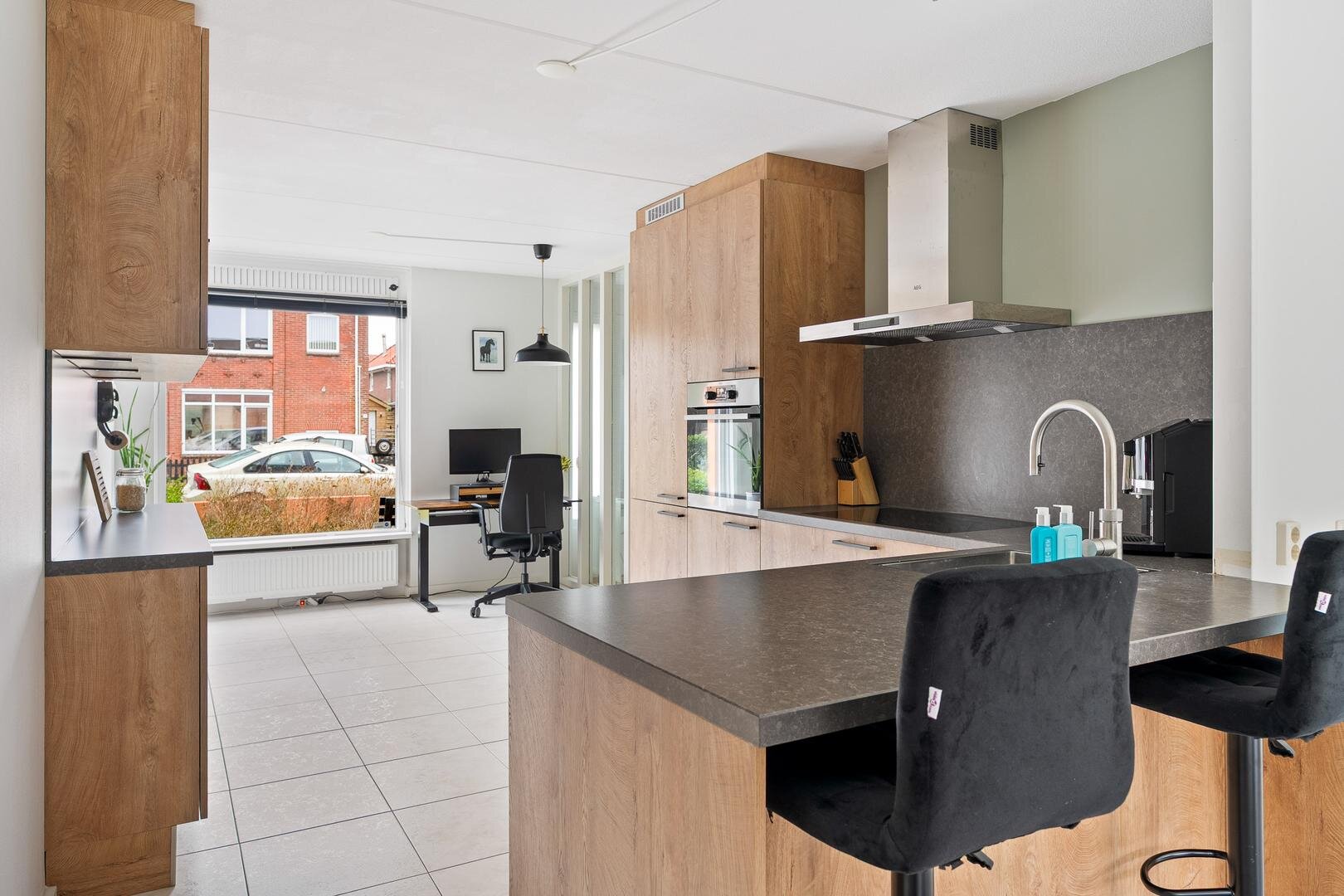 Je komt binnen in de hal met meterkast, trapopgang, praktische bergkast en een modern toilet met fonteintje. Vanuit de hal bereik je de voormalige garage, die nu in gebruik is als berging. De woonkamer bevindt zich aan de achterzijde en biedt een prettig uitzicht op de achtertuin. Dankzij de grote raampartijen valt hier veel daglicht naar binnen en via de schuifpui loop je zo de tuin in. De keuken (2021) is deel van de leefruimte door de open indeling en is uitgevoerd in hoekopstelling, voorzien van diverse inbouwapparatuur waaronder een inductie kookplaat, oven, magnetron, afzuigkap, vaatwasser, koelkast en vriezer.