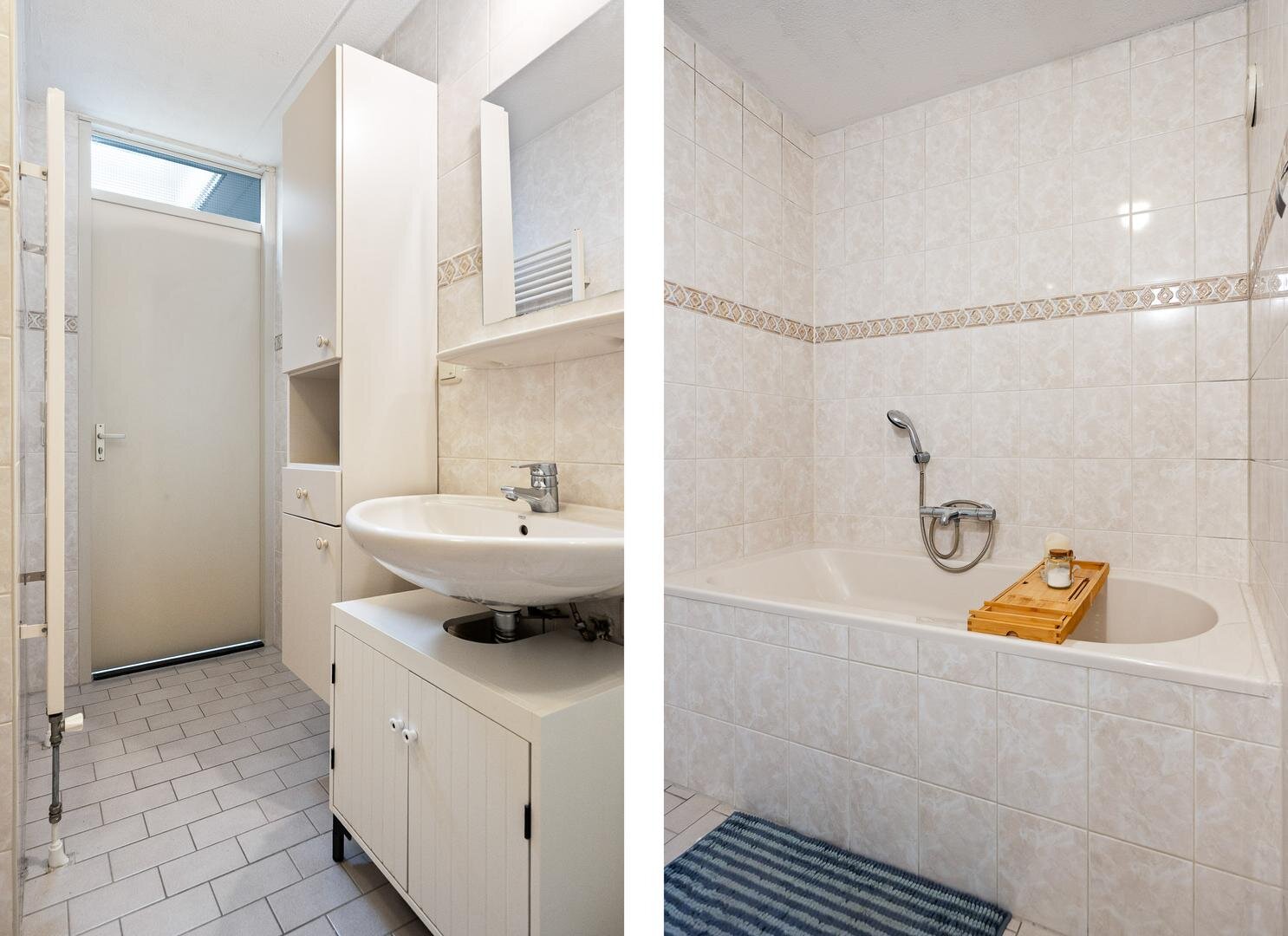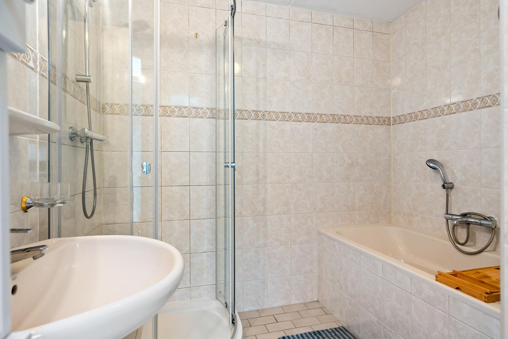 De badkamer is compleet ingericht met een ligbad, douche, wastafel en designradiator. Aan de voorzijde ligt een royale slaapkamer over de volledige breedte van de woning. Aan de achterzijde bevinden zich twee slaapkamers met uitzicht op de tuin.