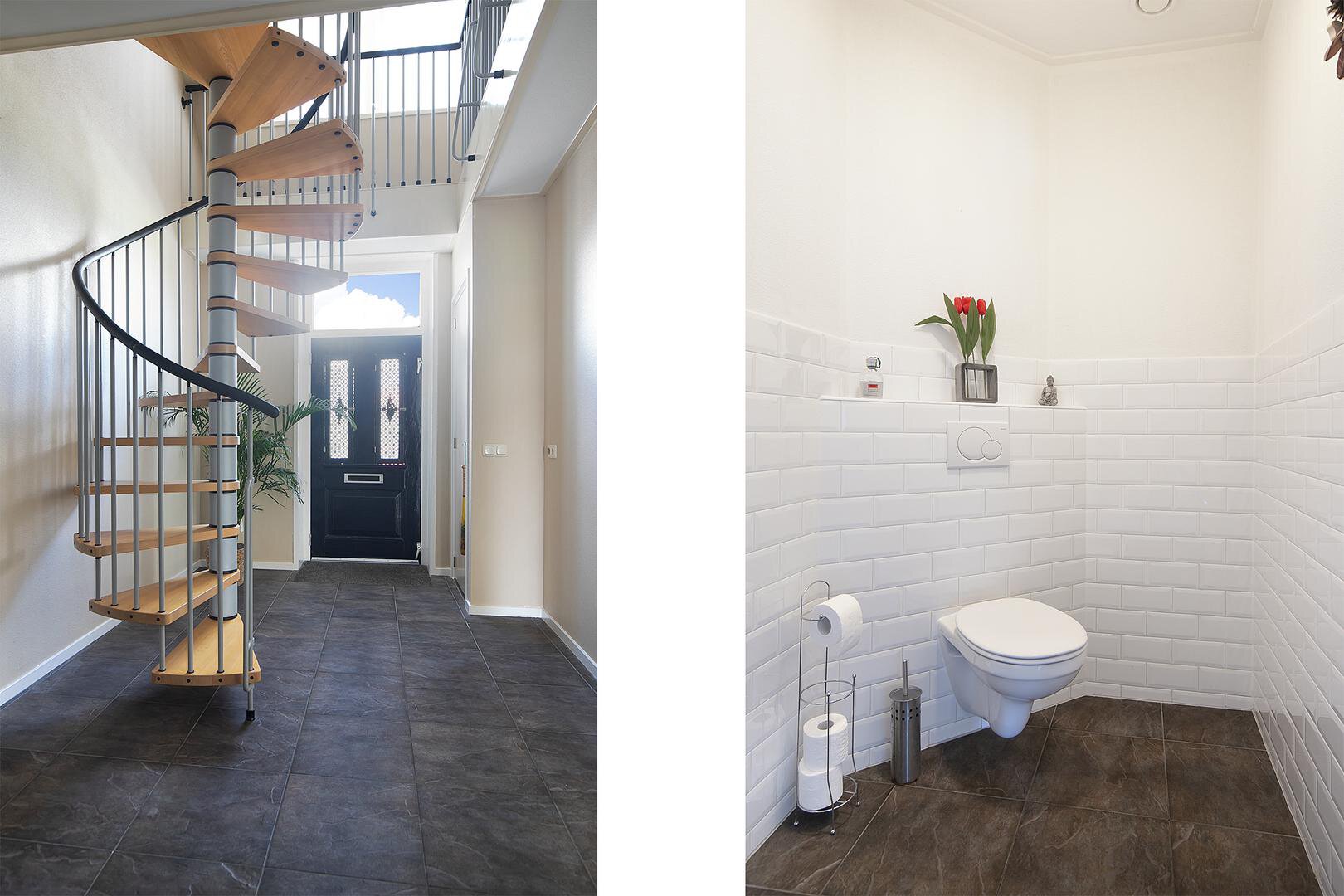 Via de entree aan de voorzijde kom je binnen in de hal, waar zich ook de meterkast bevindt. De riante en sfeervolle woonkamer heeft openslaande deuren naar het terras en is voorzien van meerdere inbouwspots in het plafond, waardoor een aangename sfeer wordt gecreëerd. De open keuken beschikt over een moderne keukenopstelling met inbouwapparatuur en een kookeiland. Verder is er een handige wasruimte met de cv-opstelling (Remeha hr-ketel uit 2021) en wasmachineaansluiting, een bijkeuken met achterom en een uitstortgootsteen, en een slaapkamer met aangrenzende badkamer voorzien van een douche, wastafel en designradiator. De wanden en plafonds op de begane grond zijn strak gestuukt en geschilderd. De vloer op de begane grond is betegeld en volledig voorzien van vloerverwarming, behalve in de slaapkamer.