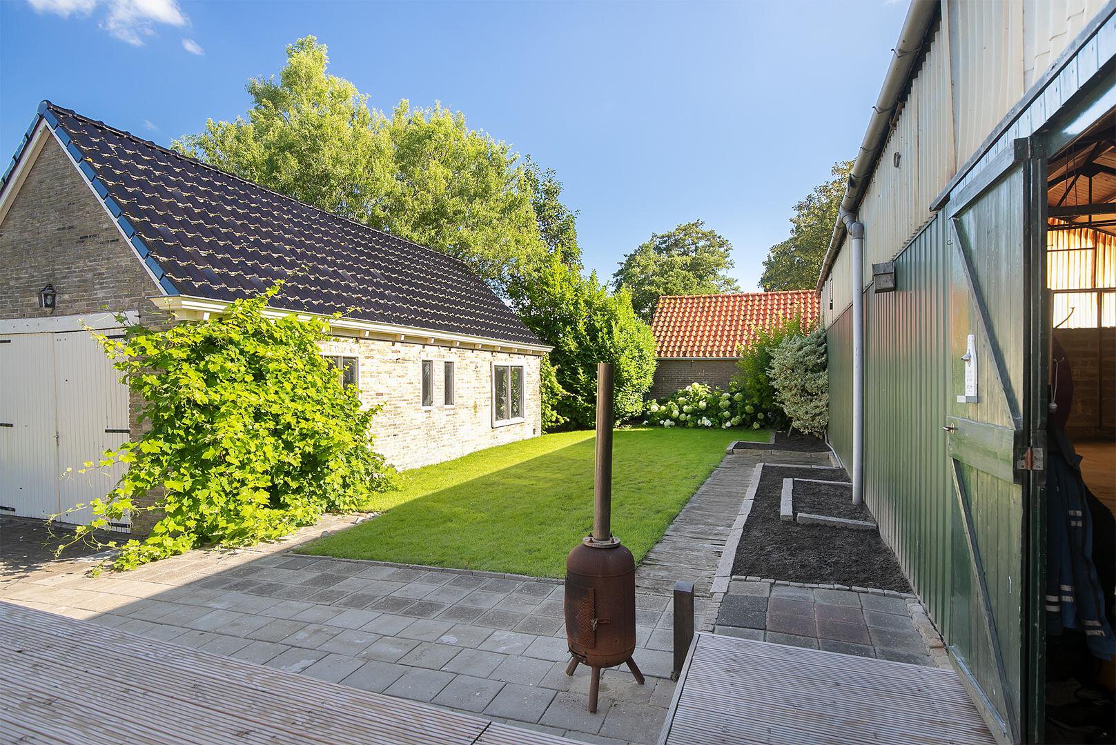 Op het perceel staan een vrijstaande stenen garage met zwart geglazuurde dakpannen, opgetrokken uit Friese geeltjes. Daarnaast is er een ruime loods met een dak bedekt met ABC golfplaten, waarvan de wanden deels zijn bekleed met damwandprofielplaten. De loods heeft een afmeting van circa 17,75 bij 9,90 meter en beschikt over een betonnen vloer.
