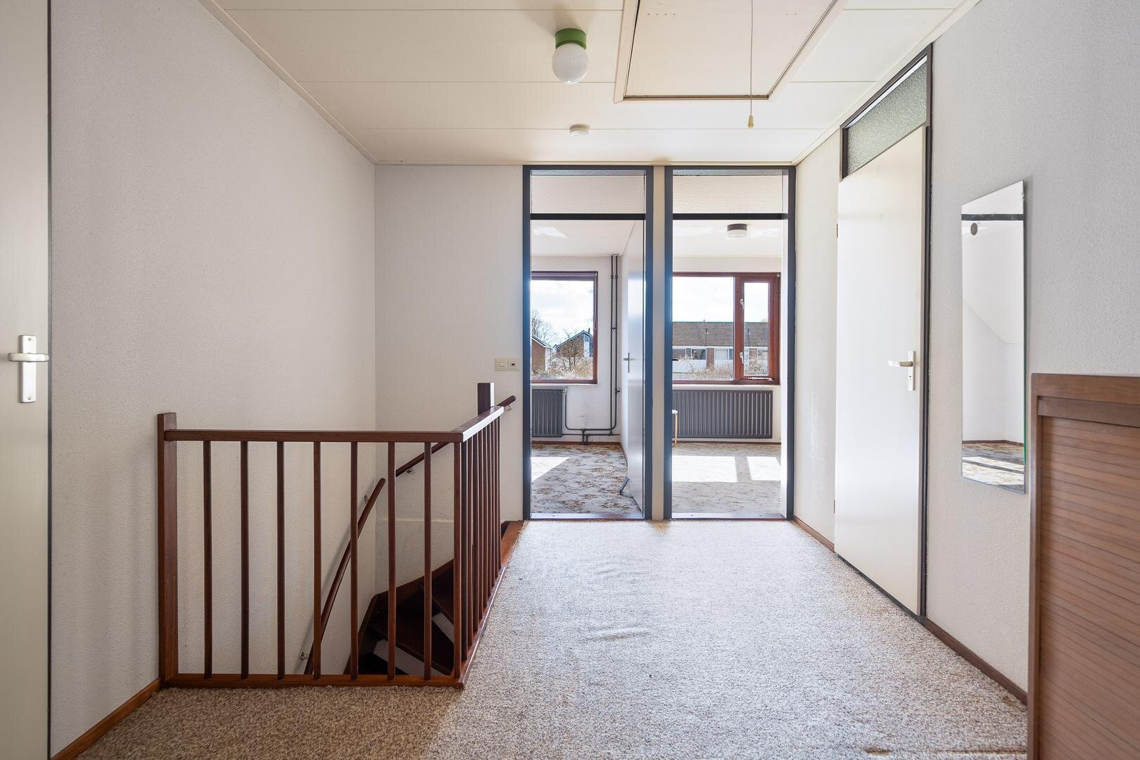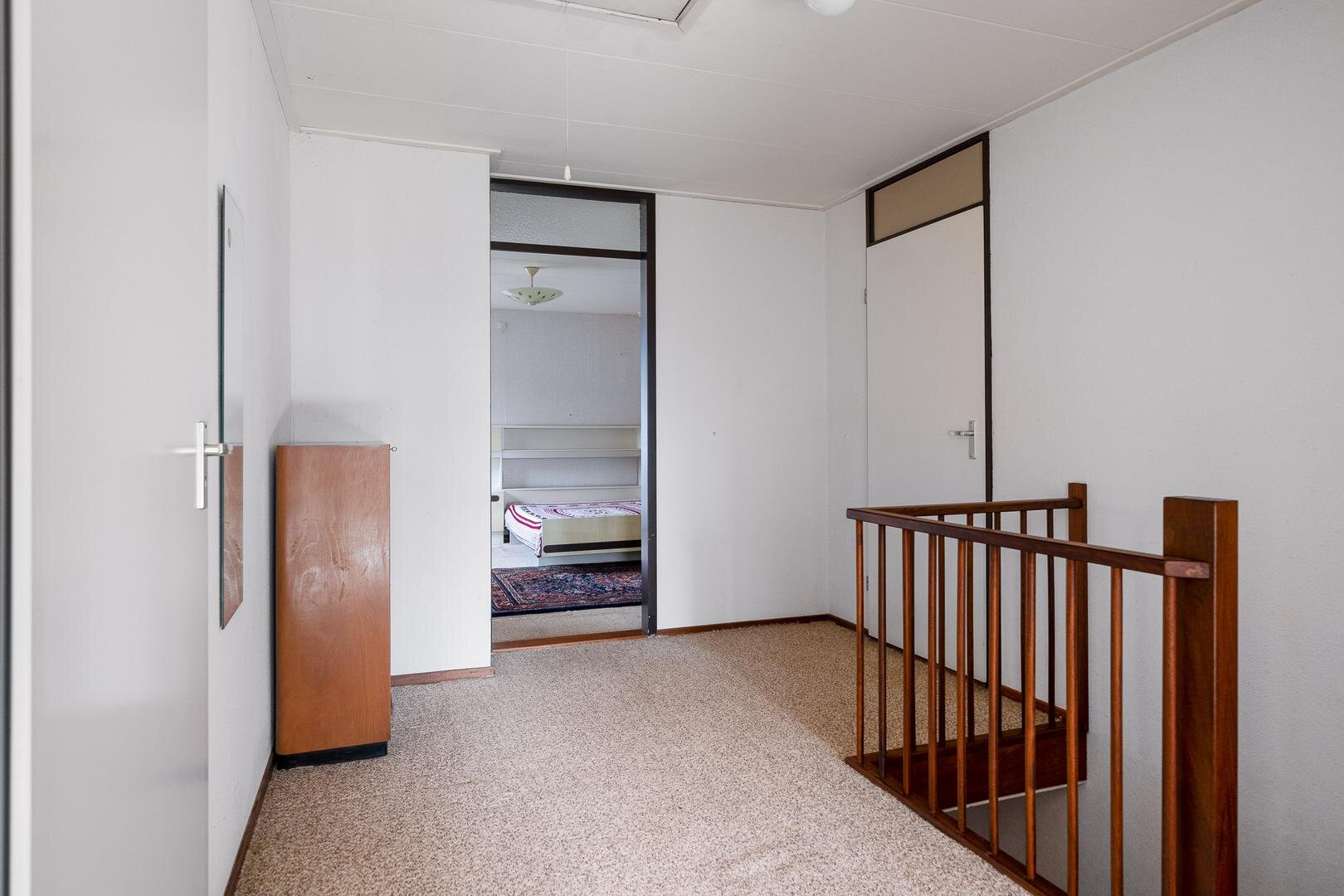 Overloop met toegang tot drie ruime slaapkamers. De master bedroom aan de voorzijde is royaal opgezet (circa 19 m²). De badkamer is gedateerd en voorzien van een ligbad, wastafel en toilet.