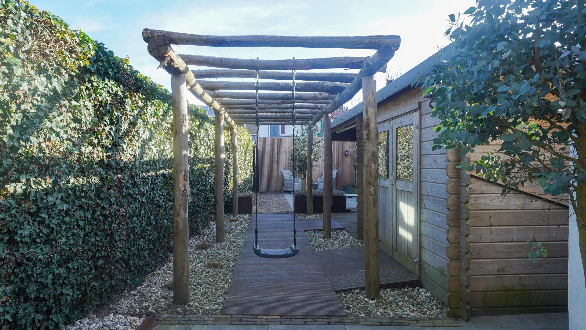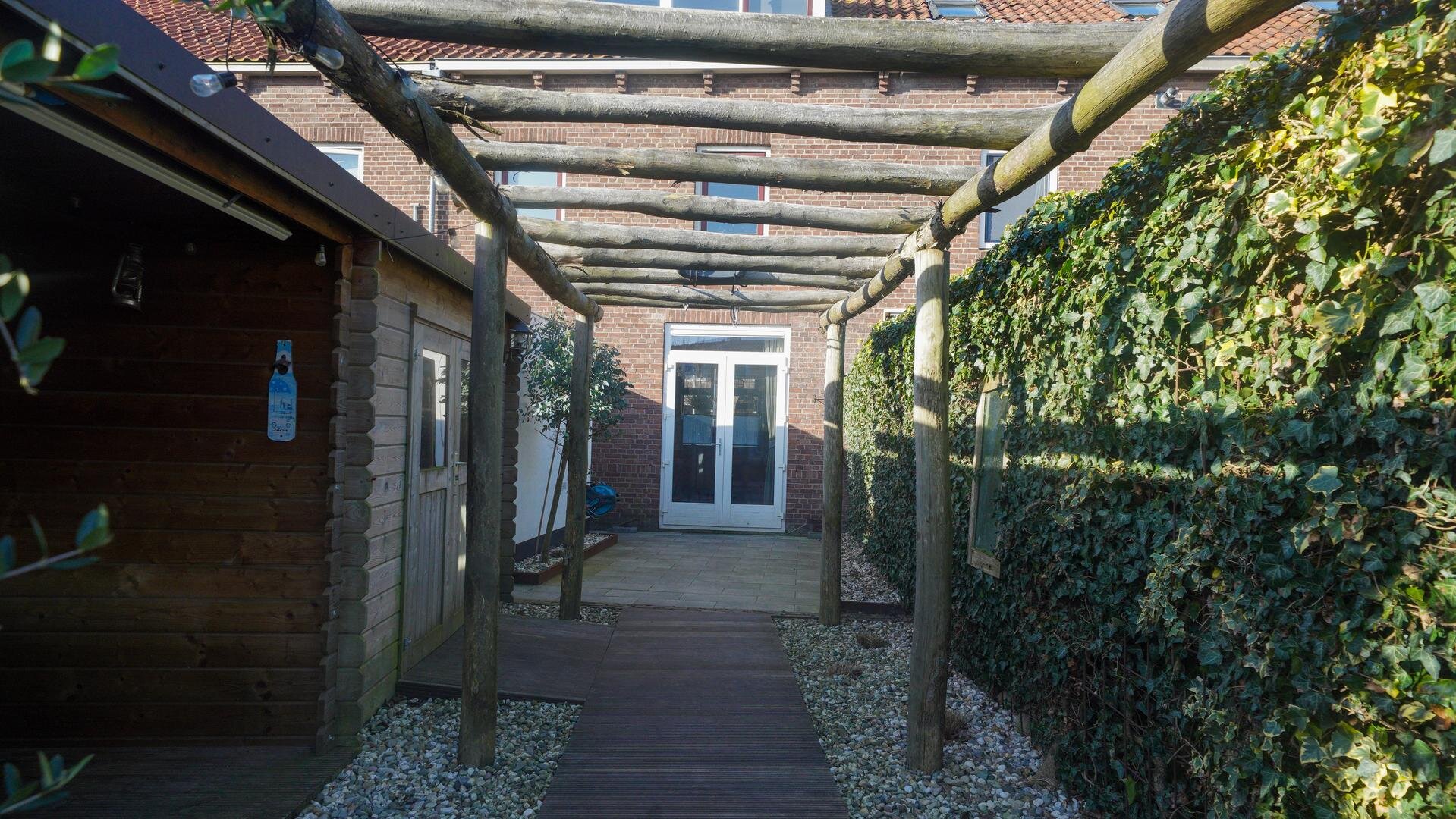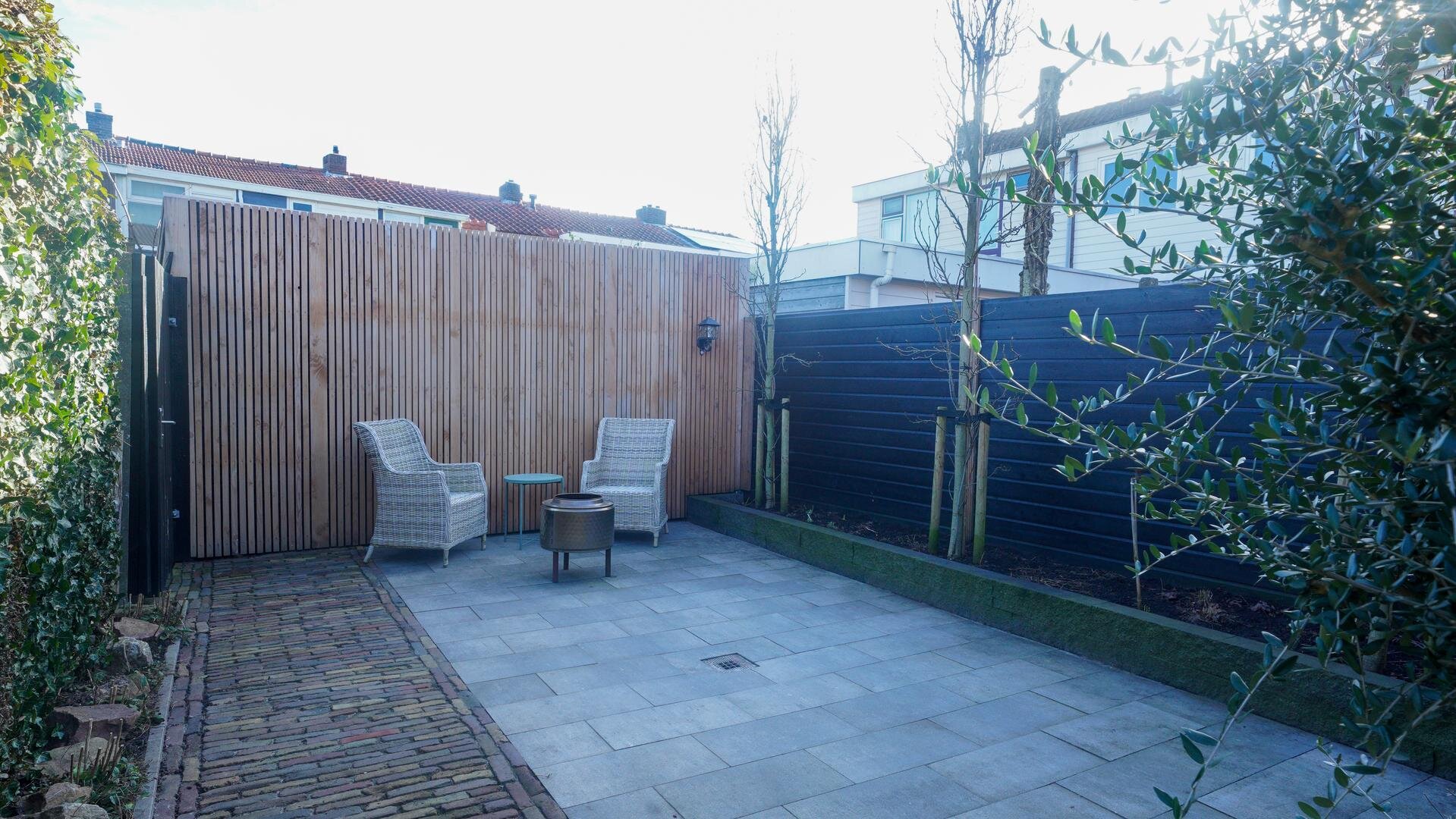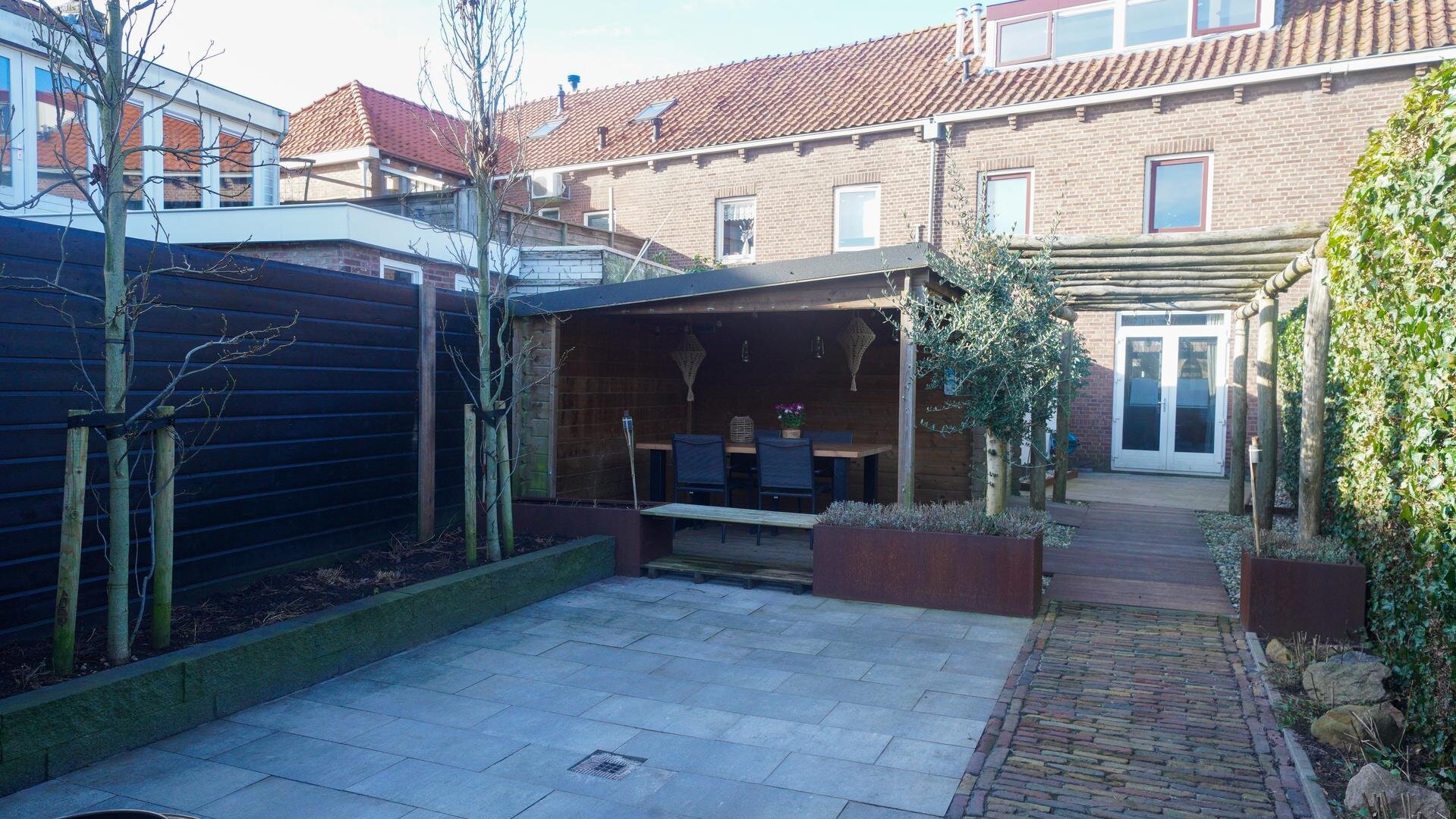 Aan de voorzijde ligt een verzorgde tuin met beplanting. De achtertuin is recent volledig vernieuwd en onder architectuur aangelegd. Hierdoor is een stijlvolle en praktische buitenruimte ontstaan met meerdere terrassen en een overdekte loungeplek waar je in alle rust kunt genieten. De tuin biedt veel privacy en is tevens via een achterom bereikbaar. In het midden van de tuin staat een houten berging.