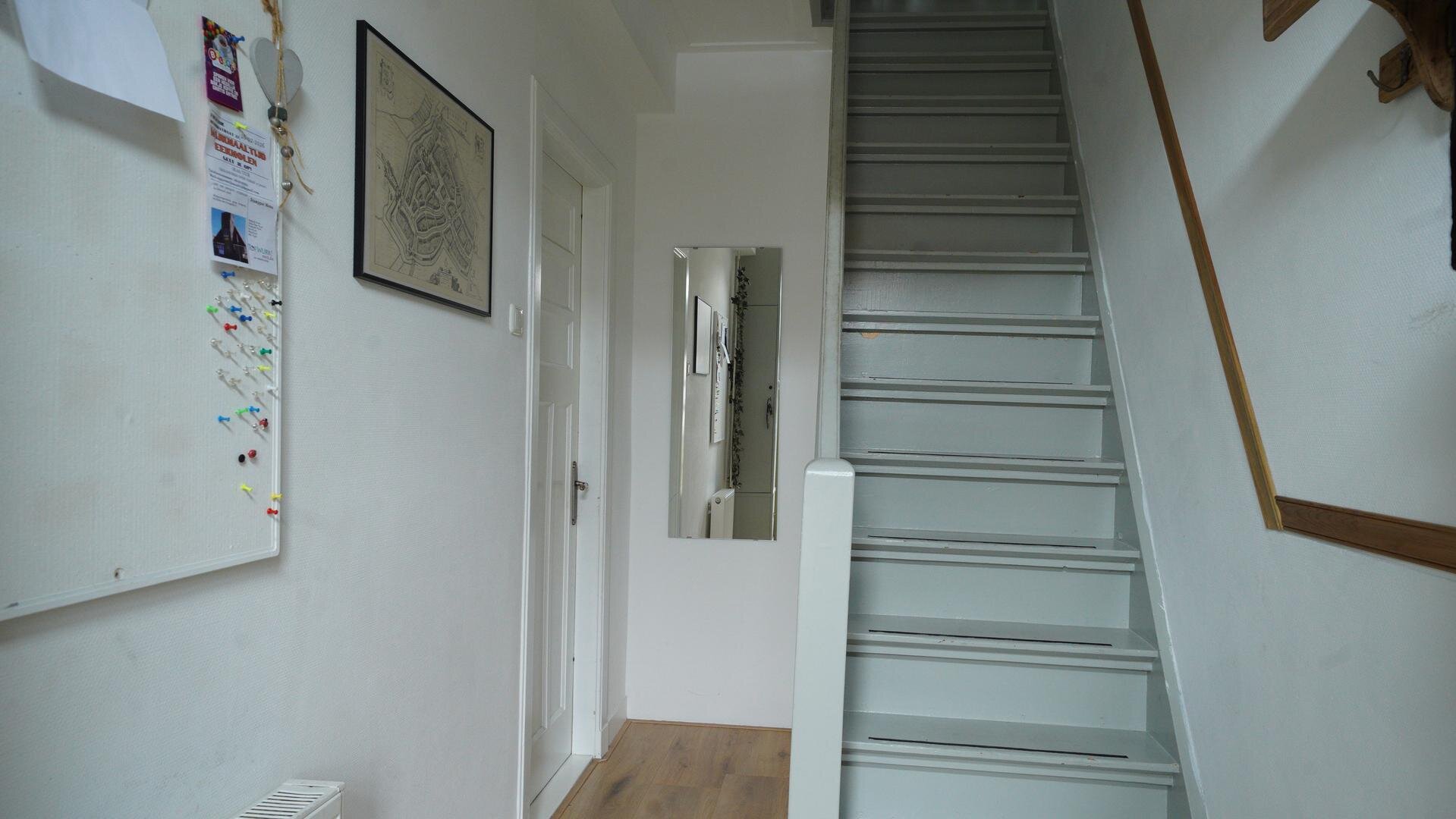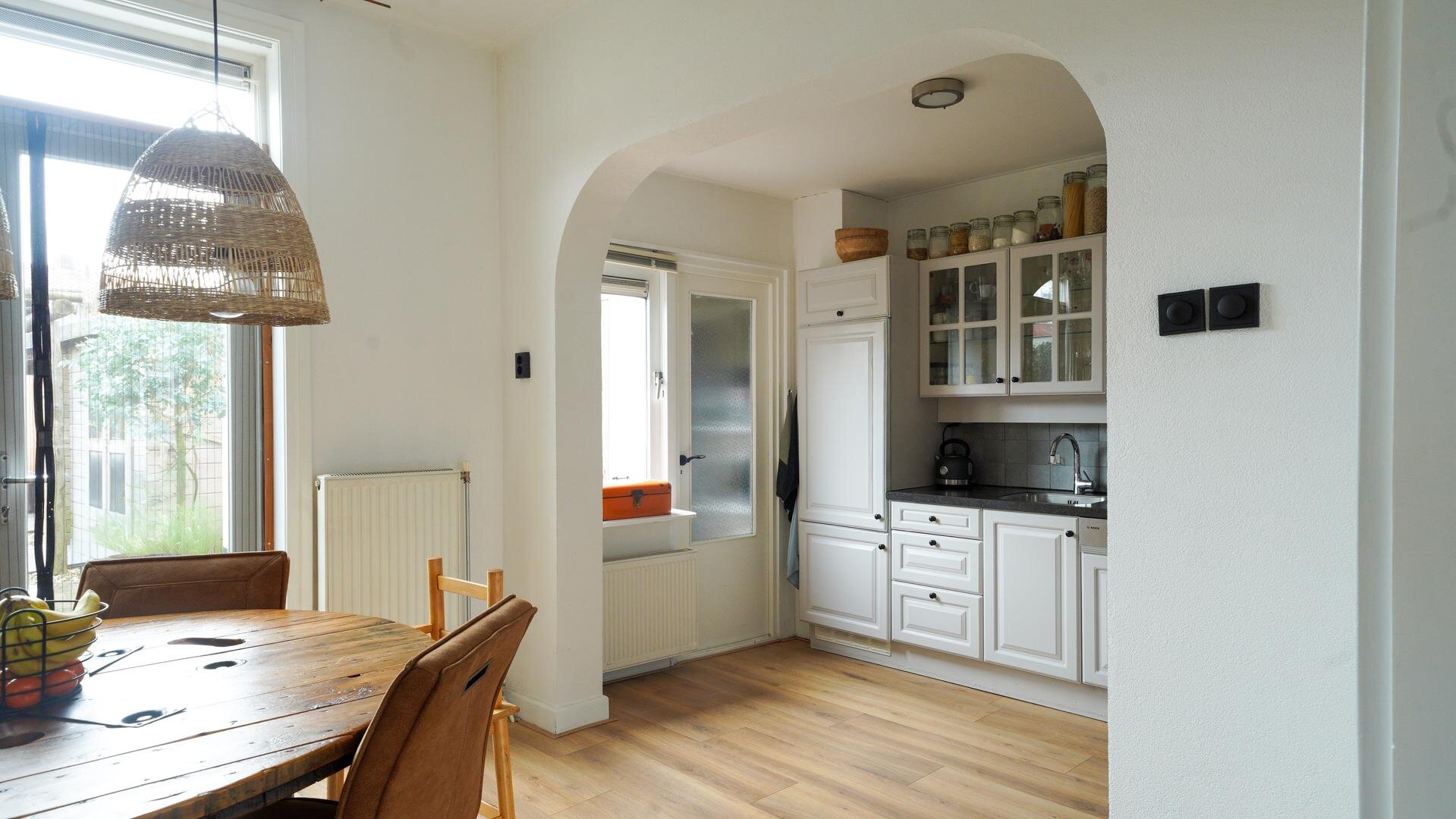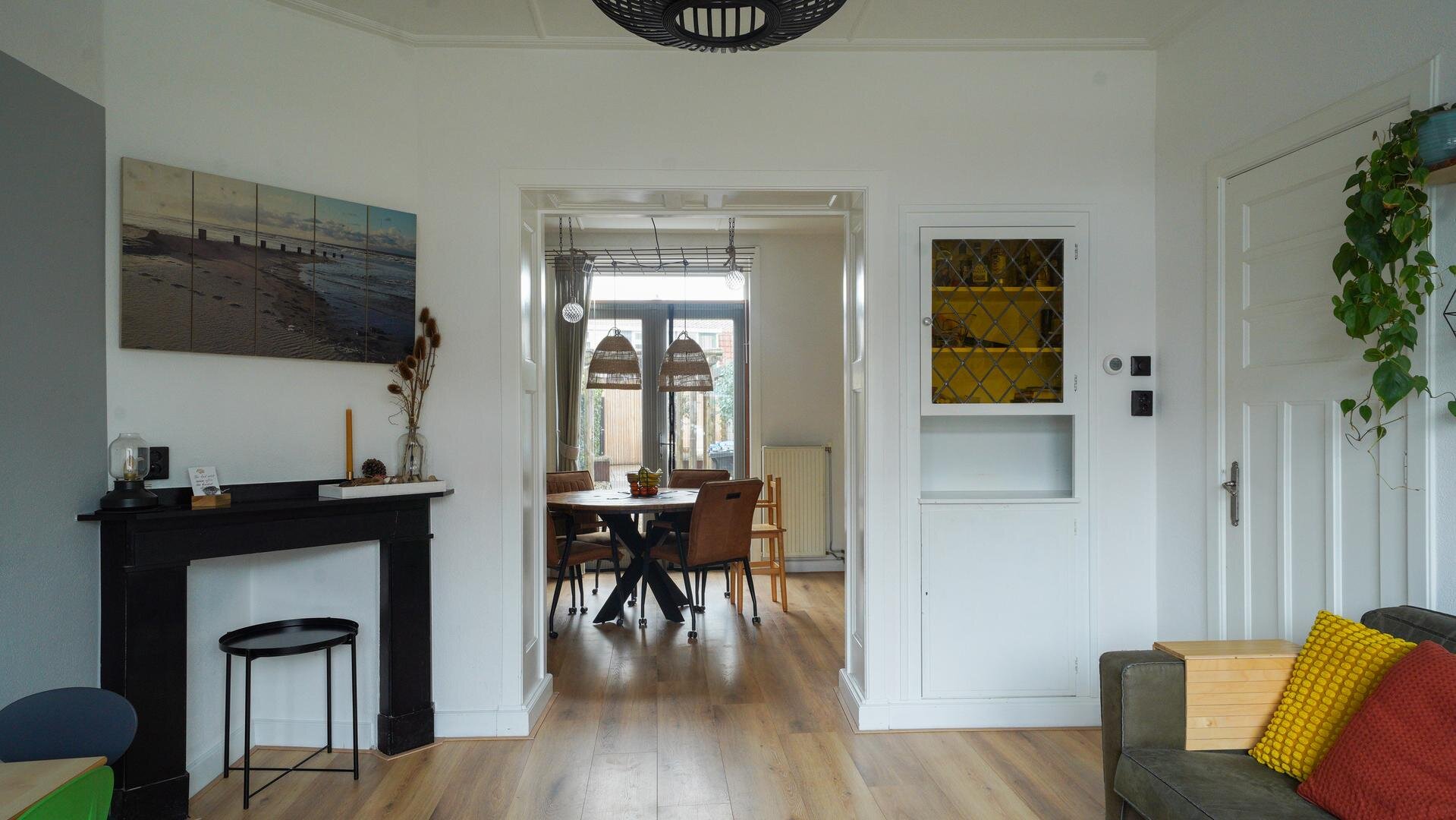 Via de entree kom je in de hal met trapopgang, meterkast en praktische trapkast. De lichte woonkamer heeft een prettige indeling en staat in verbinding met de ruime keuken, die is voorzien van diverse inbouwapparatuur. Vanuit de achterkamer openen de tuindeuren naar de achtertuin, waardoor binnen en buiten mooi in elkaar overlopen.