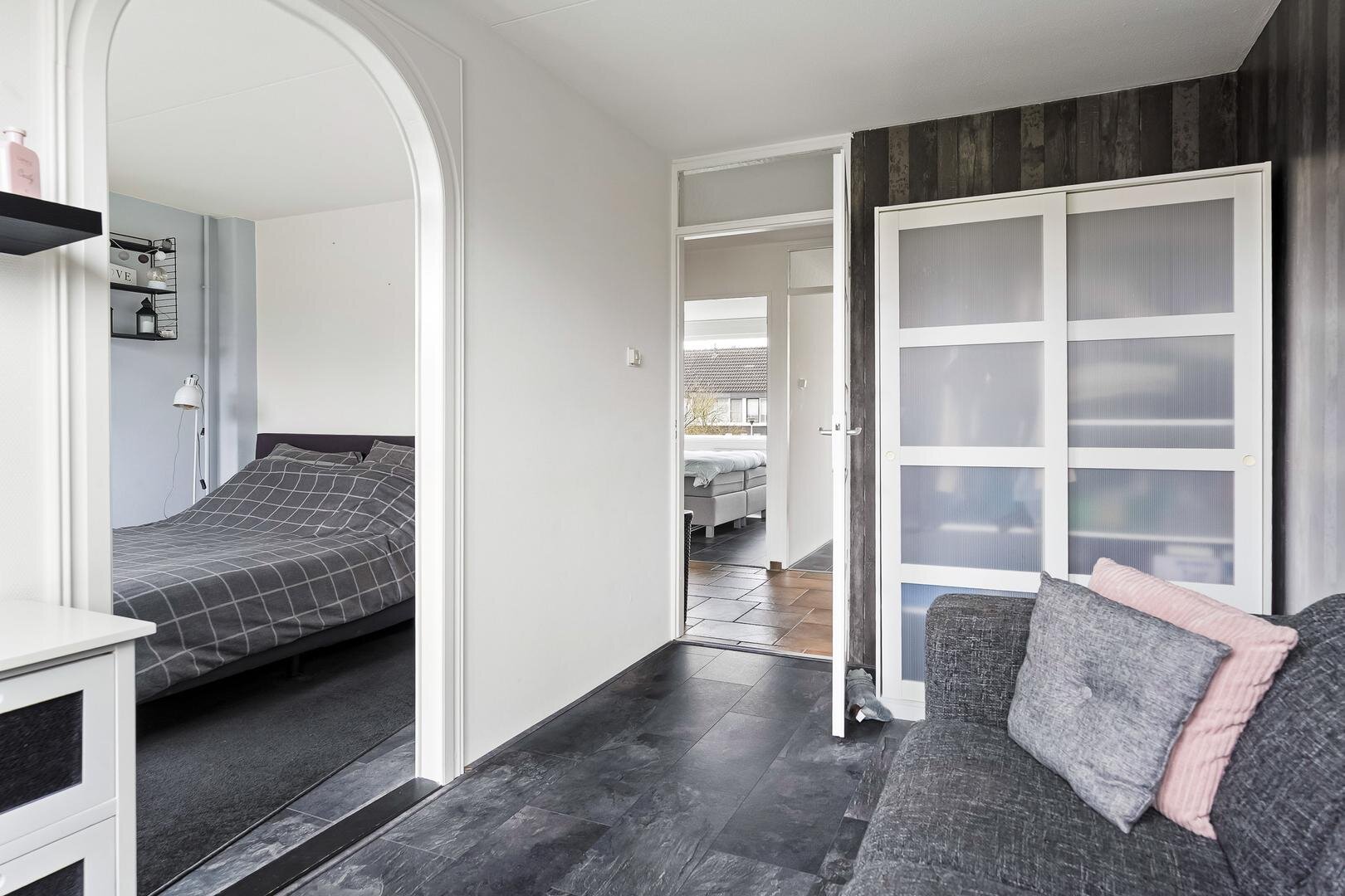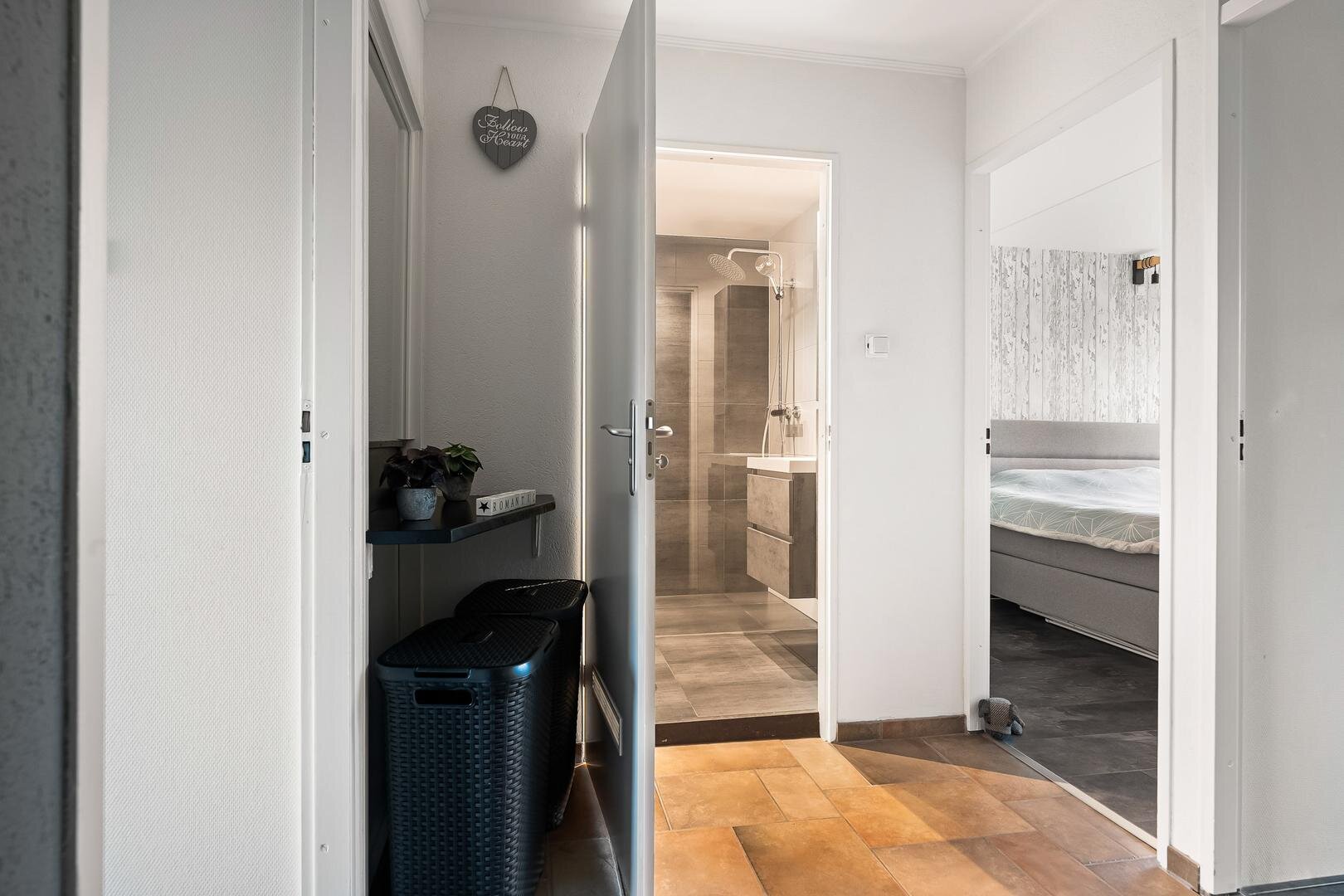 De overloop geeft toegang tot drie slaapkamers. Een royale werk- of studeerkamer, die eenvoudig weer is op te splitsen in twee aparte kamers. Twee slaapkamers ook voorzien van laminaatvloer. De moderne badkamer is ingericht met een ruime douche, wastafel en tweede toilet.