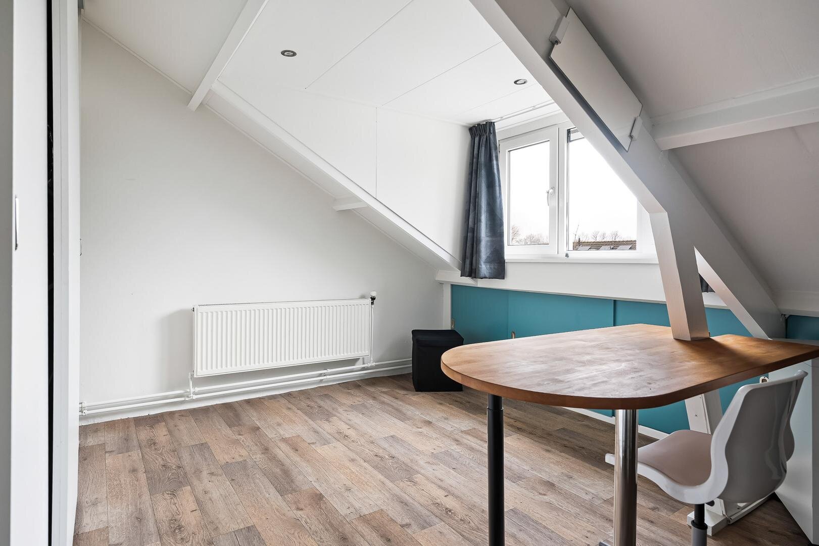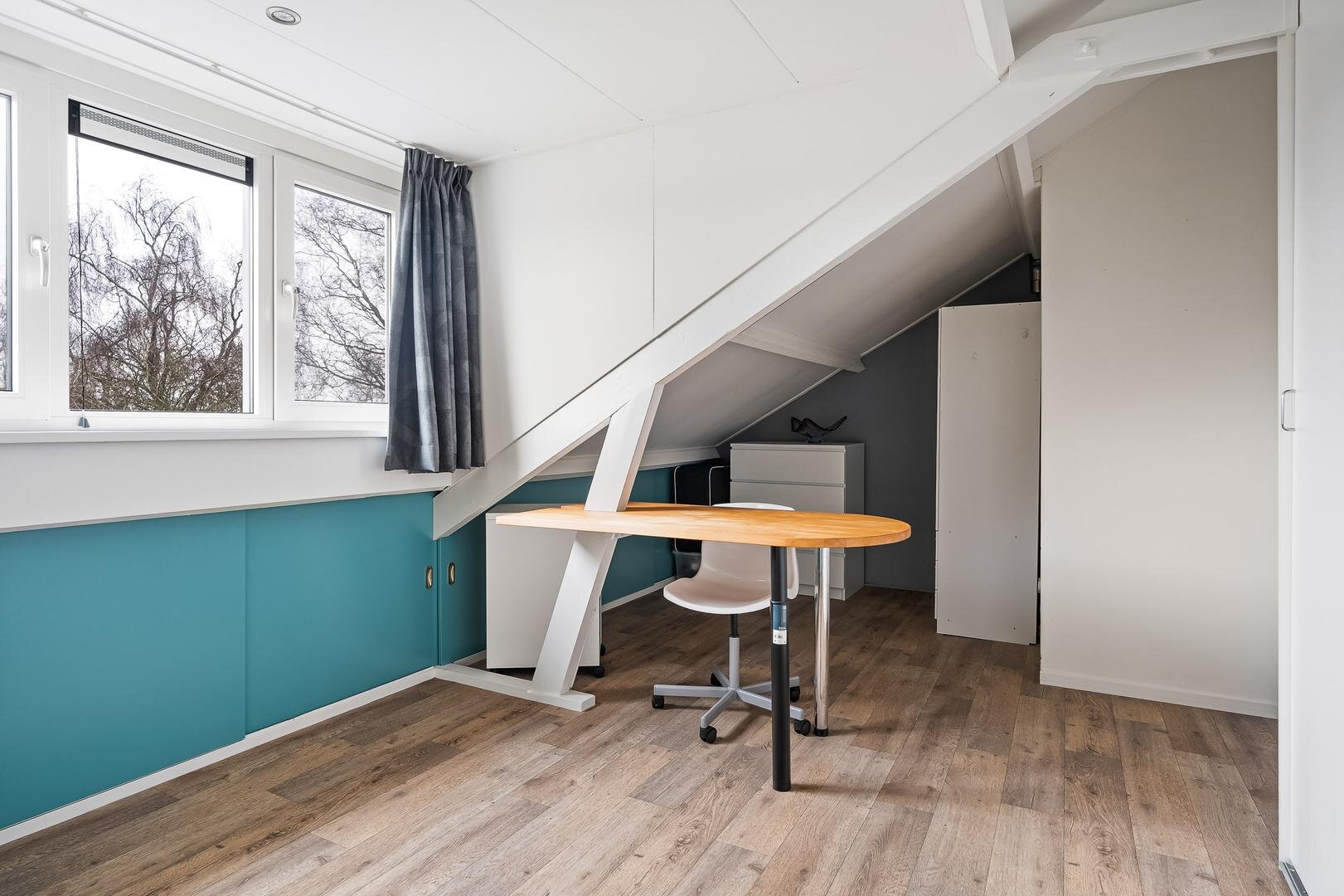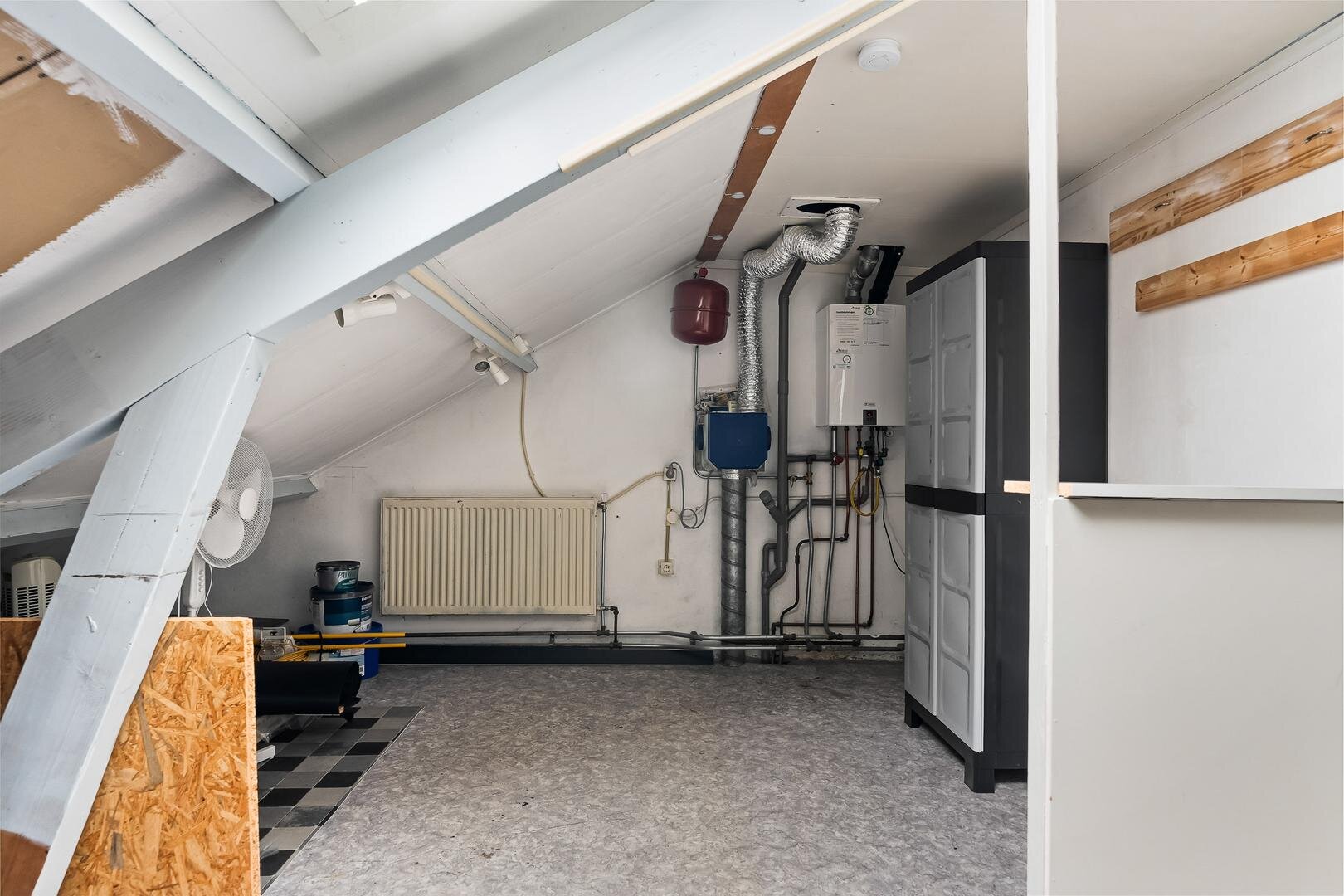 Via een vaste trap bereik je de overloop en de volwaardige zolderverdieping met de CV-ketel. Hier vind je een comfortabele slaapkamer met vaste kasten en een kunststof dakkapel en daarnaast een grote hobbyruimte met dakraam.