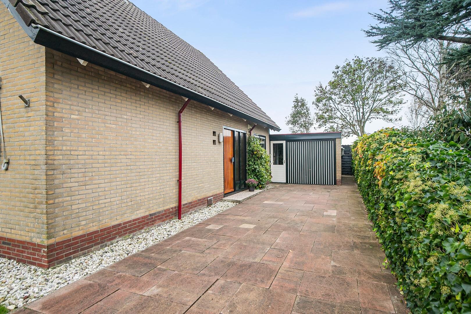 Er is een houten buitenberging met overkapping.