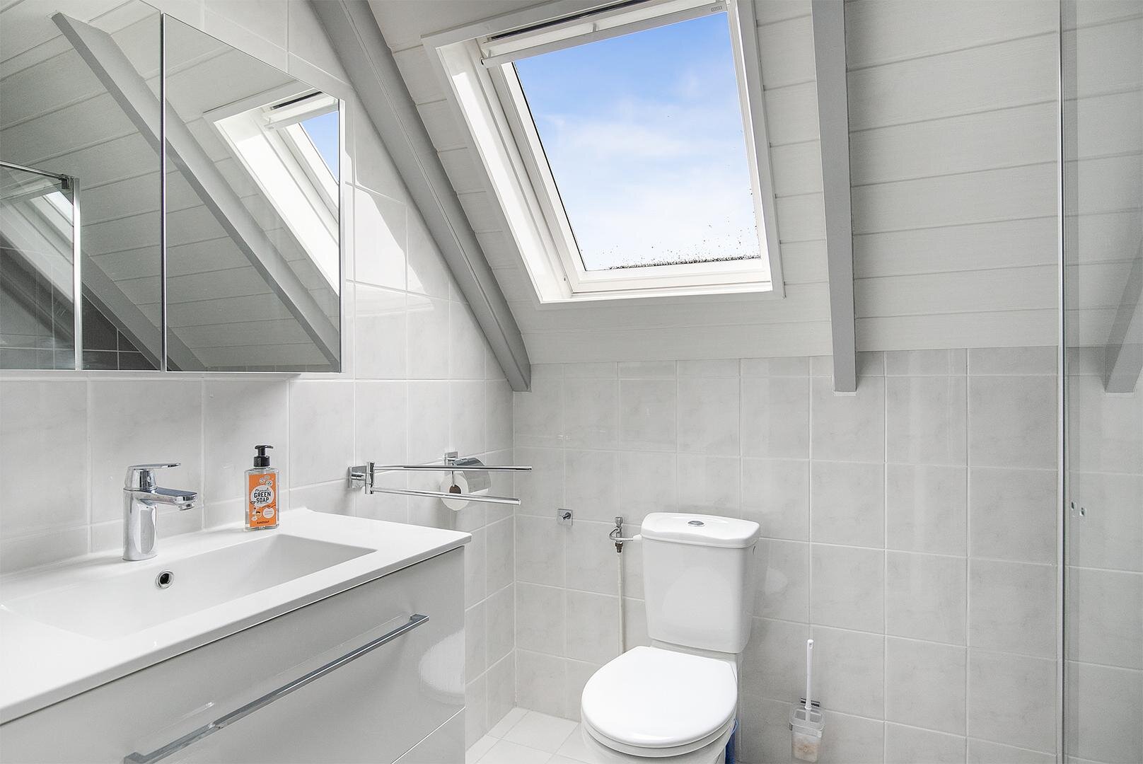 De badkamer is voorzien van een douche, 2e toilet en wastafel meubel.
