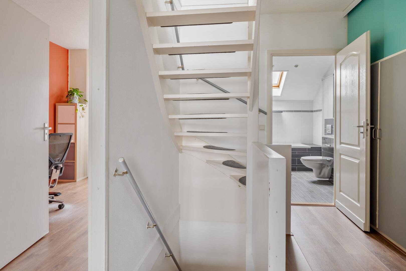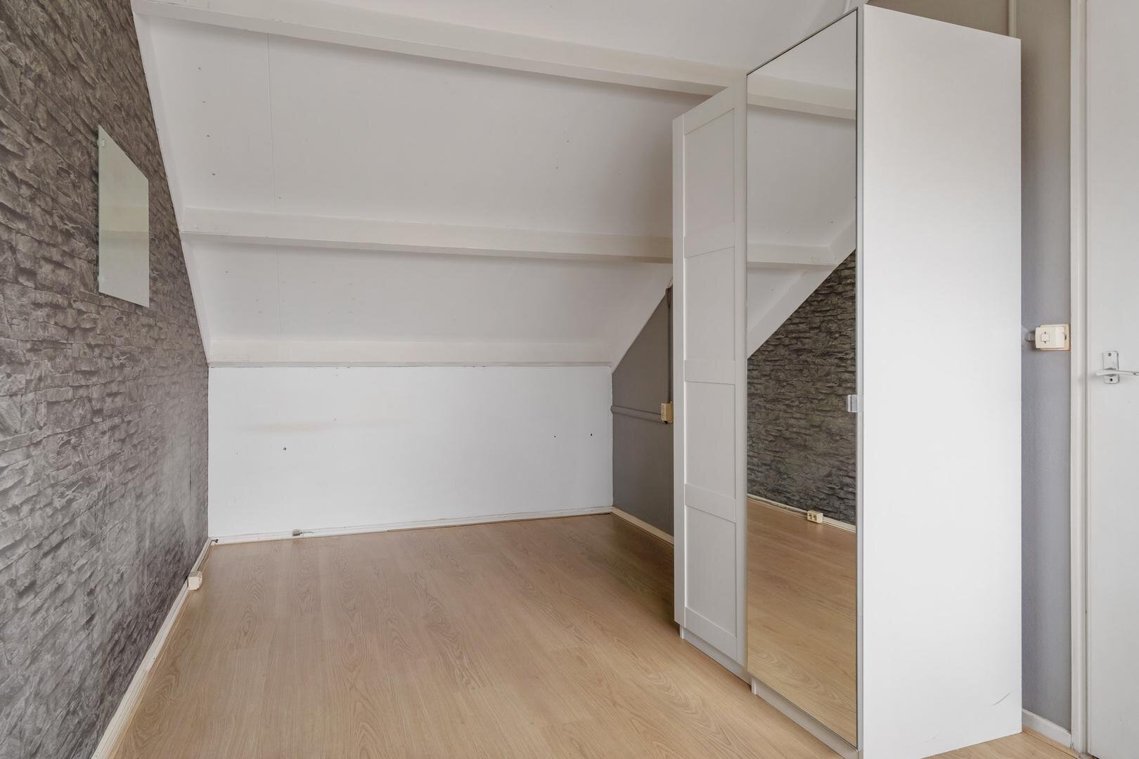 Op de eerste verdieping bevindt zich een ruime overloop met vaste kasten, drie royale slaapkamers en een uitgebouwde badkamer. Deze is compleet ingericht met een ligbad, douchecabine, wastafelmeubel en een tweede toilet. Via een vaste trap bereik je de zolderverdieping, waar zich de vierde slaapkamer, extra bergruimte en de technische ruimte bevinden.