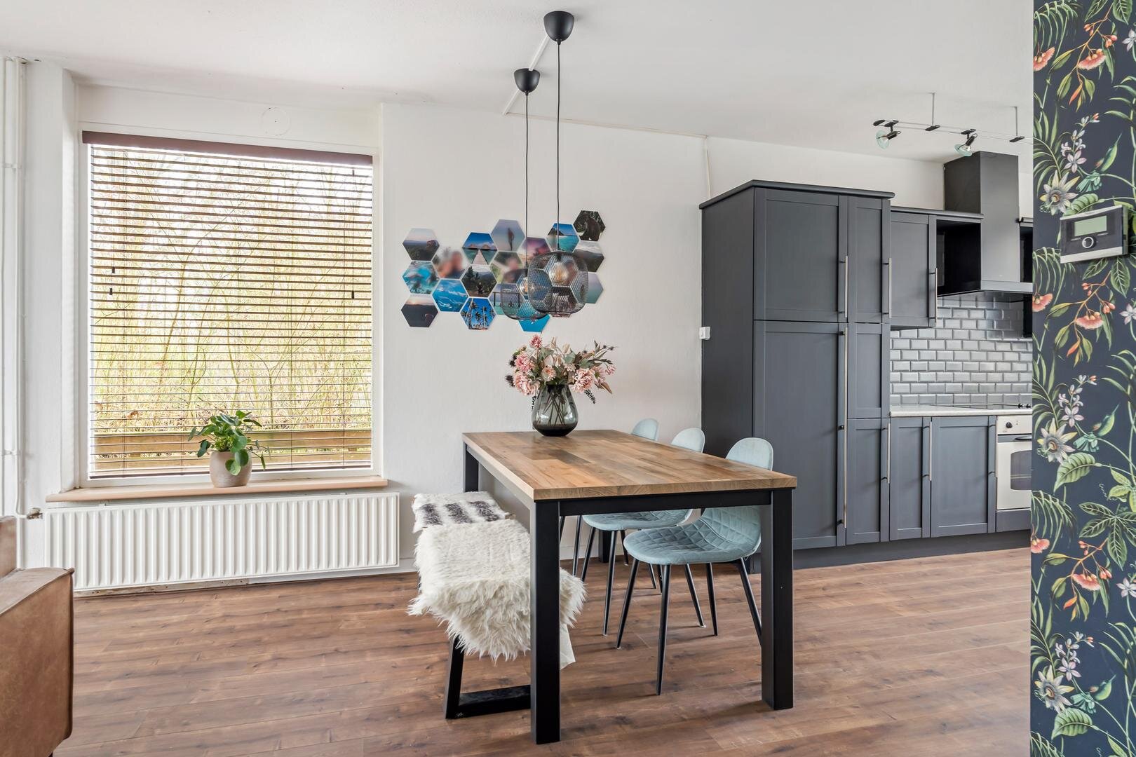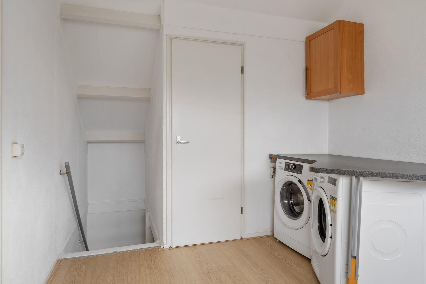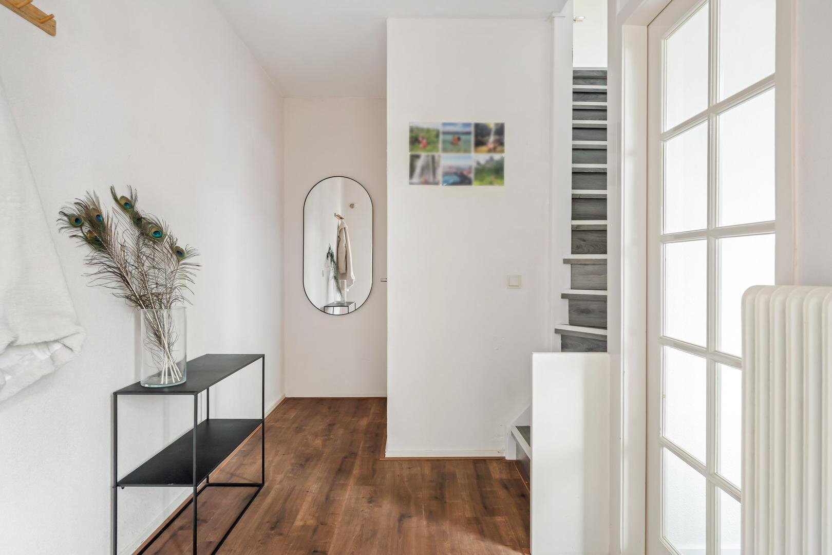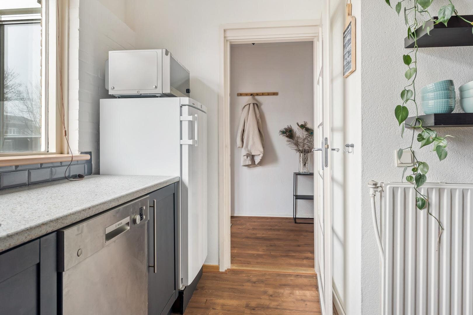 De lichte woonkamer beschikt over meerdere raampartijen en is afgewerkt met een fraaie laminaatvloer. De open keuken in hoekopstelling is voorzien van moderne inbouwapparatuur en heeft een prettig raam boven het werkblad. Vanuit de woonkamer stap je aan de achterzijde zo de tuin in, waardoor binnen en buiten op een natuurlijke manier met elkaar worden verbonden. De entree op de begane grond is vergroot en staat in directe verbinding met de praktische stenen berging.